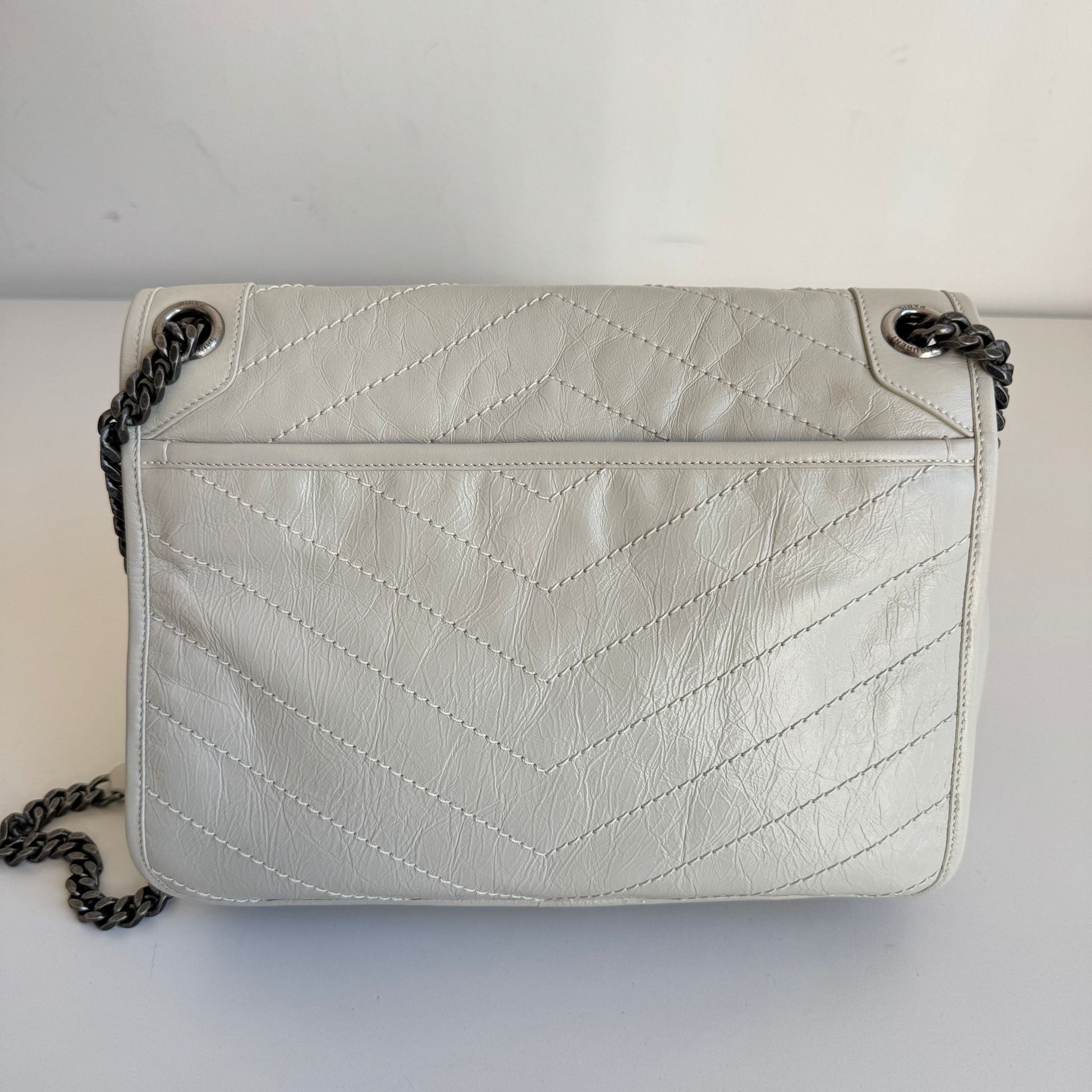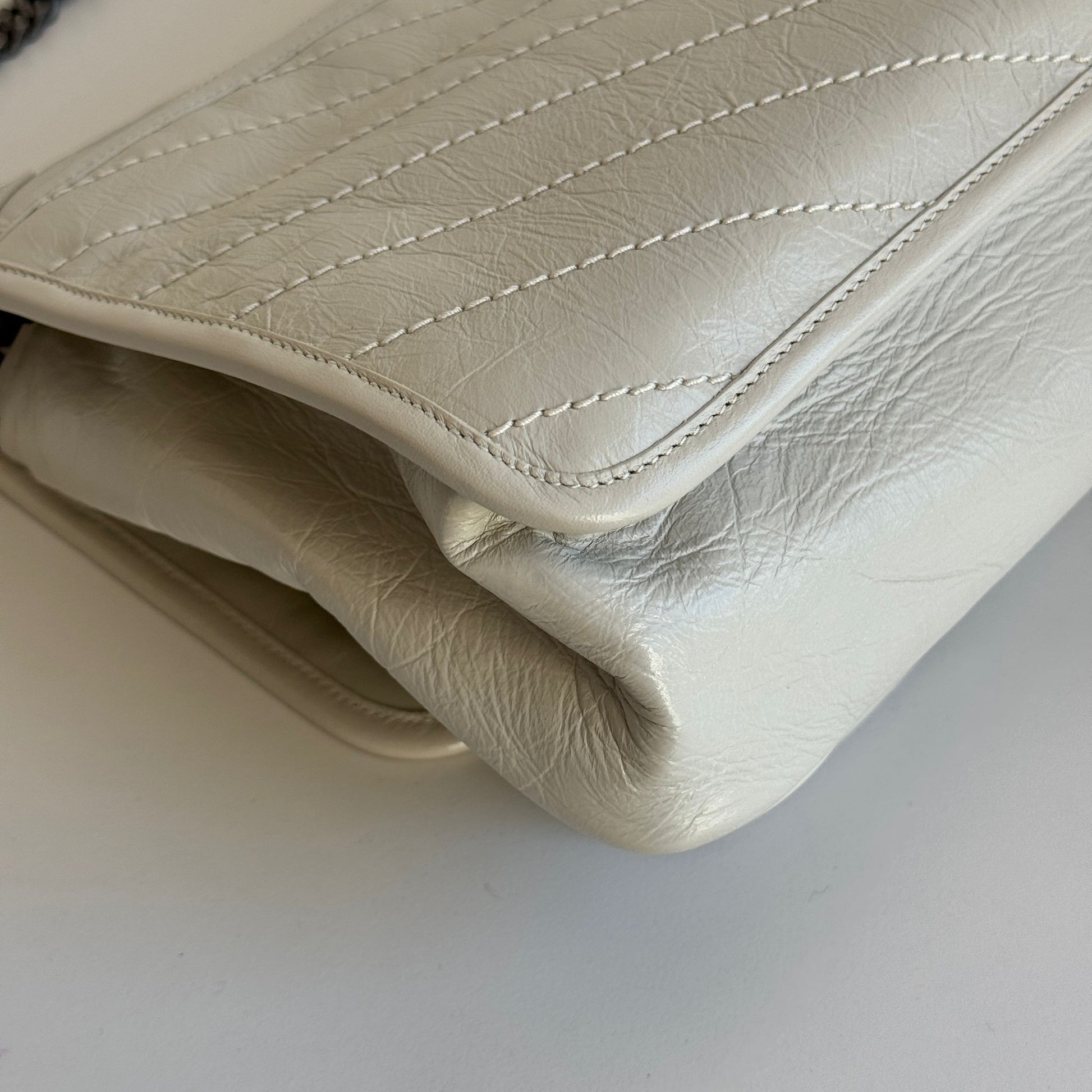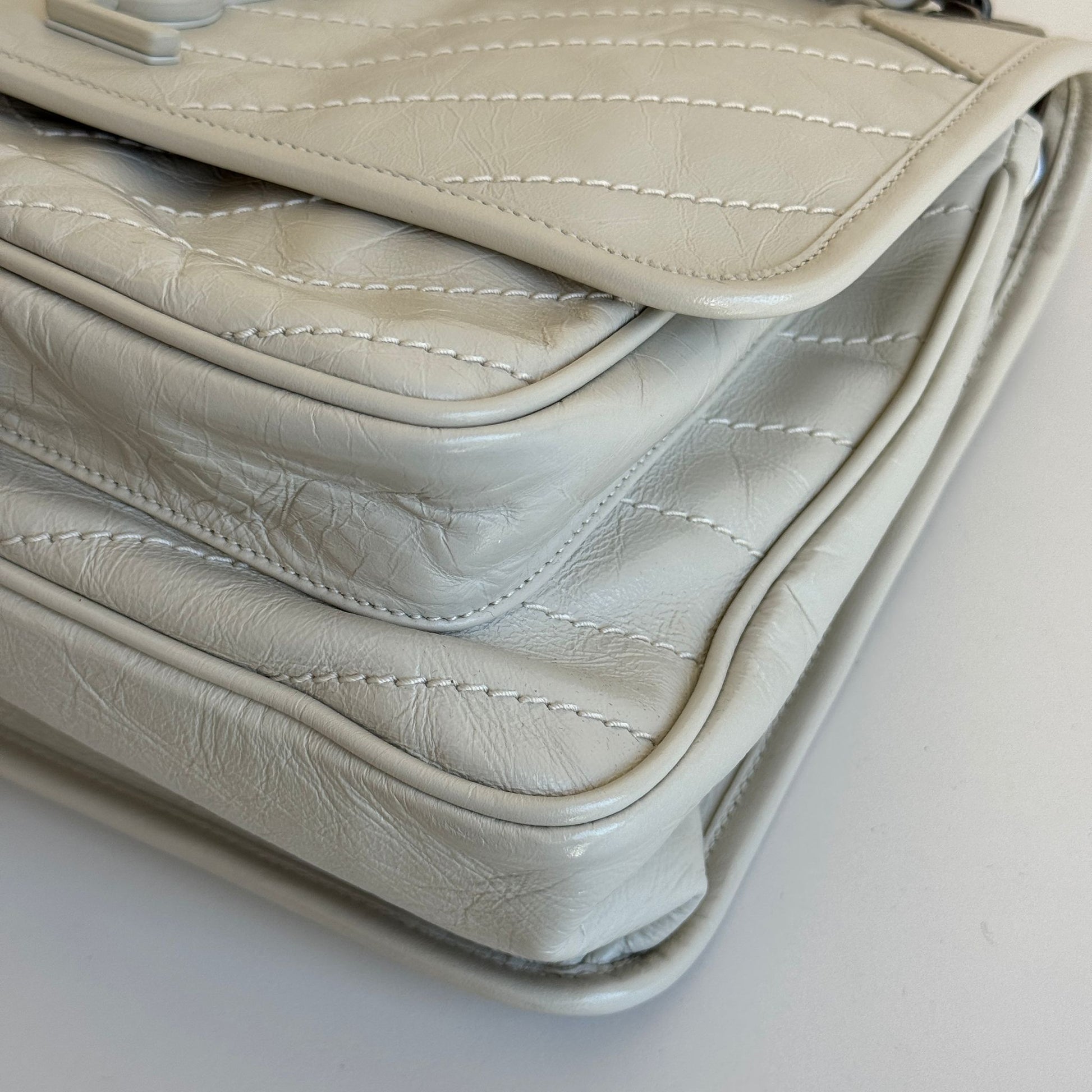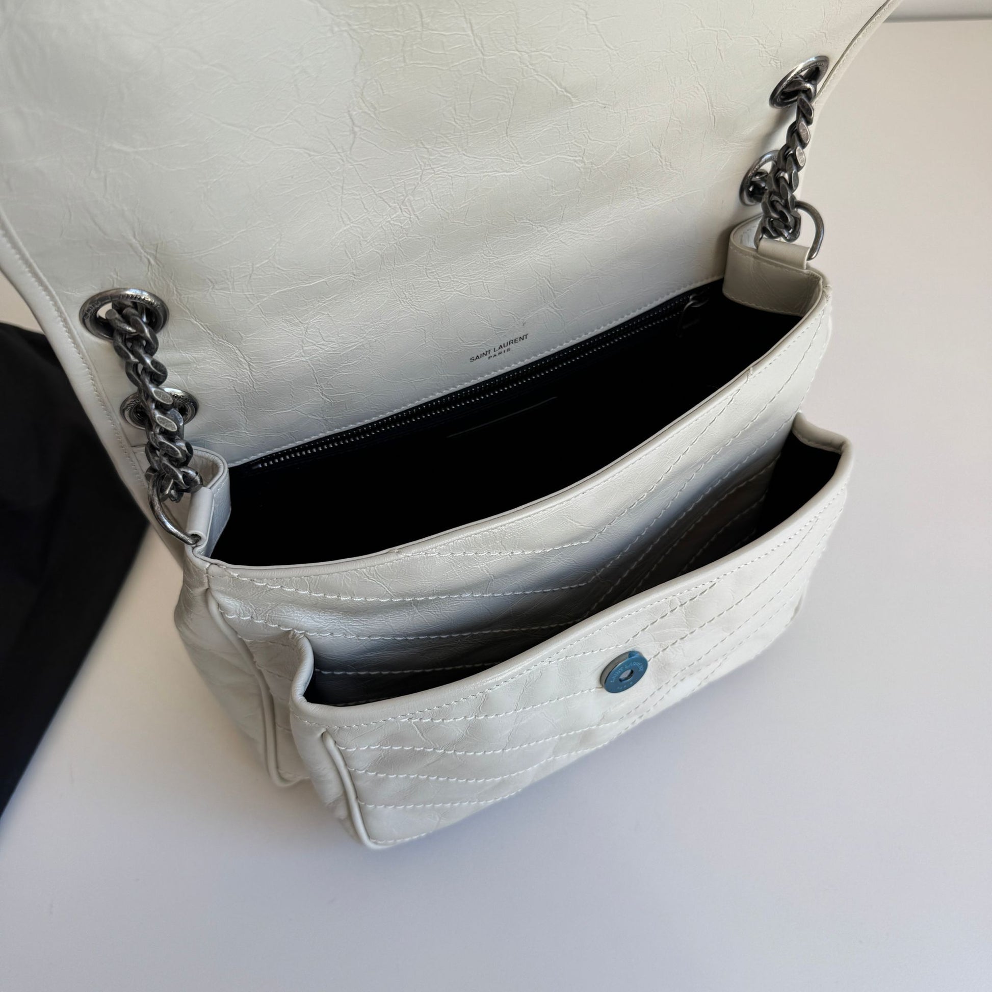Stupenda borsa Saint Laurent modello Niki Medium in pelle bianca effetto “stropicciato” e YSL tono su tono. Si indossa a spalla e a tracolla. La catena argento non è regolabile e rimovibile.