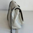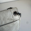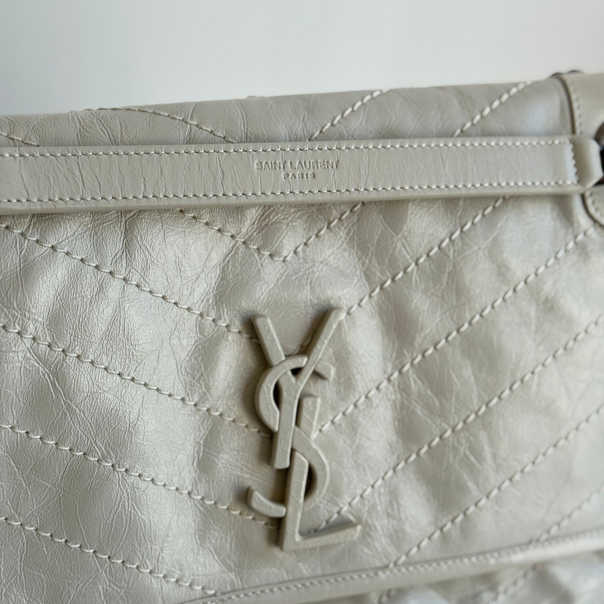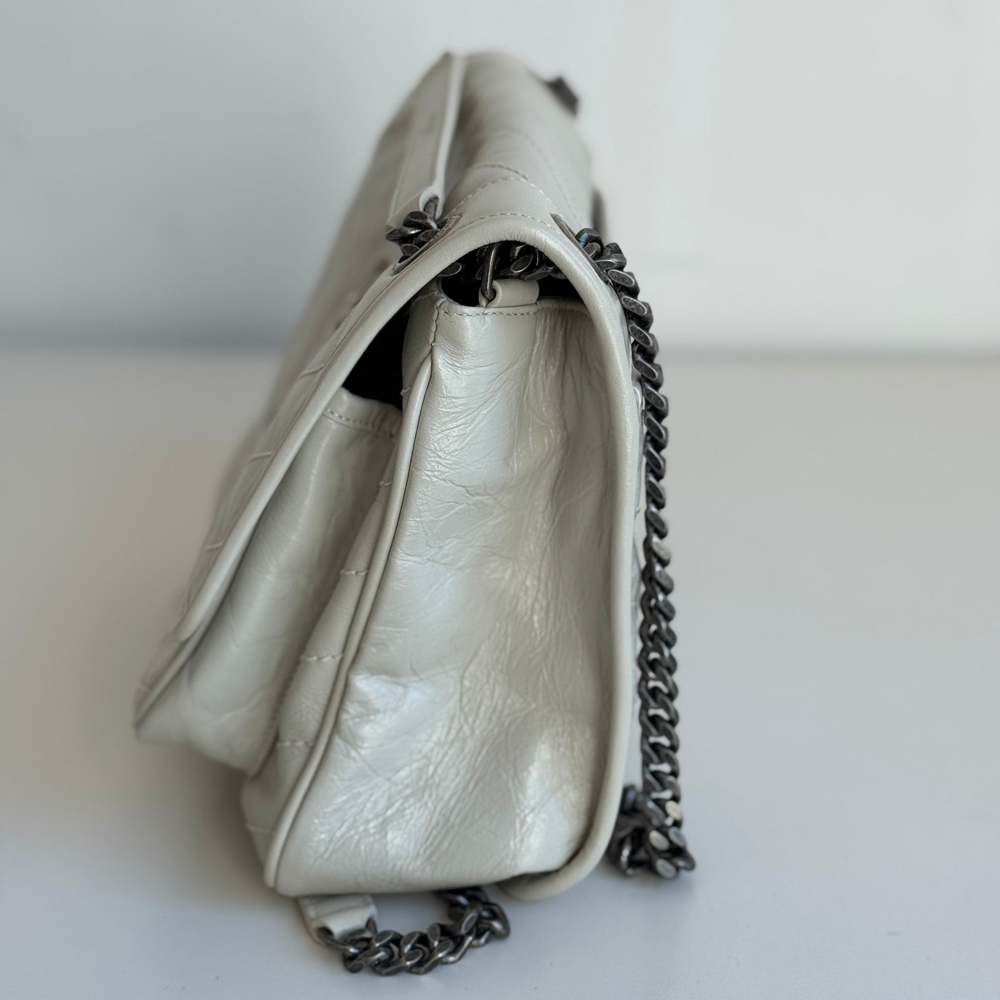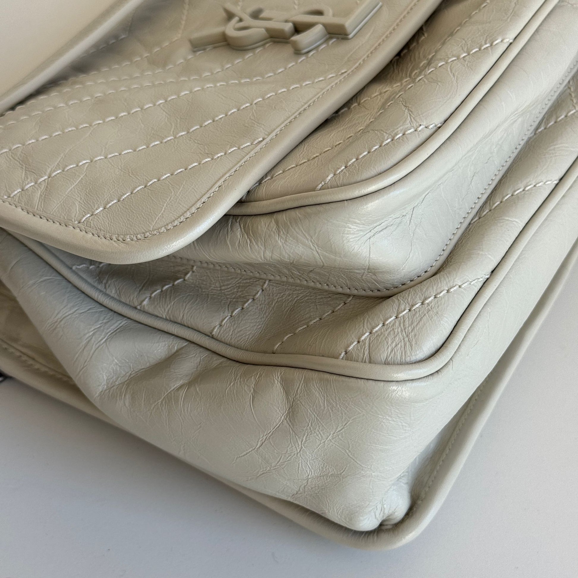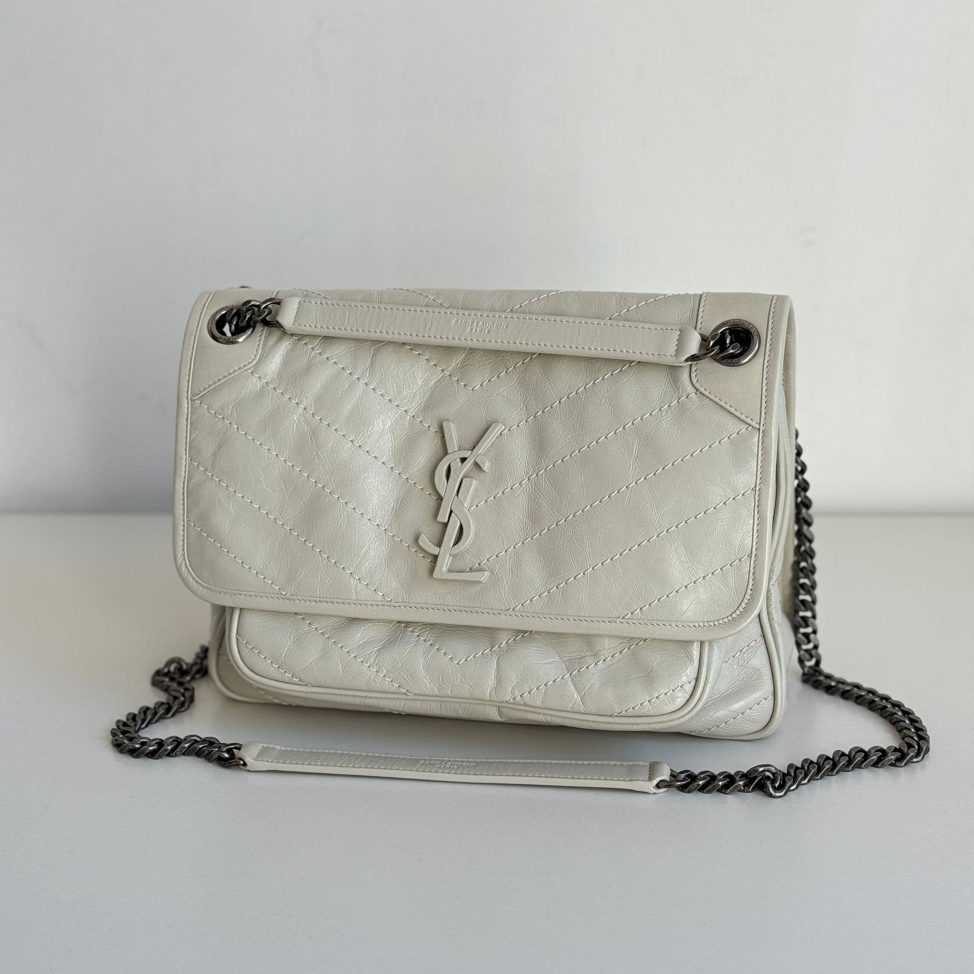 Stupenda borsa Saint Laurent modello Niki Medium in pelle bianca effetto “stropicciato” e YSL tono su tono. Si indossa a spalla e a tracolla. La catena argento non è regolabile e rimovibile.