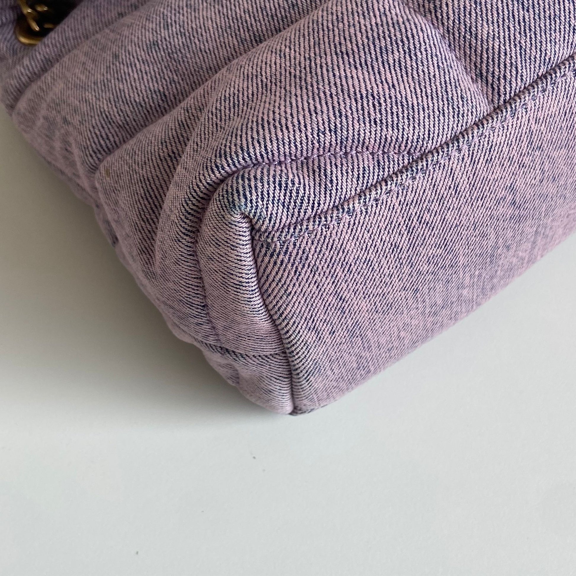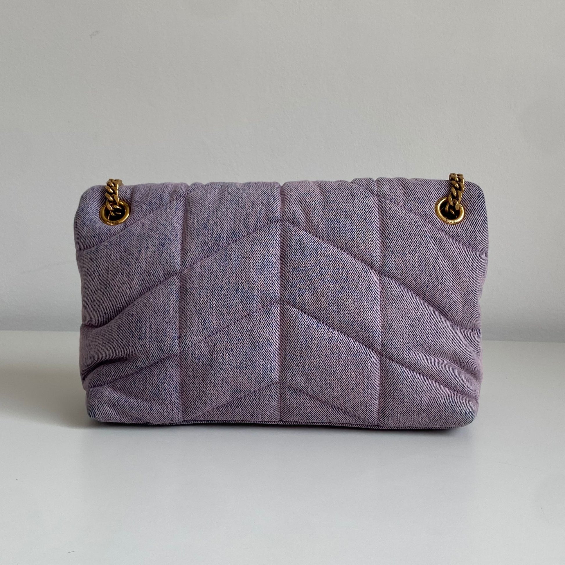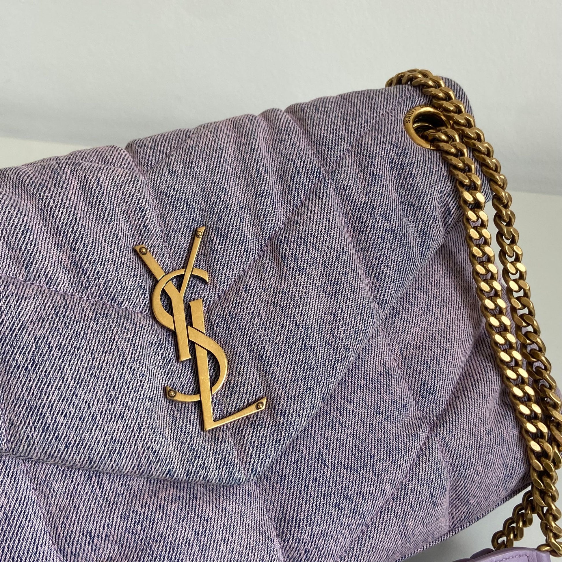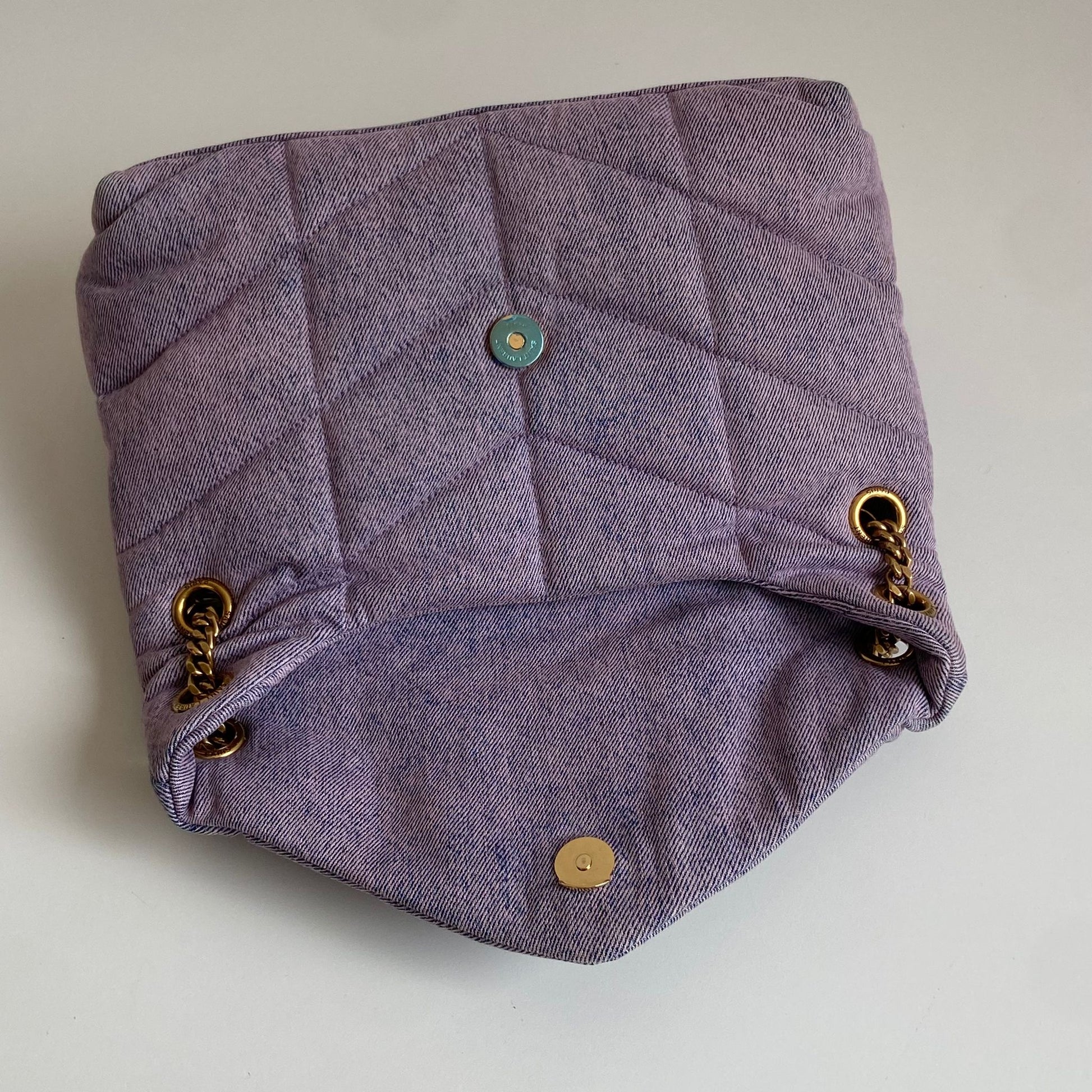 Meravigliosa borsa Saint Laurent modello Puffer Small in denim lilla e hardware oro. Si indossa a tracolla scorrevole. La tracolla non è regolabile.