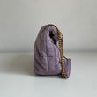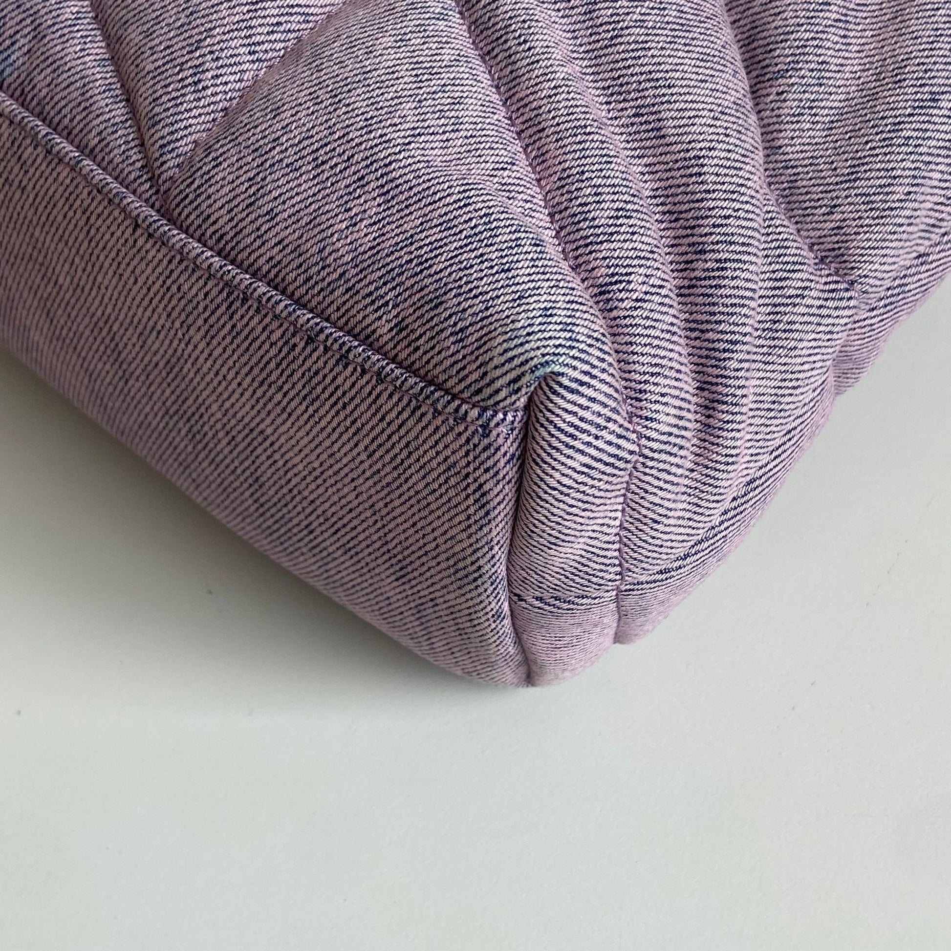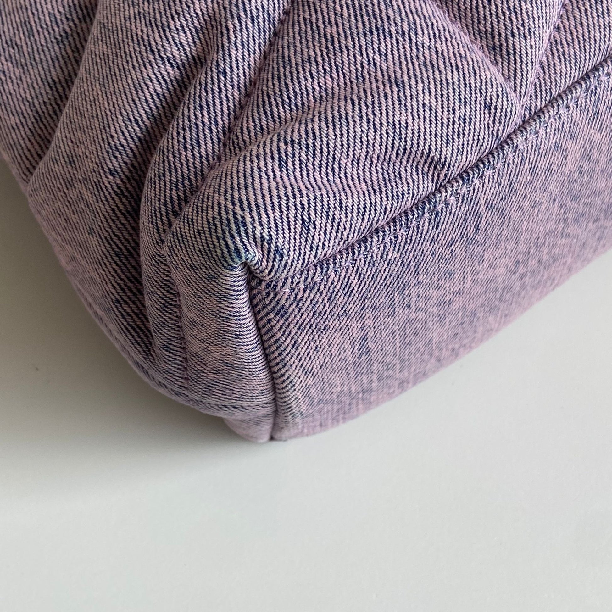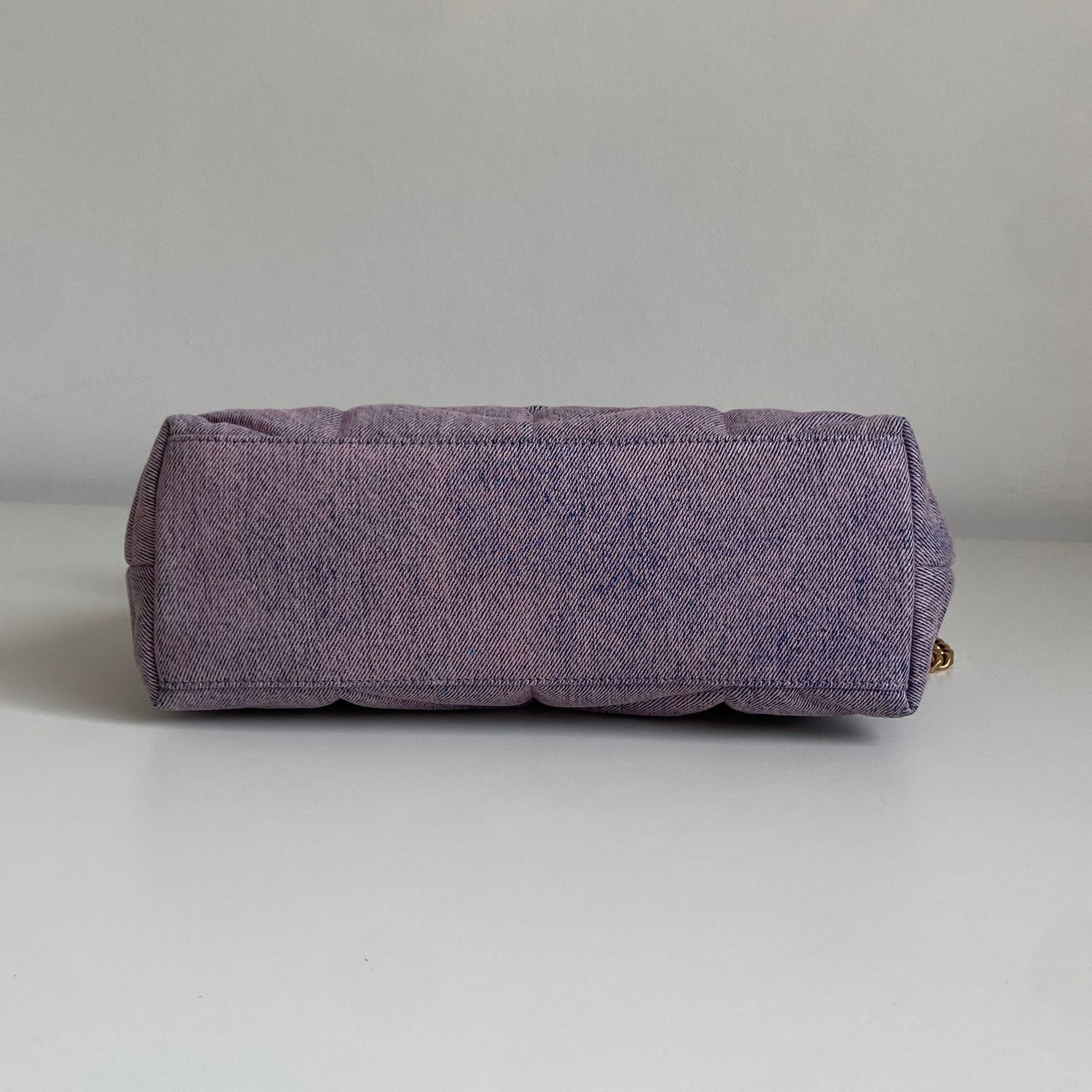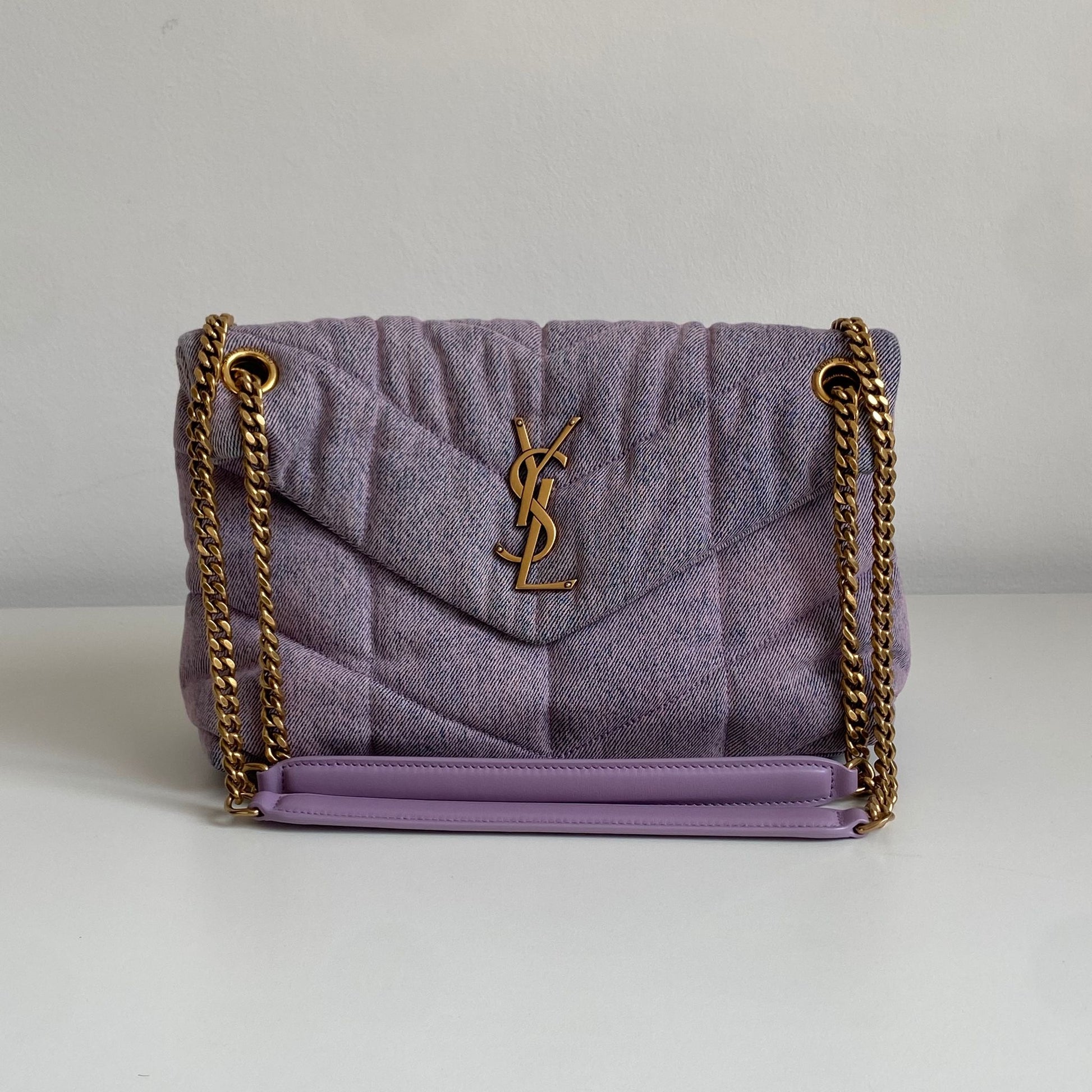 Meravigliosa borsa Saint Laurent modello Puffer Small in denim lilla e hardware oro. Si indossa a tracolla scorrevole. La tracolla non è regolabile.
