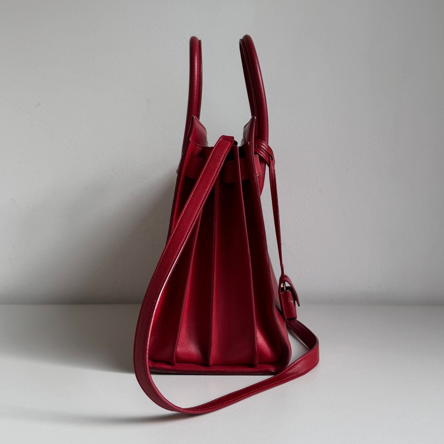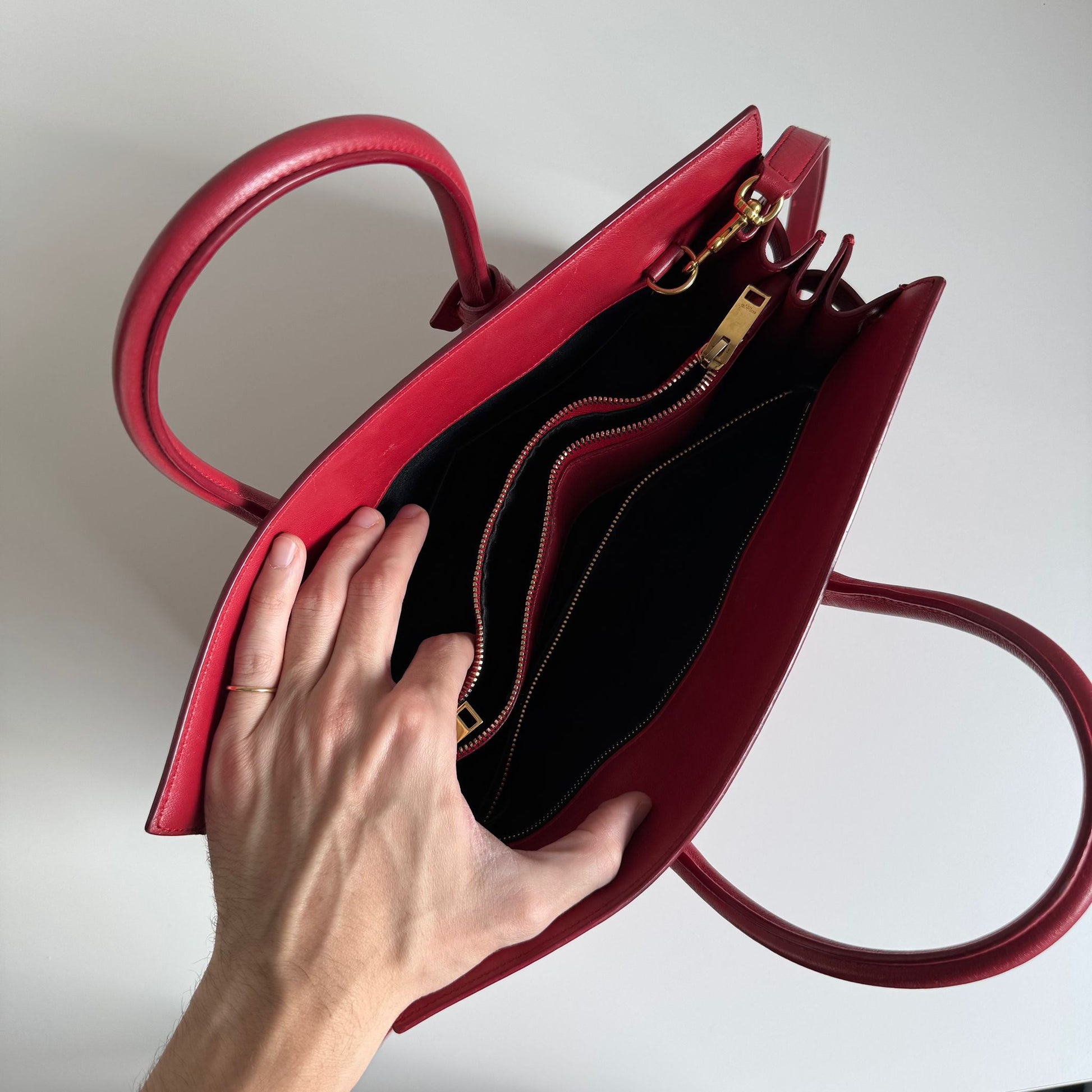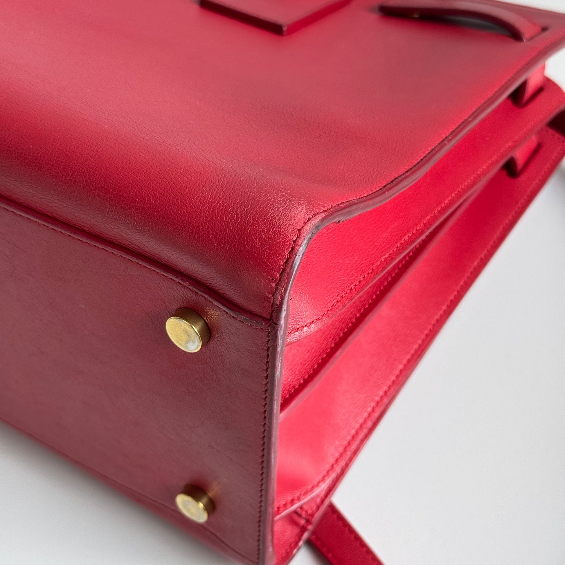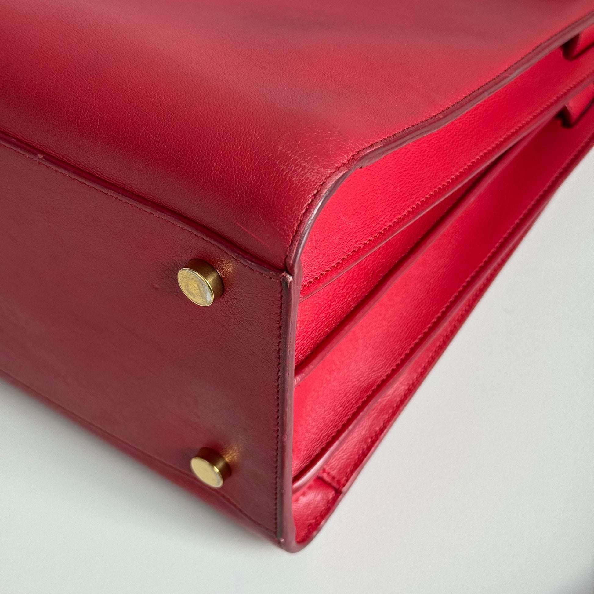 Iconica borsa Saint Laurent modello Sac De Jour in pelle rossa e hardware oro. Si indossa a mano o a tracolla, la tracolla è rimovibile ma non regolabile.