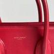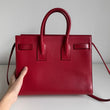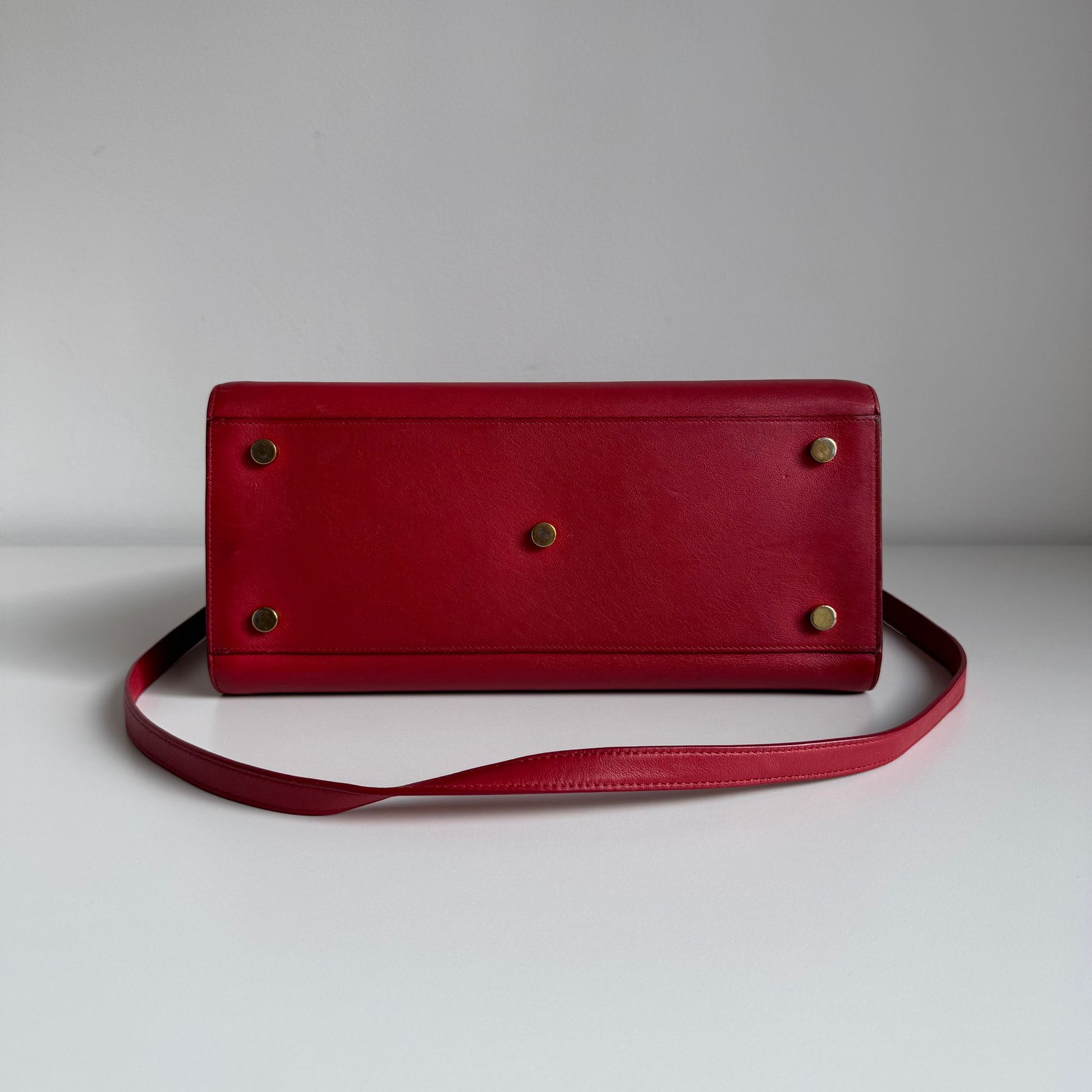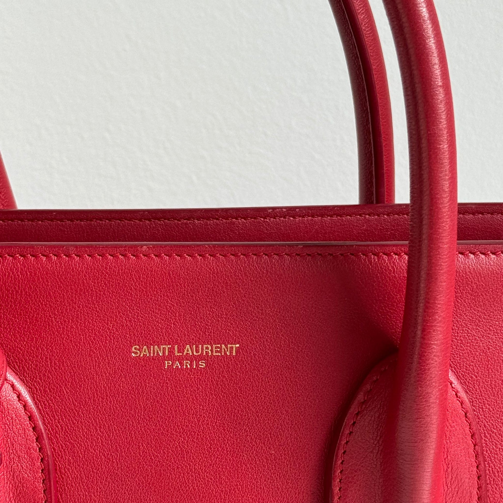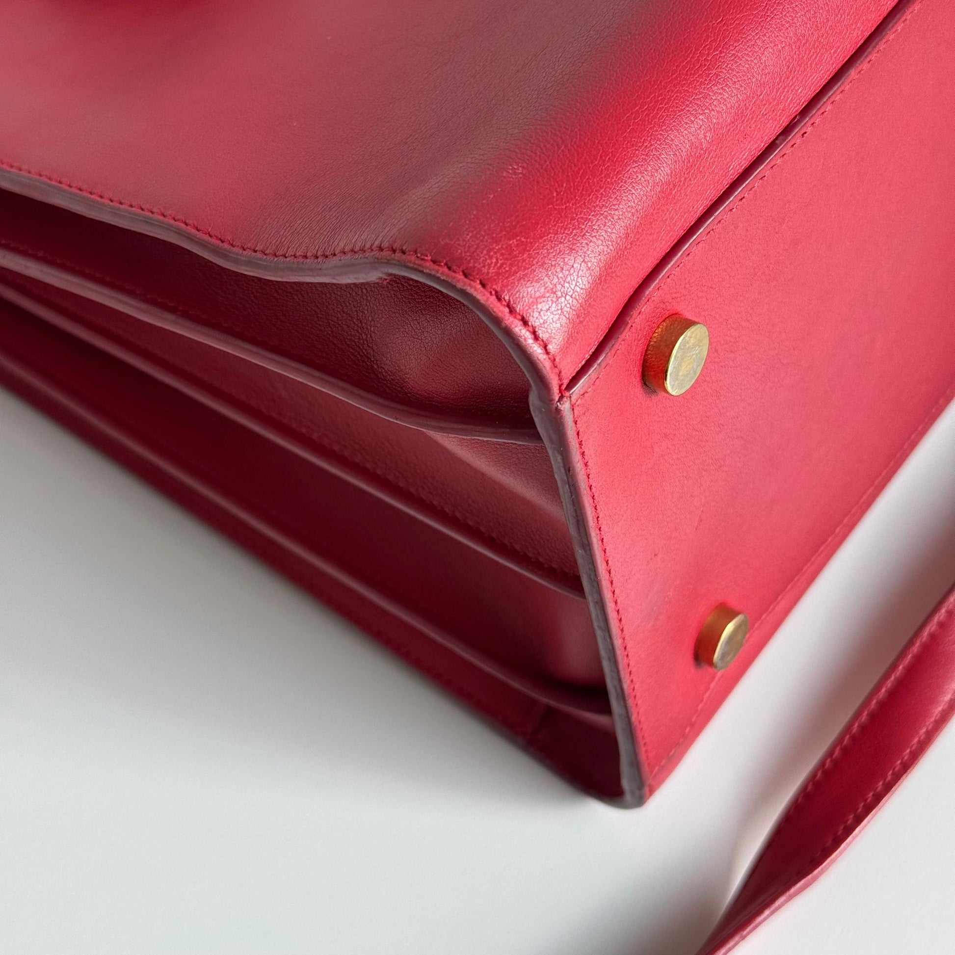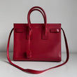 Iconica borsa Saint Laurent modello Sac De Jour in pelle rossa e hardware oro. Si indossa a mano o a tracolla, la tracolla è rimovibile ma non regolabile.