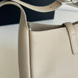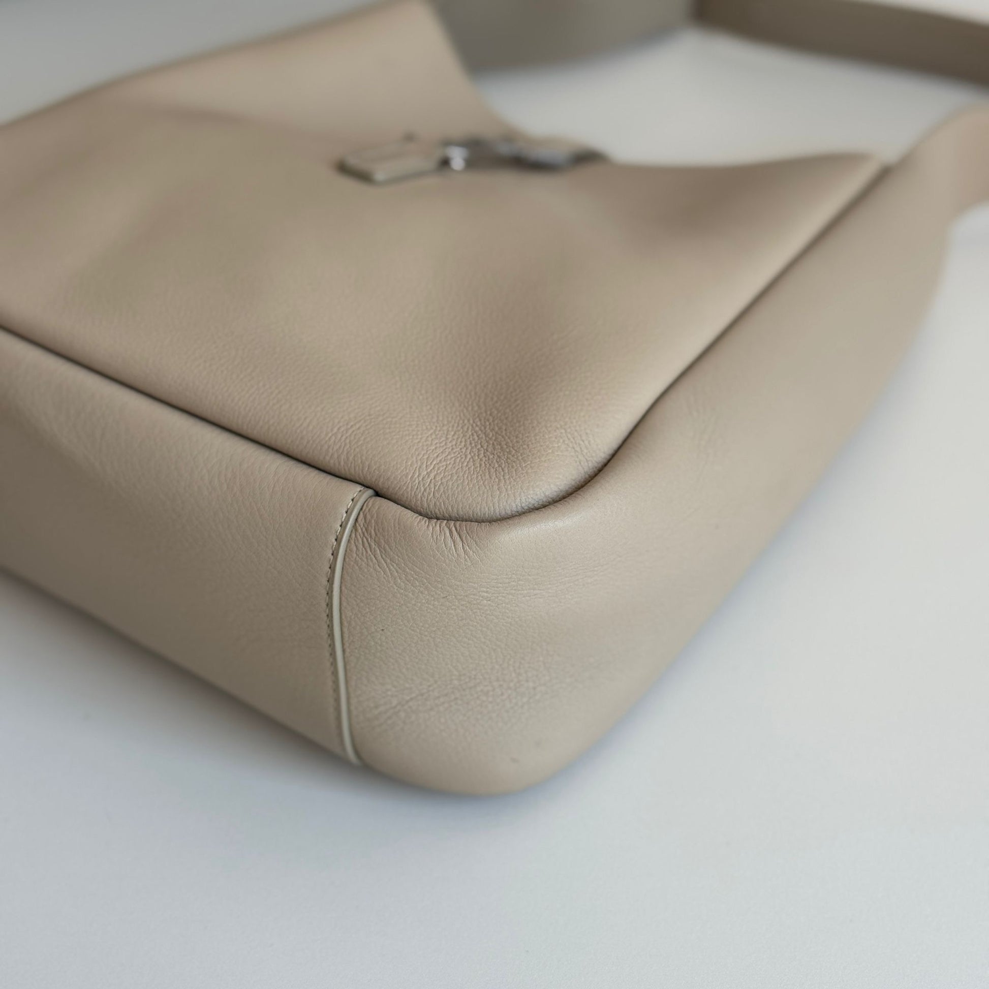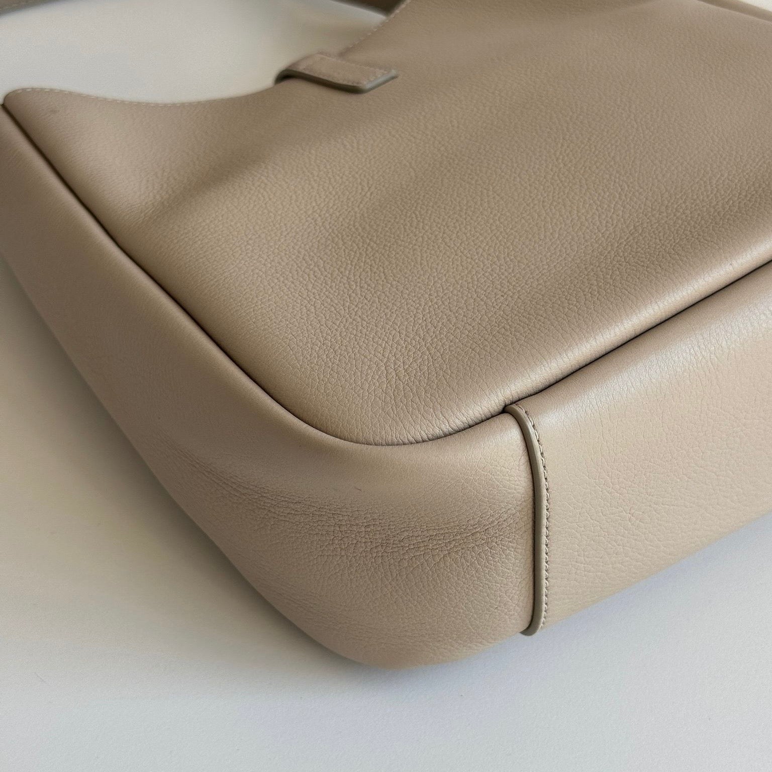 Bellissima borsa Saint Laurent modello Le 5 à 7 in pelle liscia beige chiaro e hardware argento. Si indossa a spalla.
