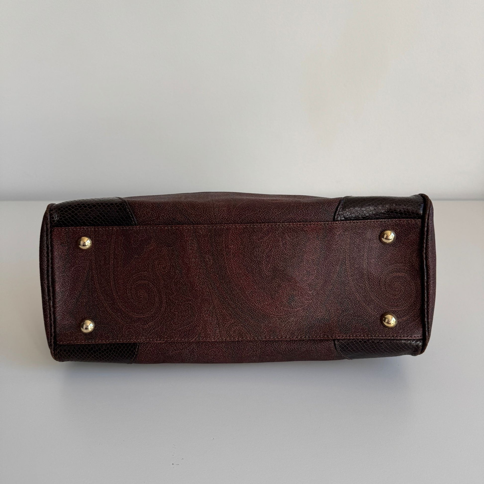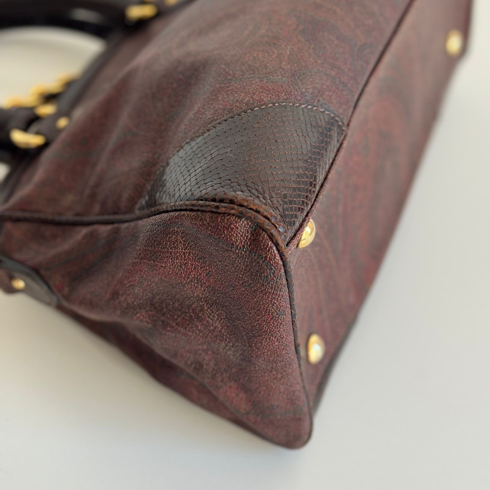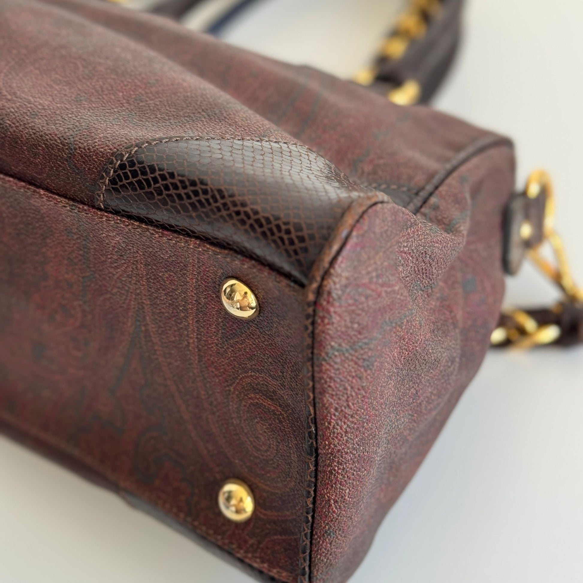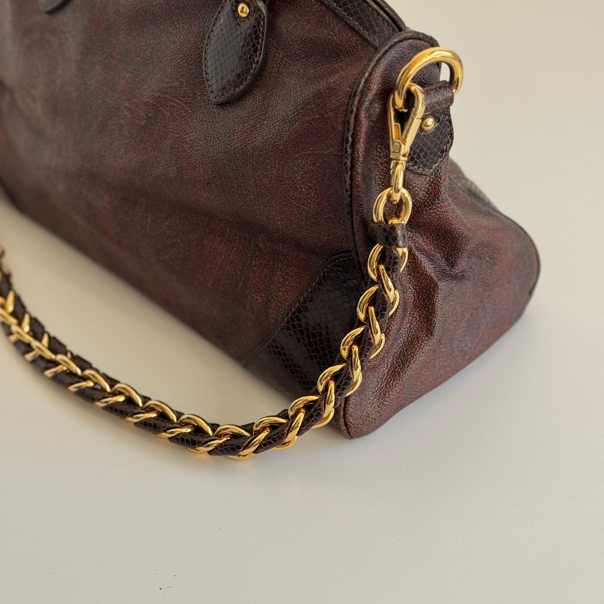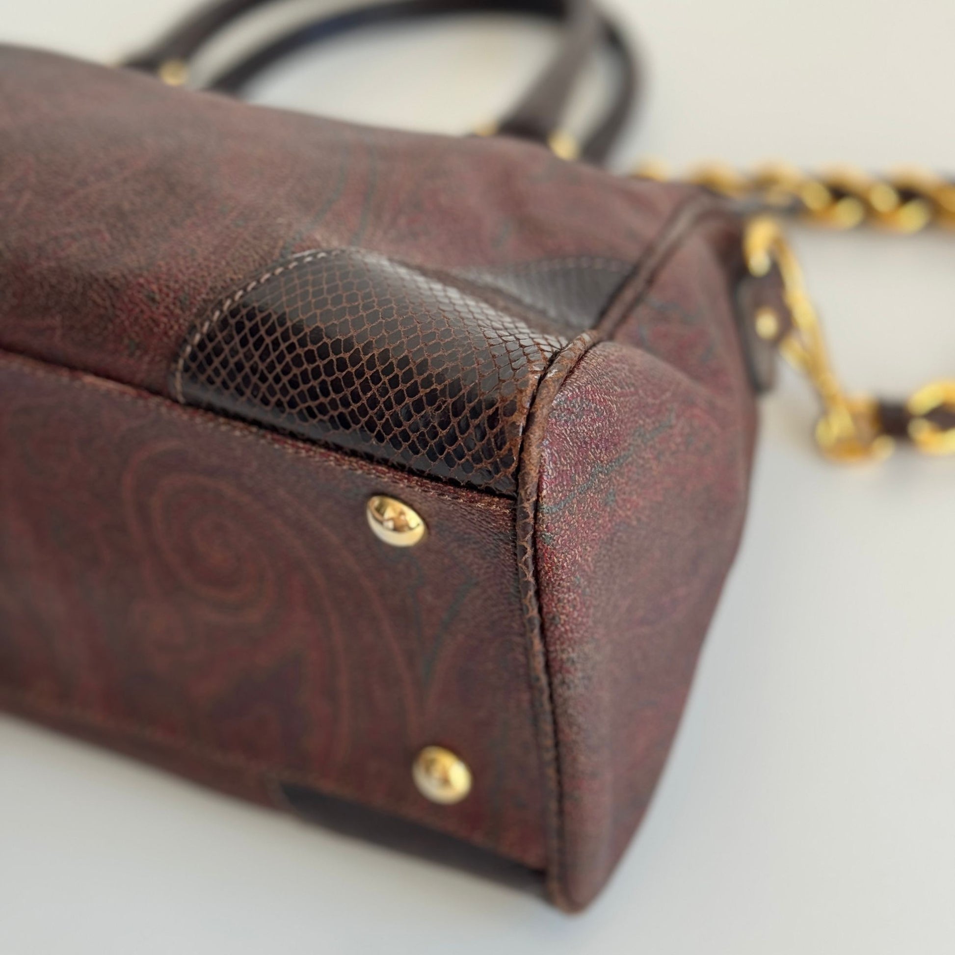 Bellissima borsa Etro in tela Paisley e dettagli in pelle croco con hardware oro. Si indossa a mano e a spalla, la catena è rimovibile ma non regolabile.