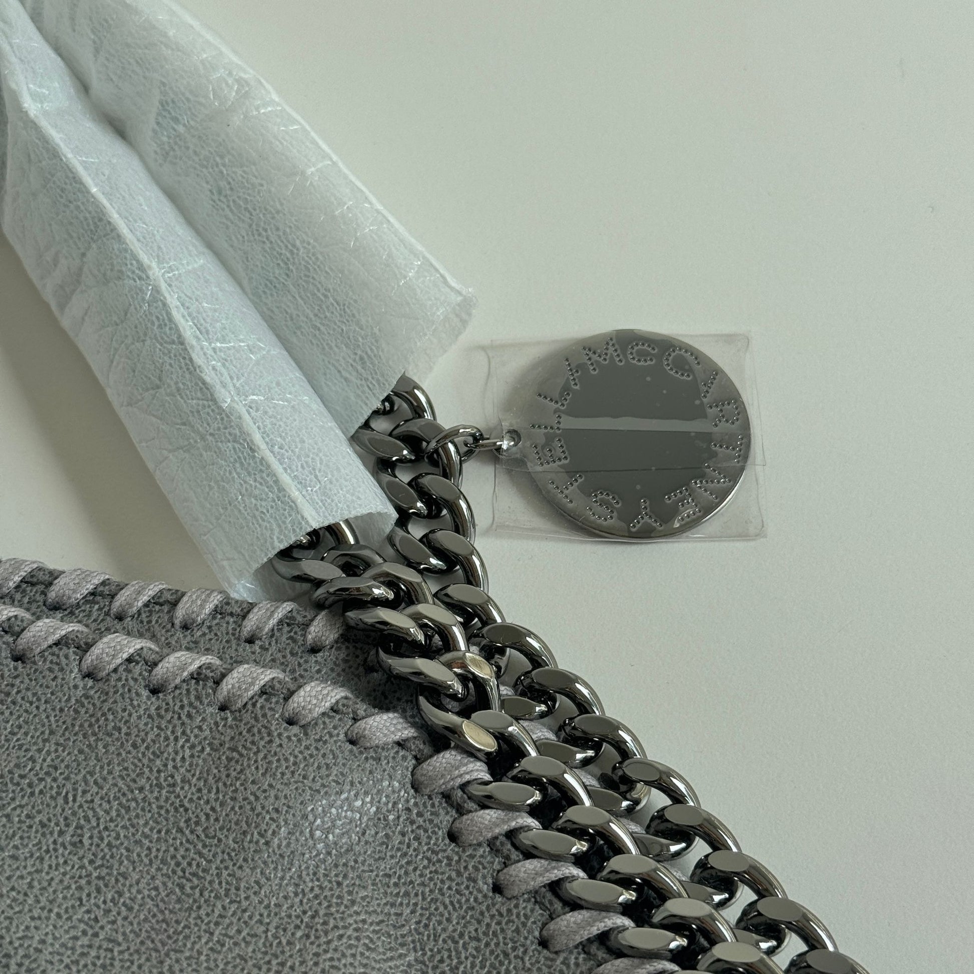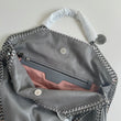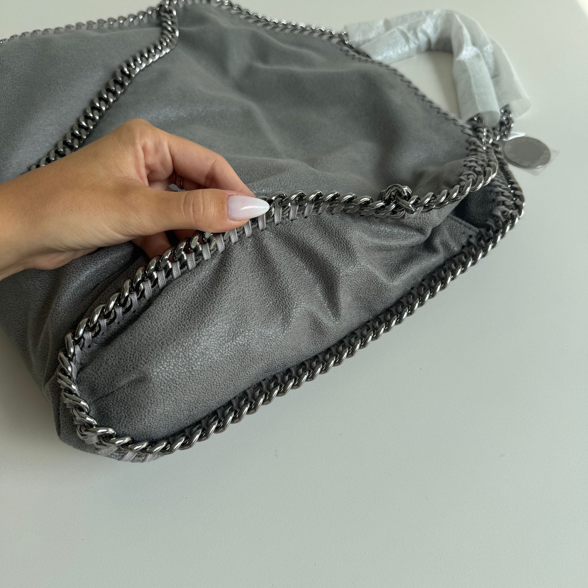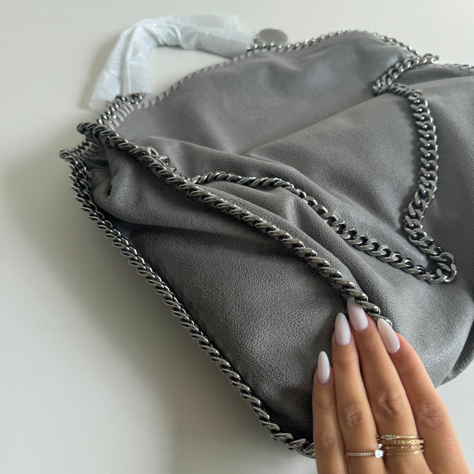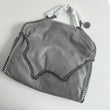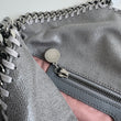 Iconica borsa Stella McCartney Falabella 3 catene Pieghevole in Shaggy Deer grigia, con hardware argento. Si indossa a spalla in due modi.