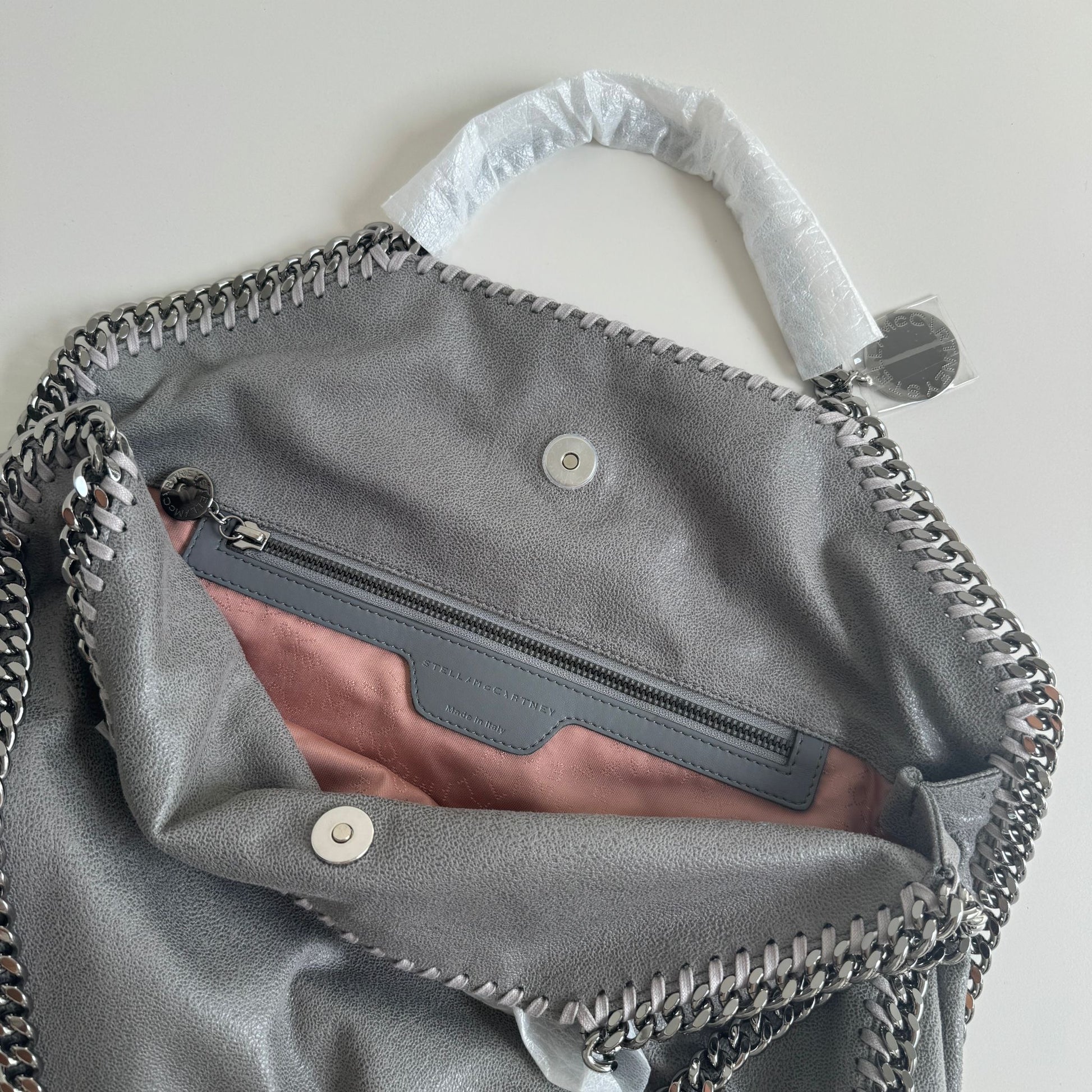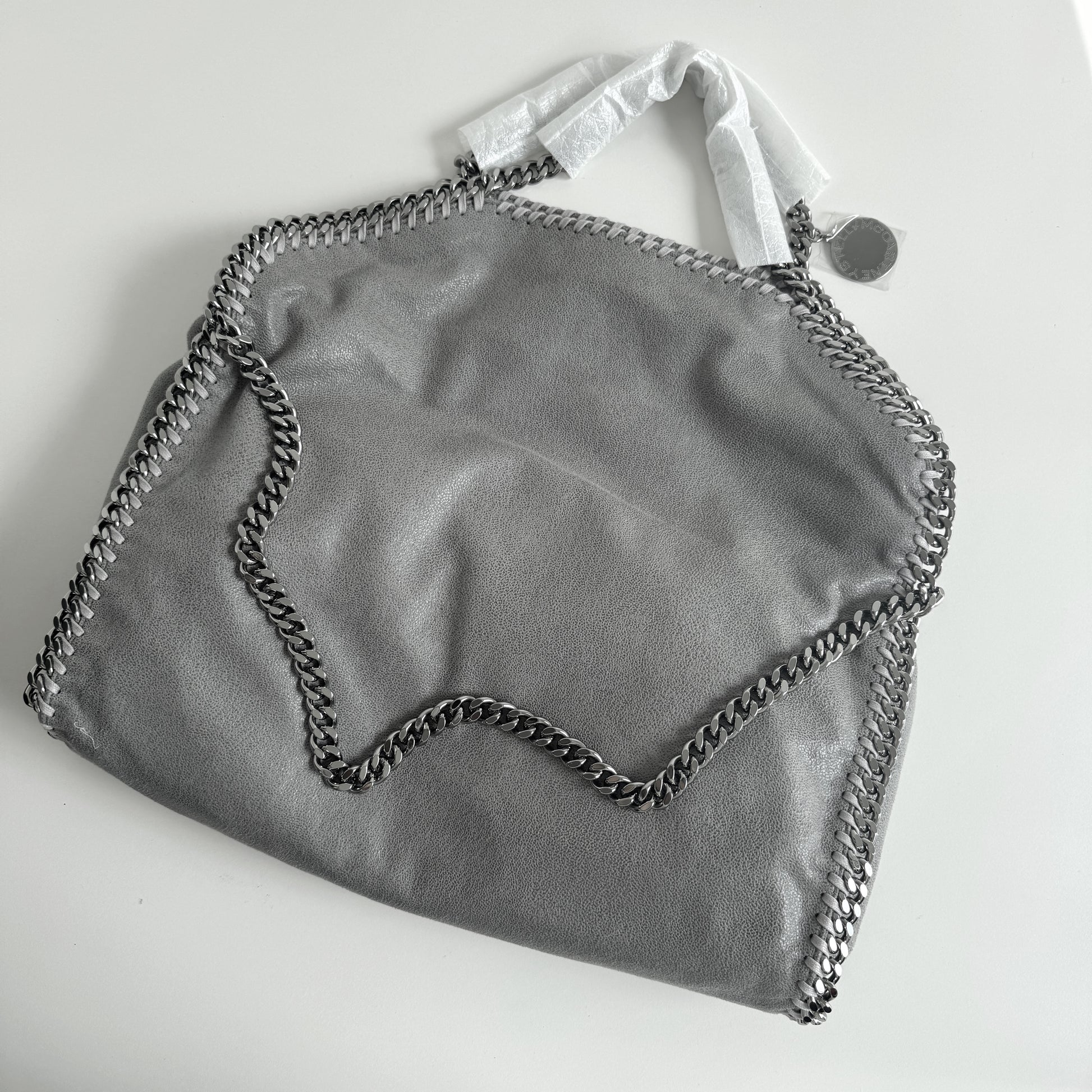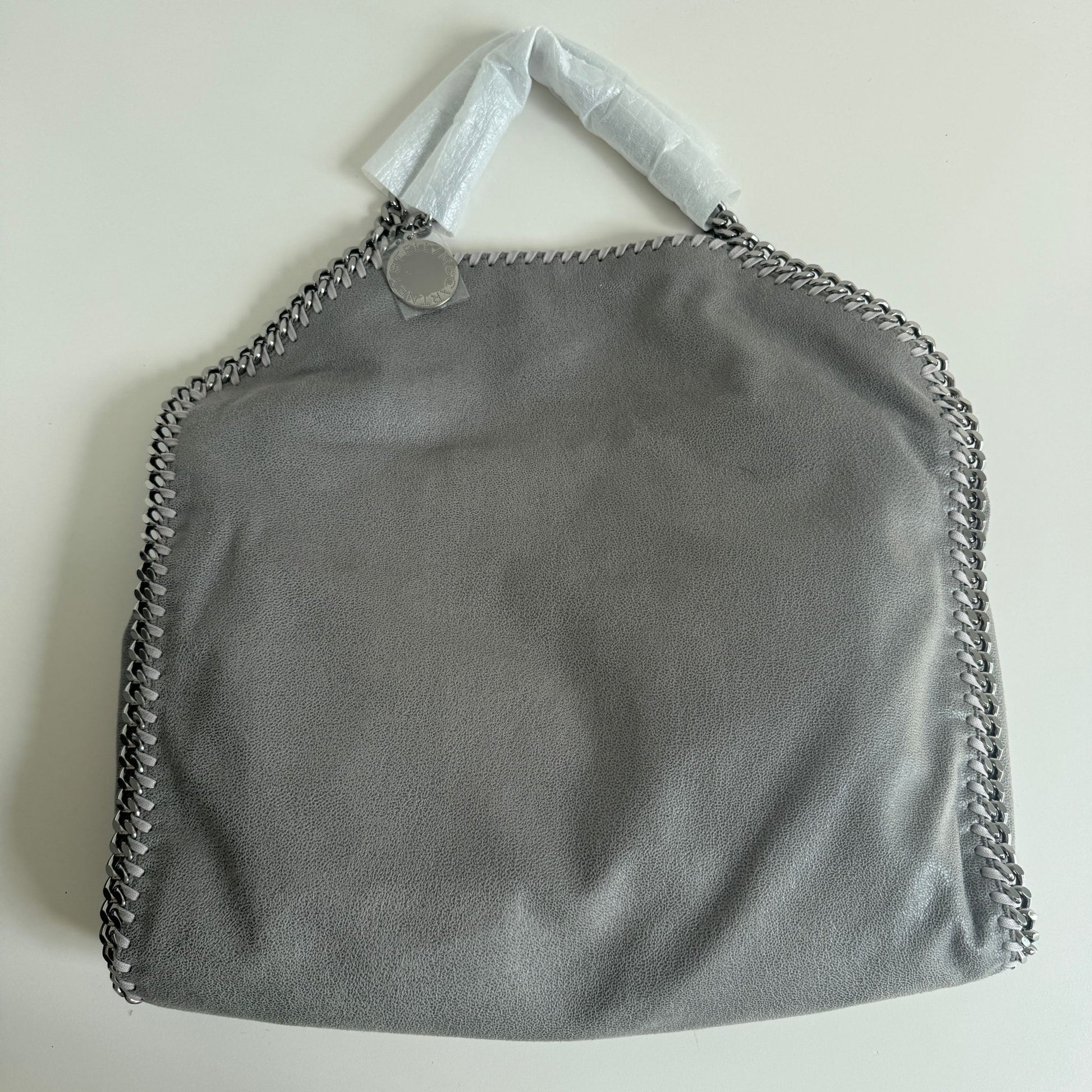 Iconica borsa Stella McCartney Falabella 3 catene Pieghevole in Shaggy Deer grigia, con hardware argento. Si indossa a spalla in due modi.