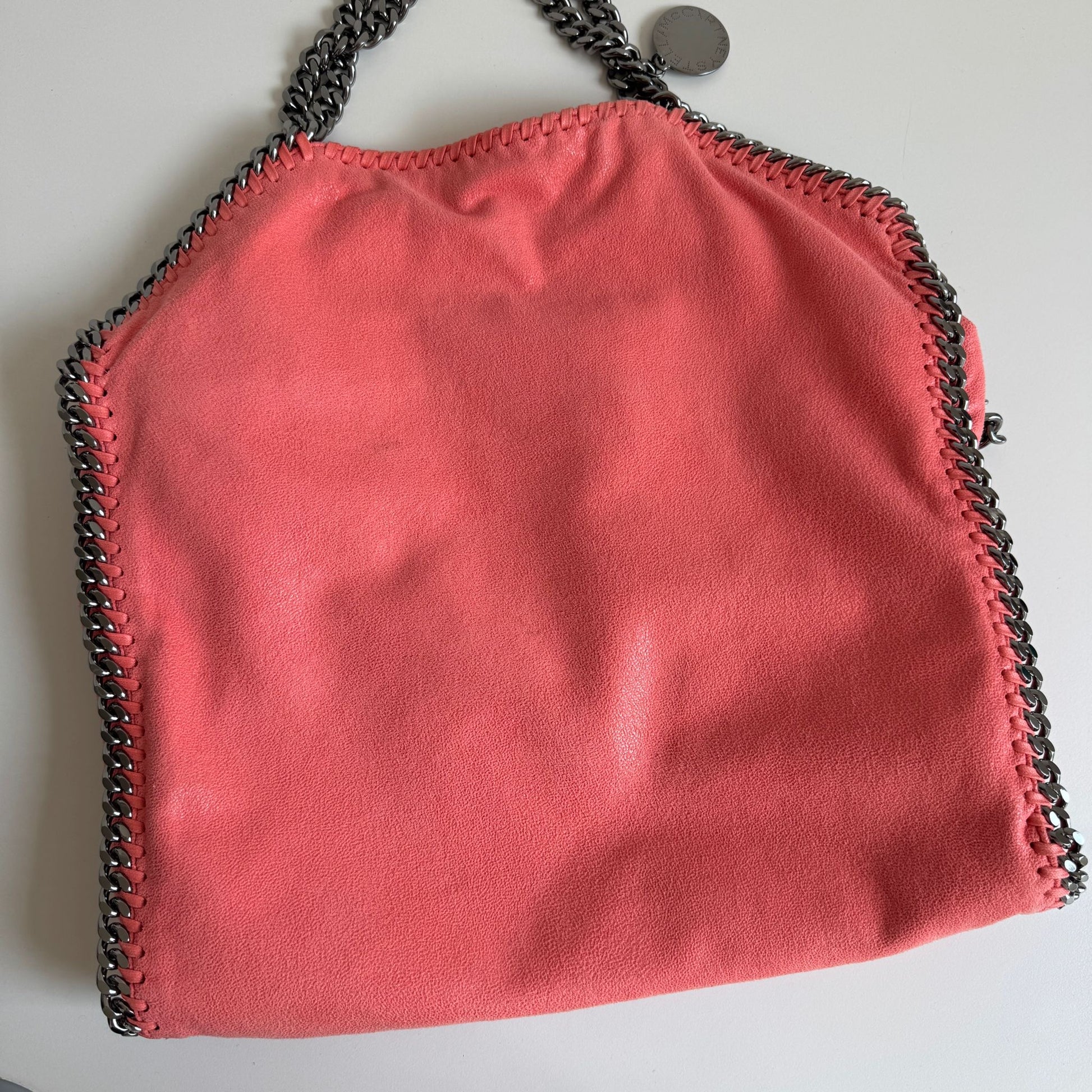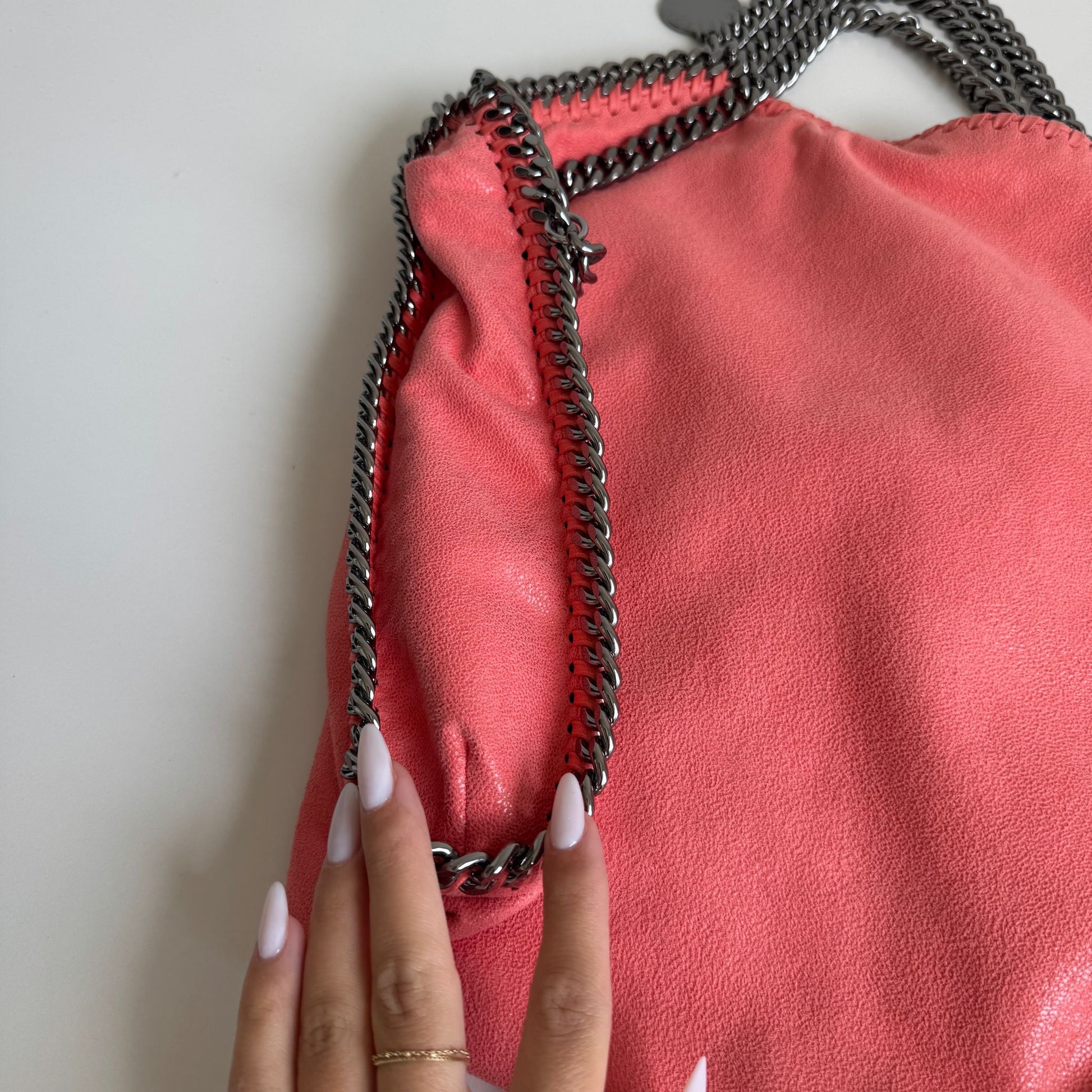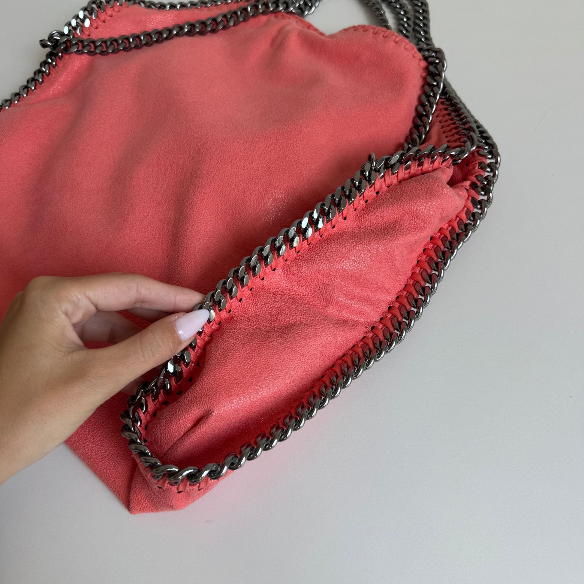 Iconica borsa Stella McCartney Falabella 3 catene Pieghevole in Shaggy Deer rosa salmone, con hardware argento. Si indossa a spalla e a mano.