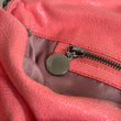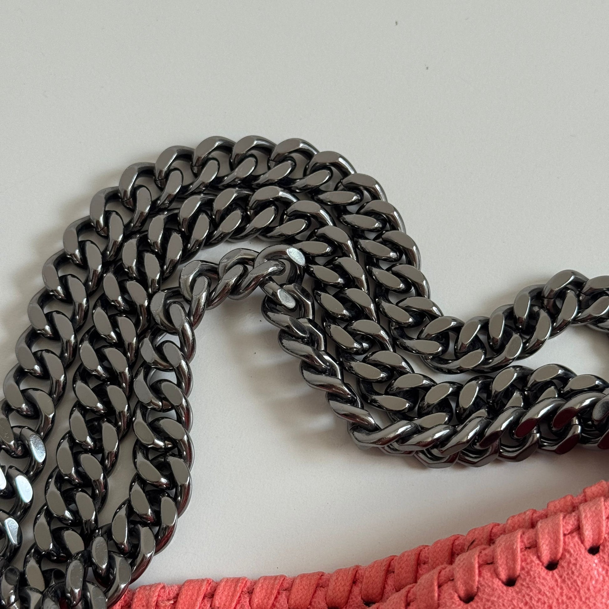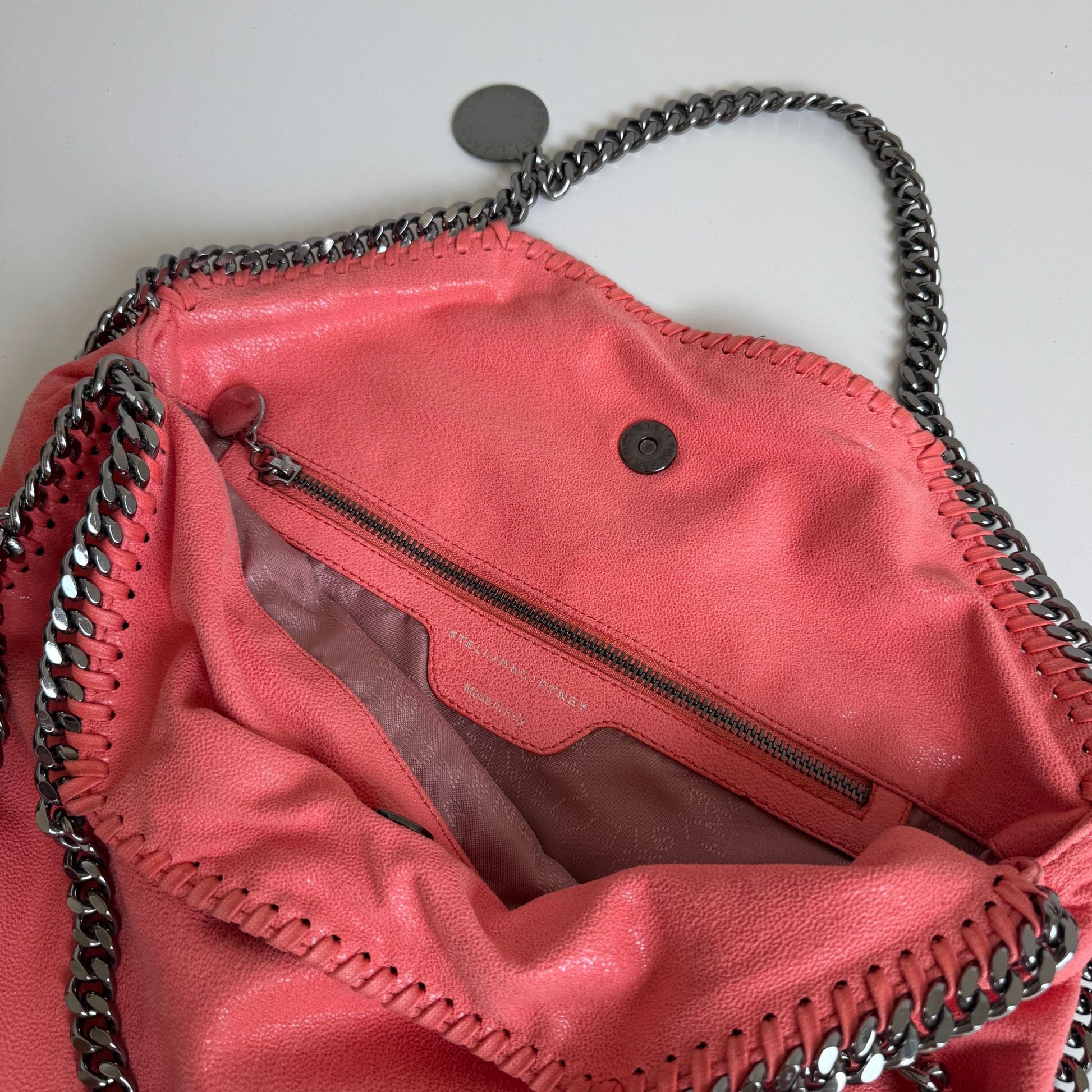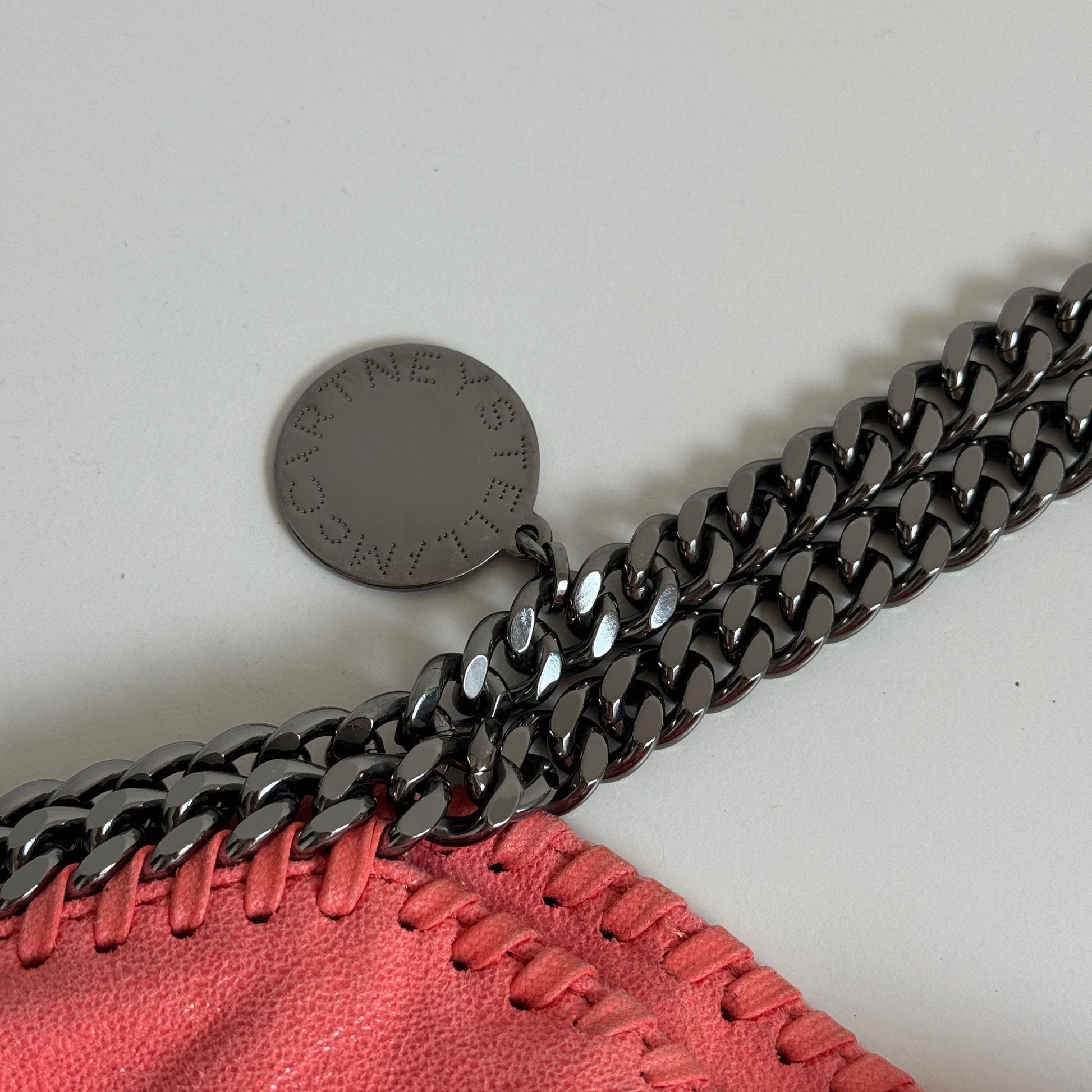 Iconica borsa Stella McCartney Falabella 3 catene Pieghevole in Shaggy Deer rosa salmone, con hardware argento. Si indossa a spalla e a mano.