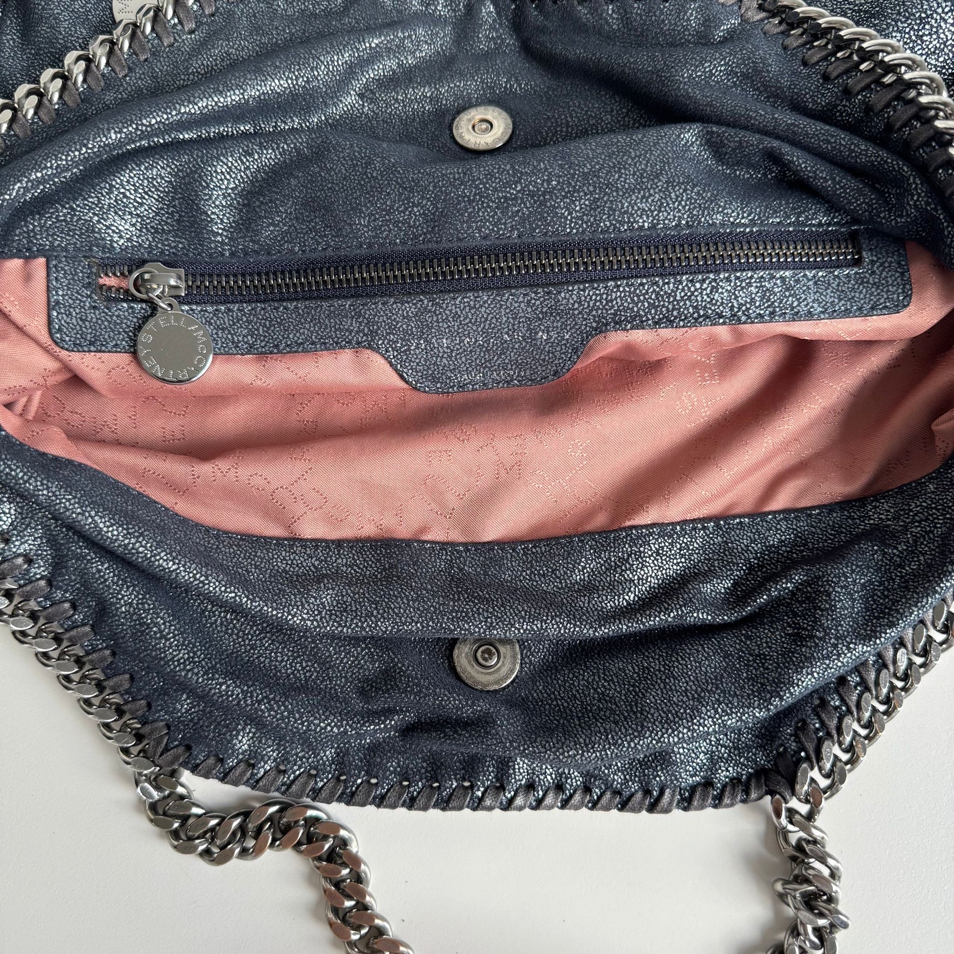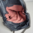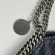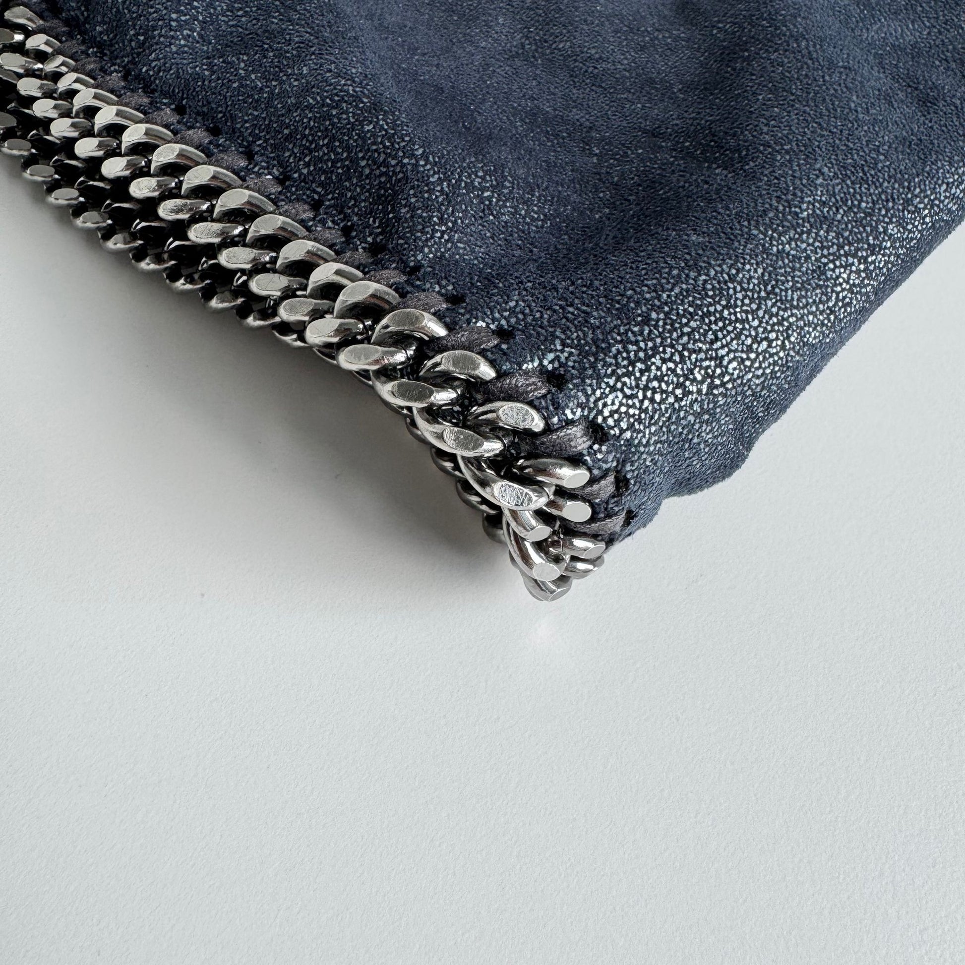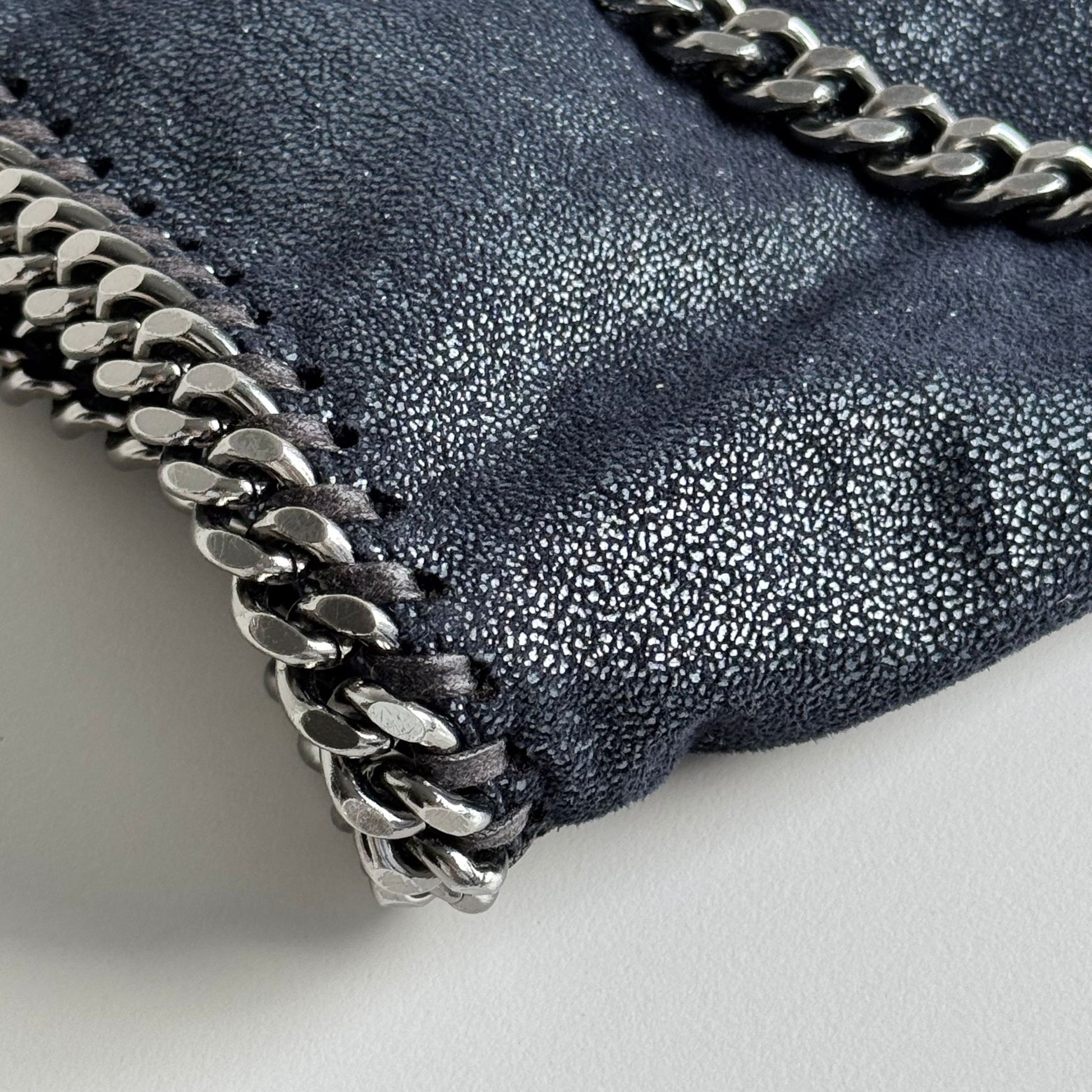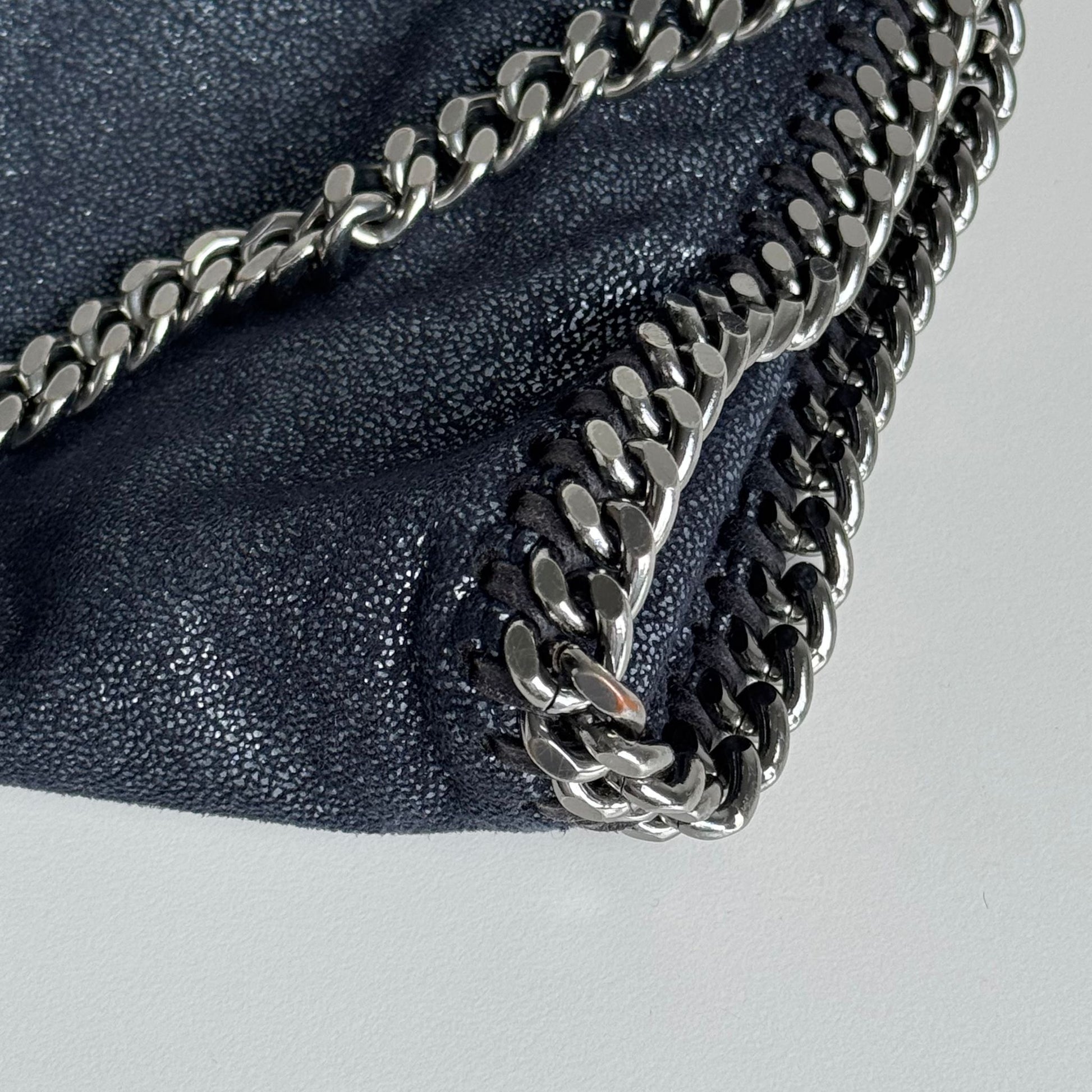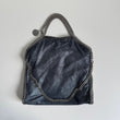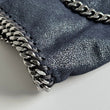 Iconica borsa Stella McCartney Falabella 3 catene Pieghevole in Shaggy Deer blu navy argentato, con hardware argento. Si indossa a spalla in due modi.