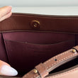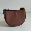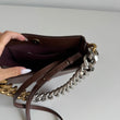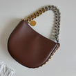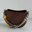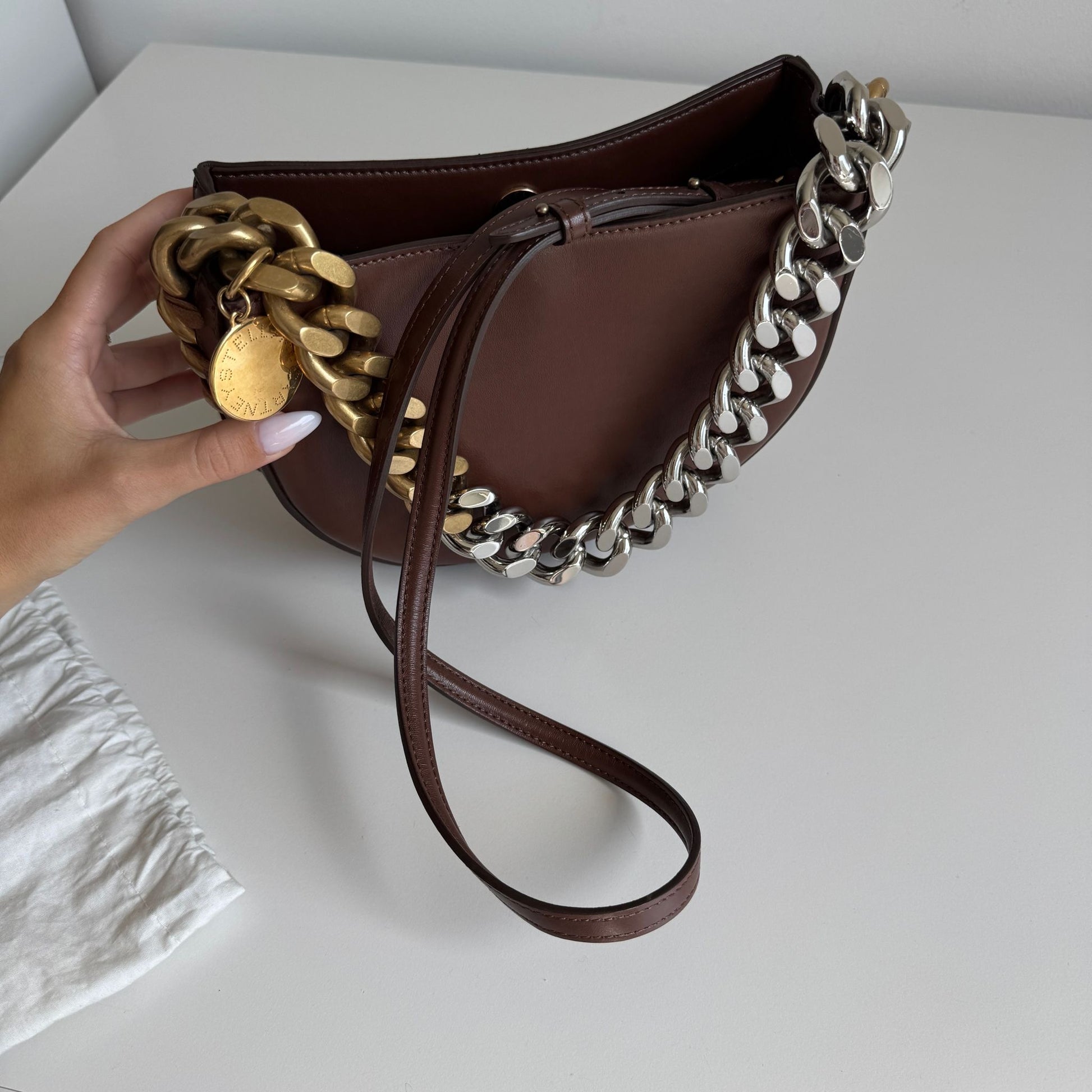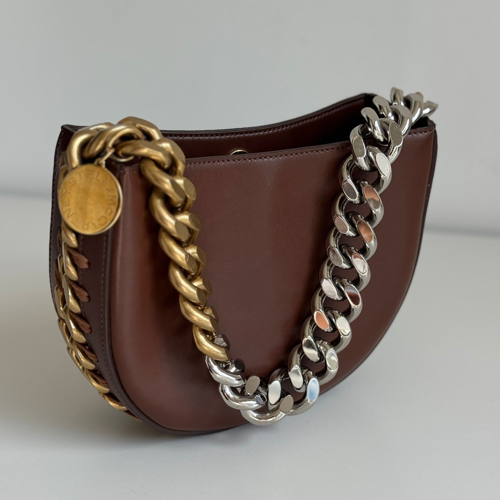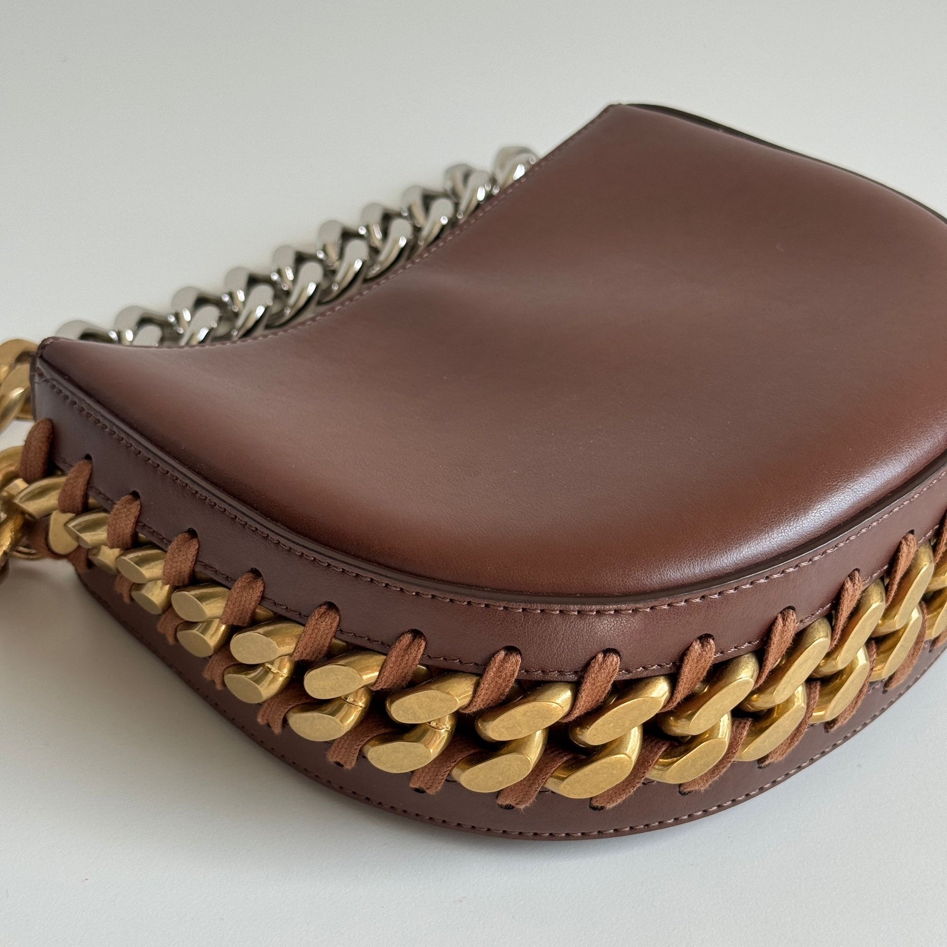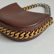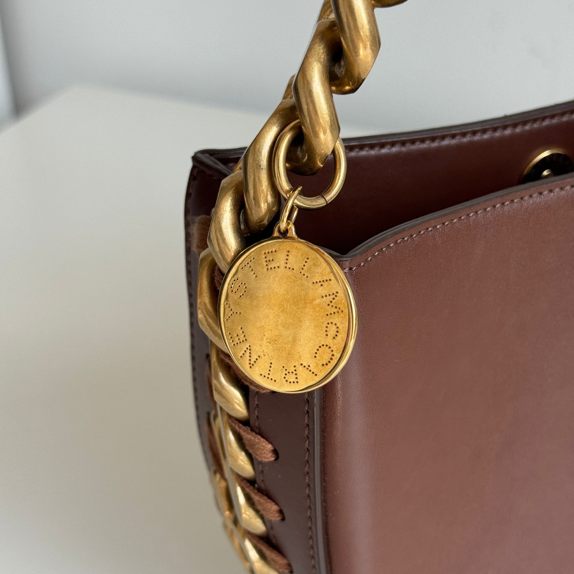 Meravigliosa borsa Stella McCartney modello Frayme in simil pelle marrone con hardware oro e catena oro-argento. Si indossa a spalla e a tracolla. La tracolla é rimovibile e regolabile.