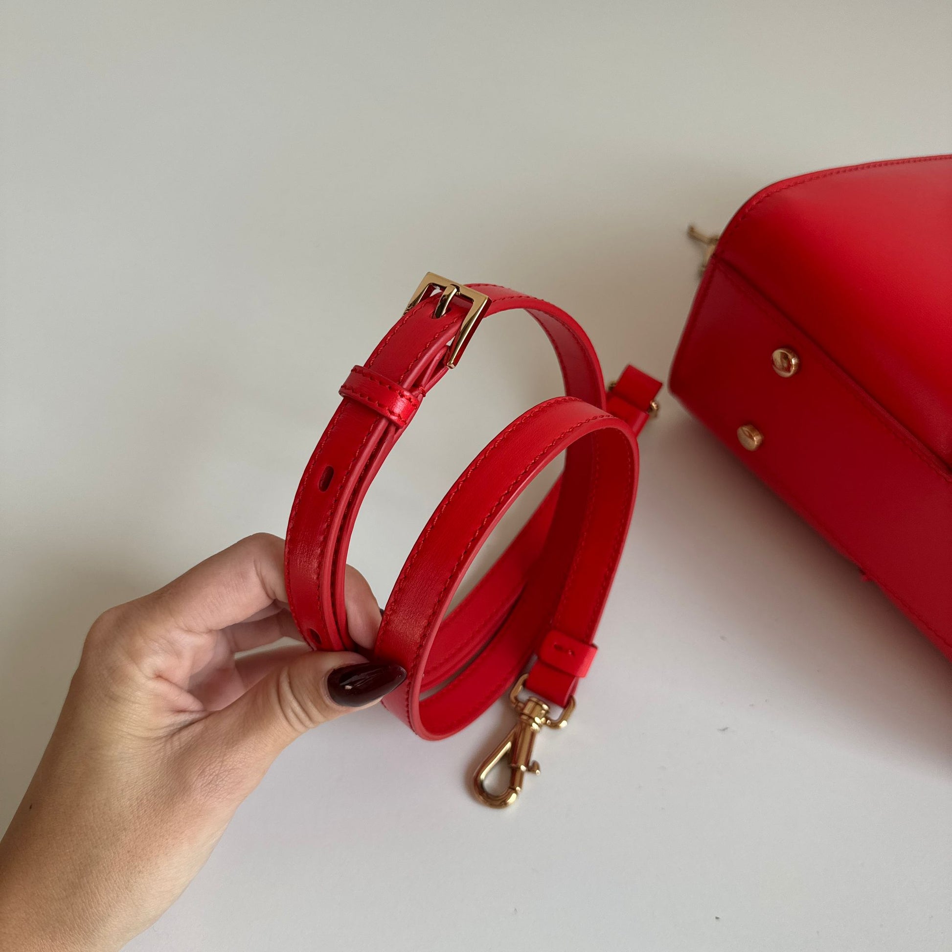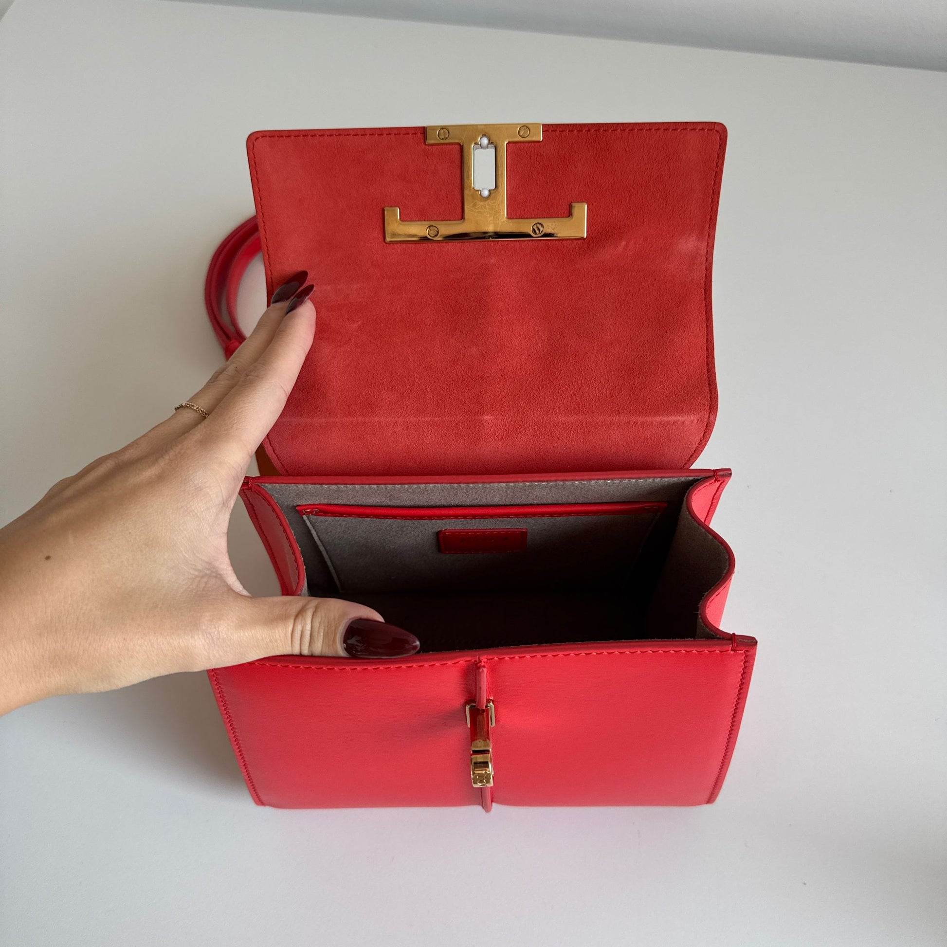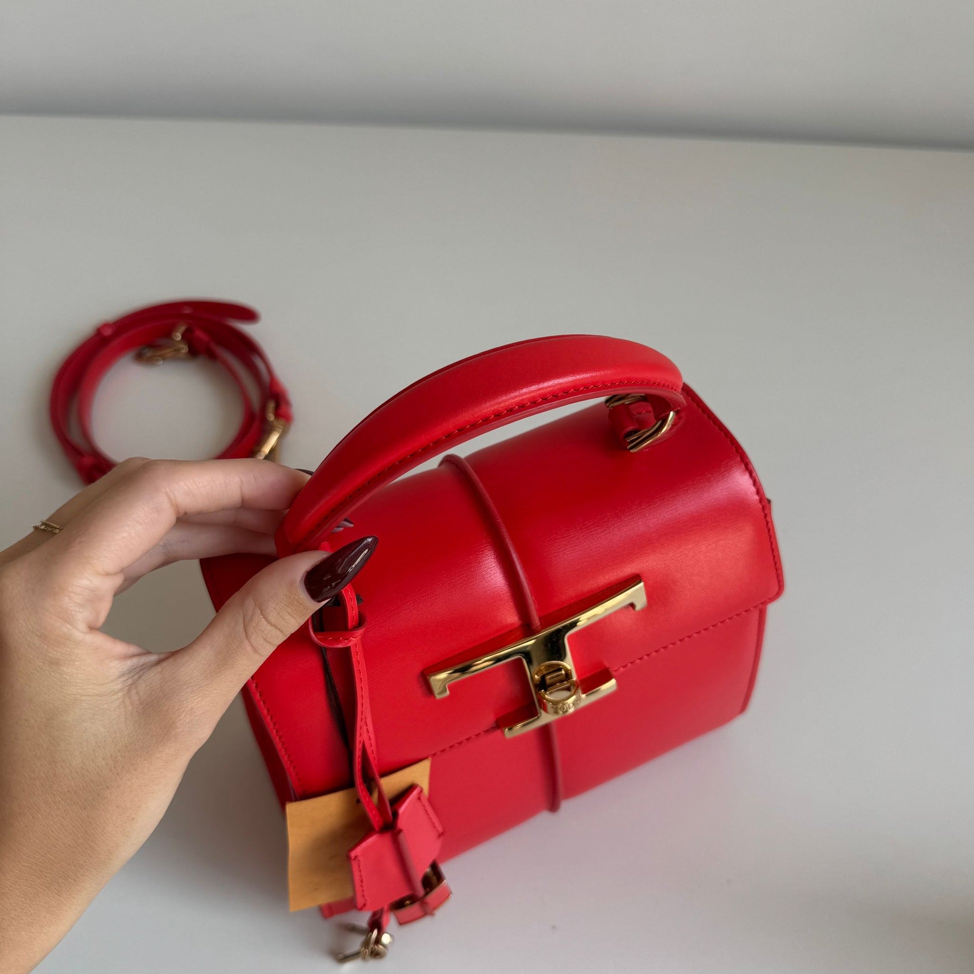 Bellissima borsa Tod’s modello T Timeless in pelle rosso corallo e hardware oro. Si indossa a mano e a tracolla la tracolla è rimovibile e regolabile