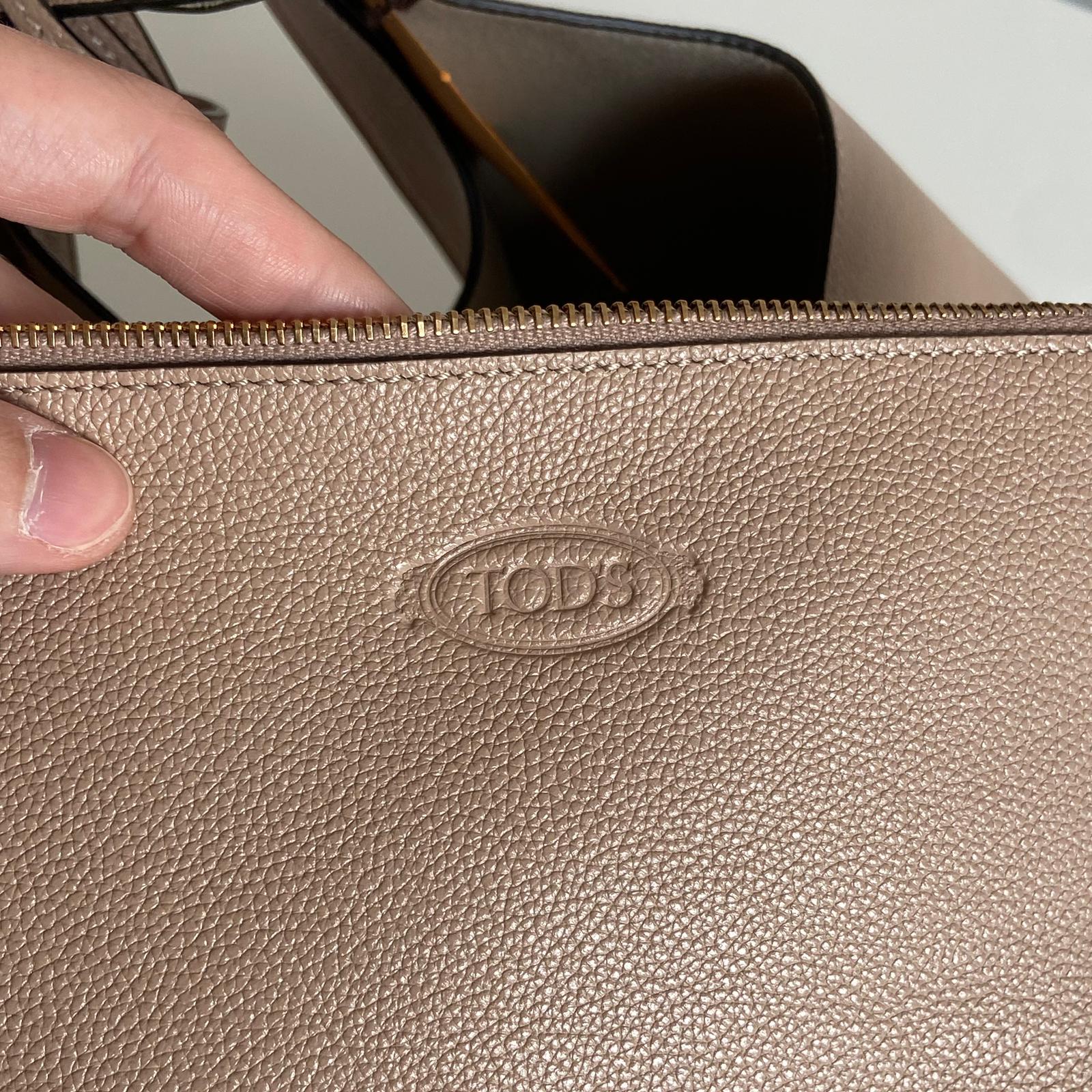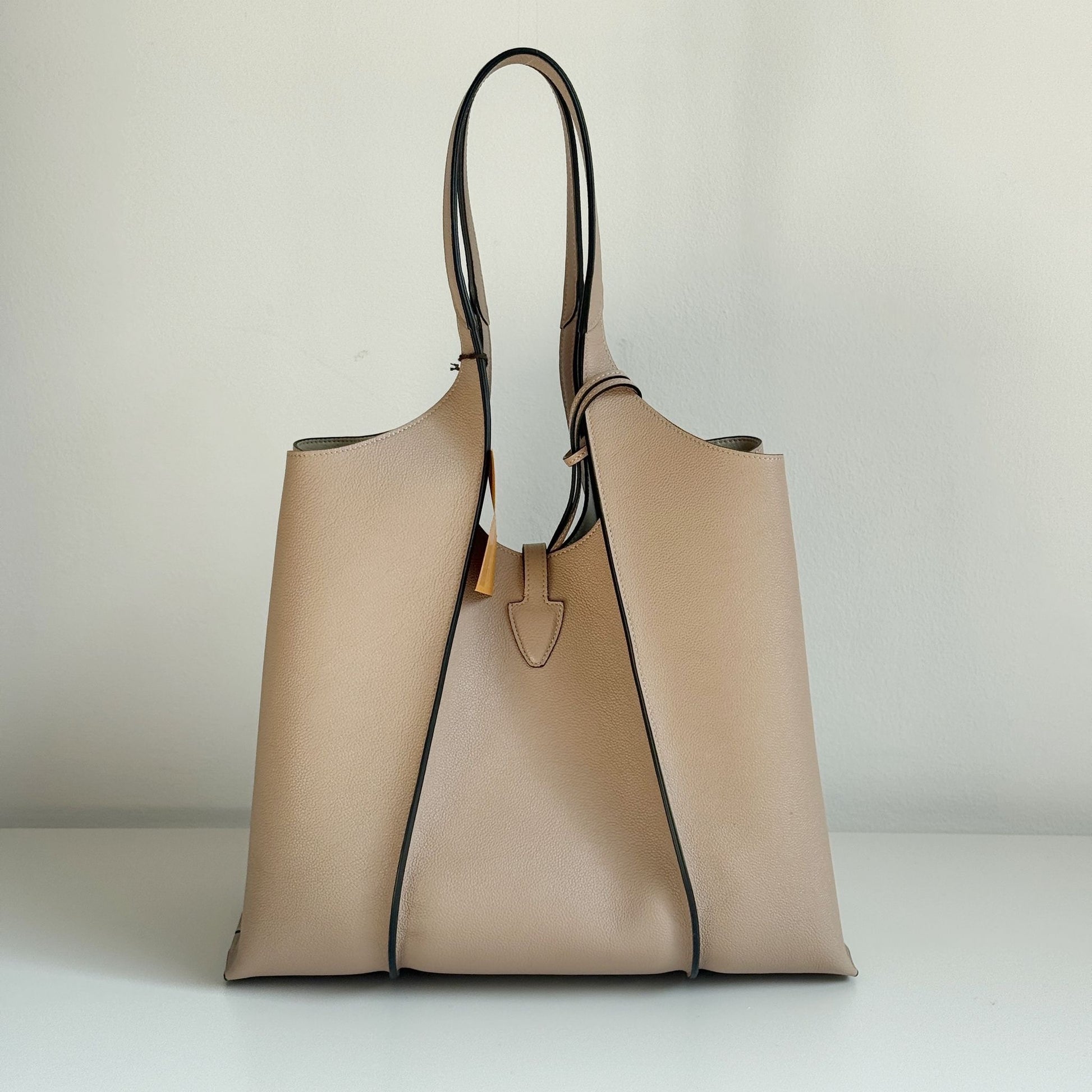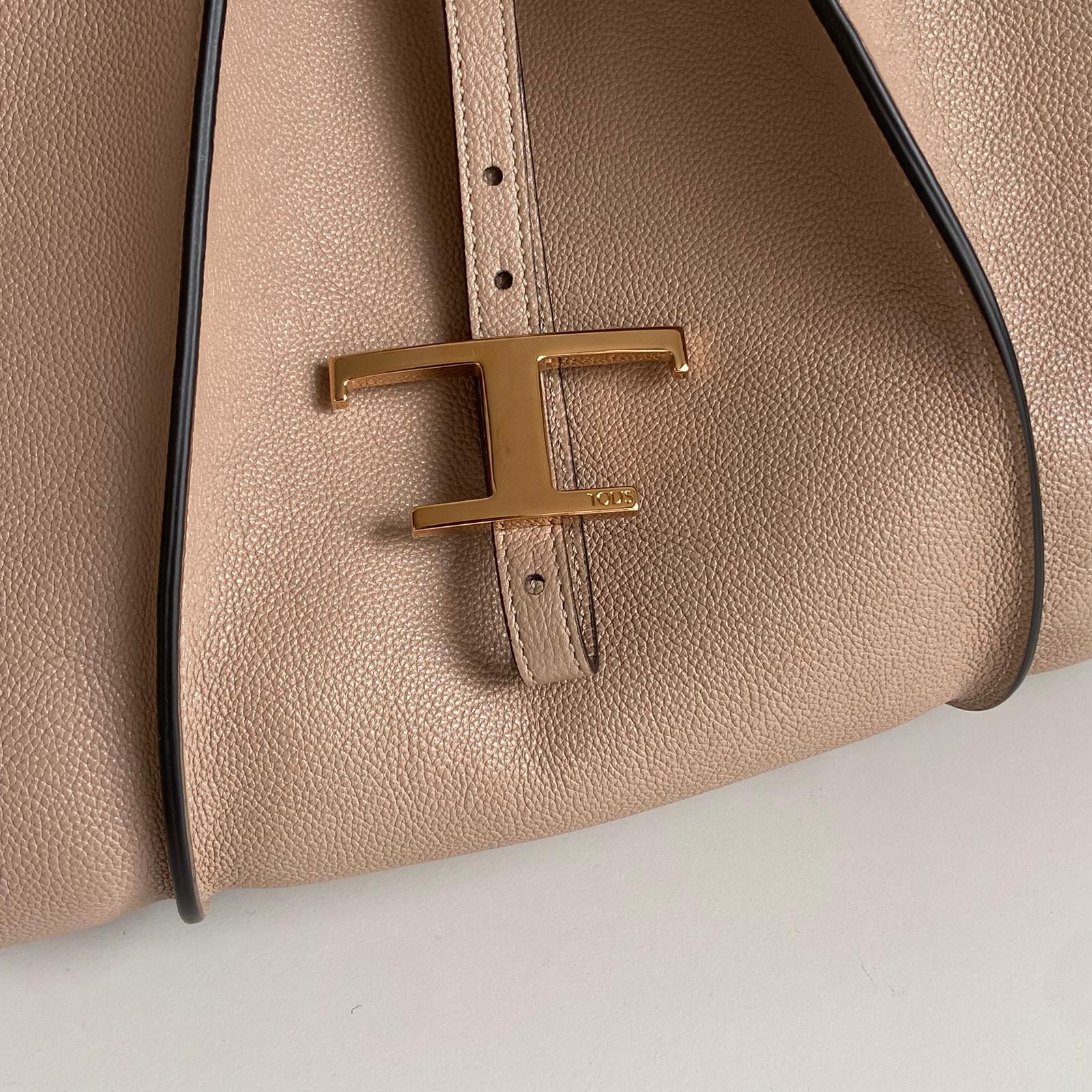 Bellissima borsa Tod’s modello T Timeless Shopping Bag in pelle beige-cipria e hardware oro. Per il colore corretto si tenga presente la prima foto. Si indossa a spalla.
