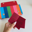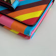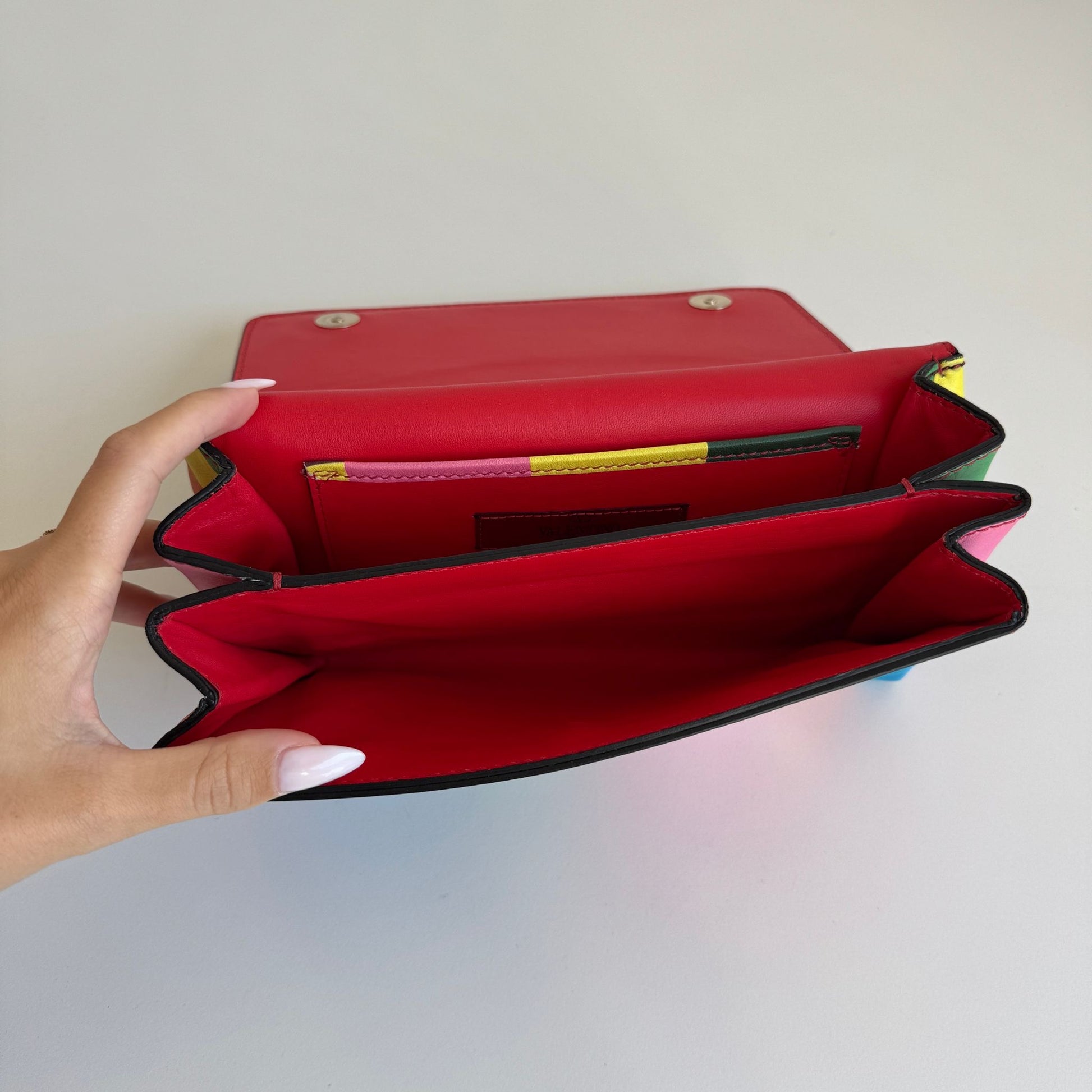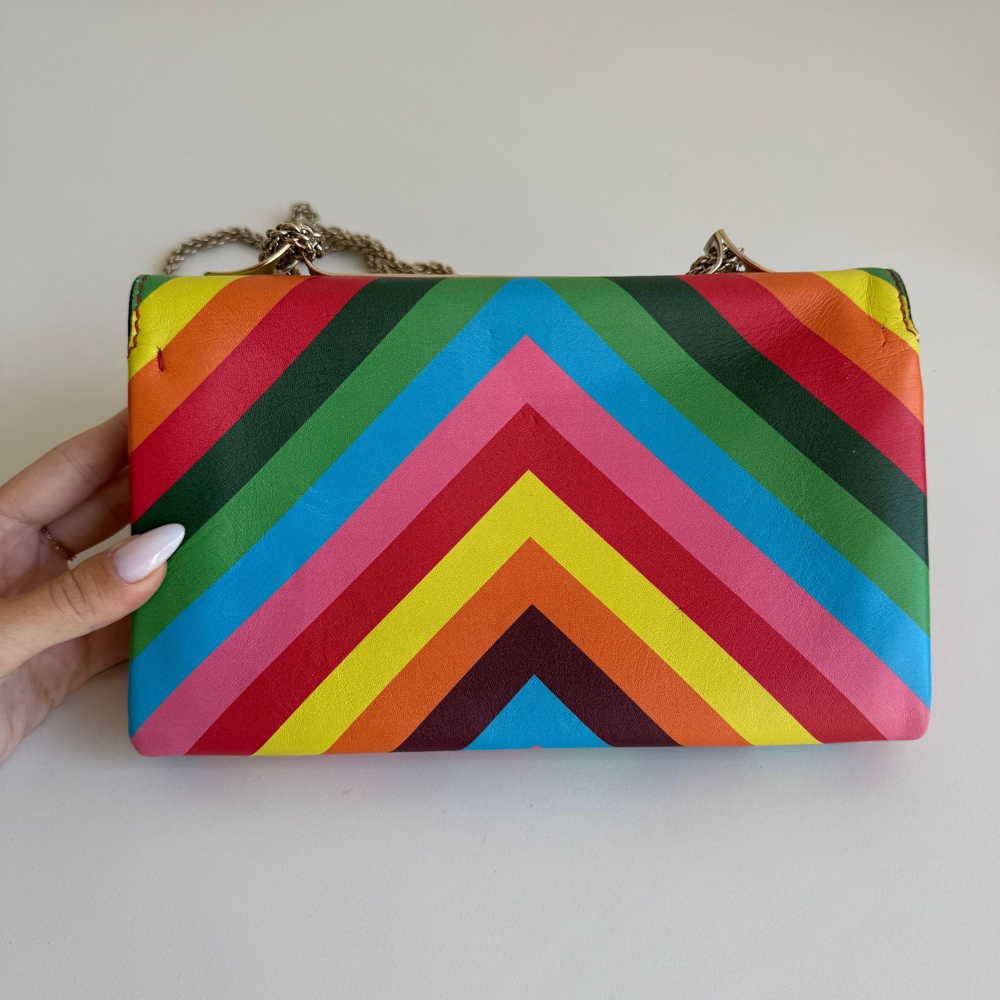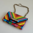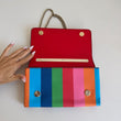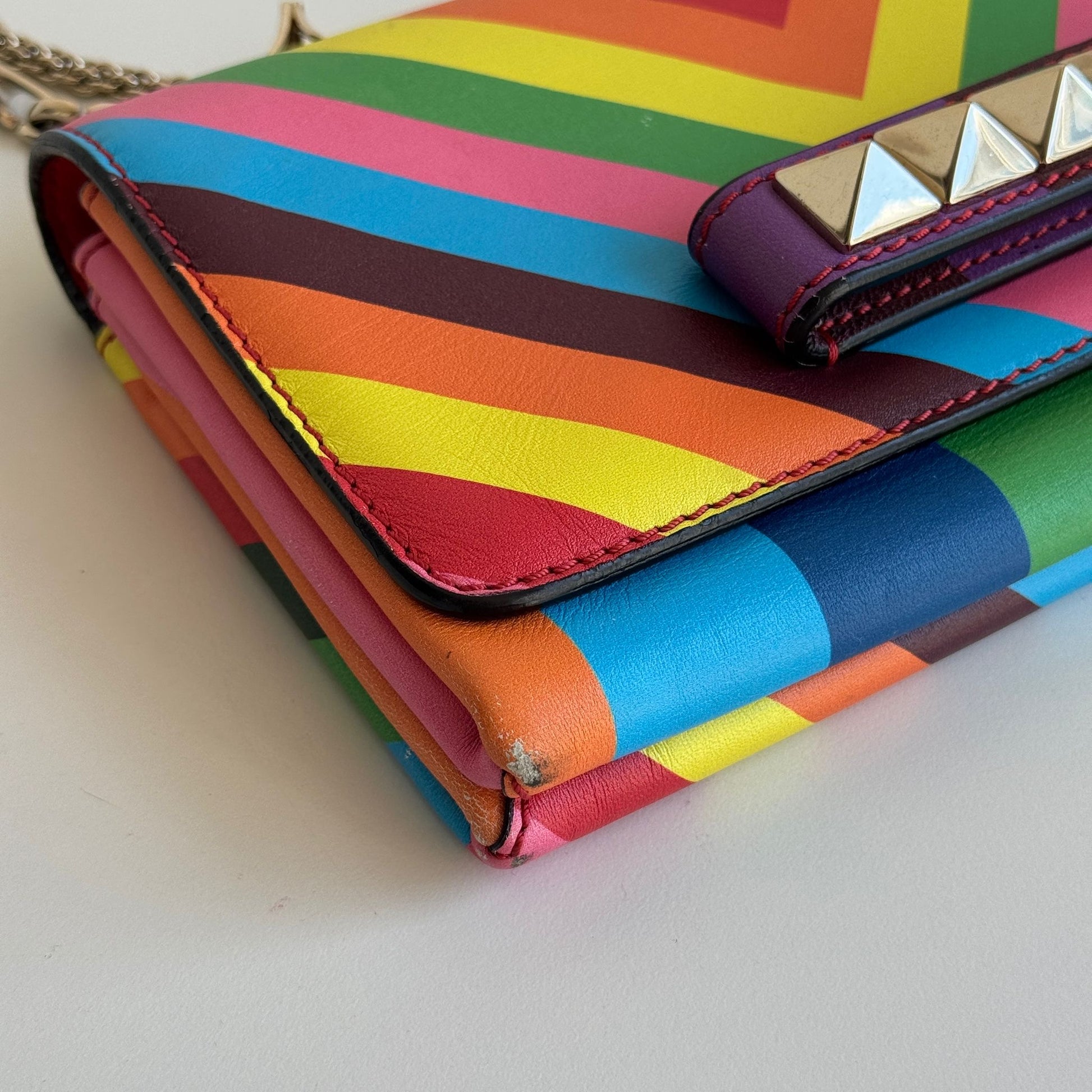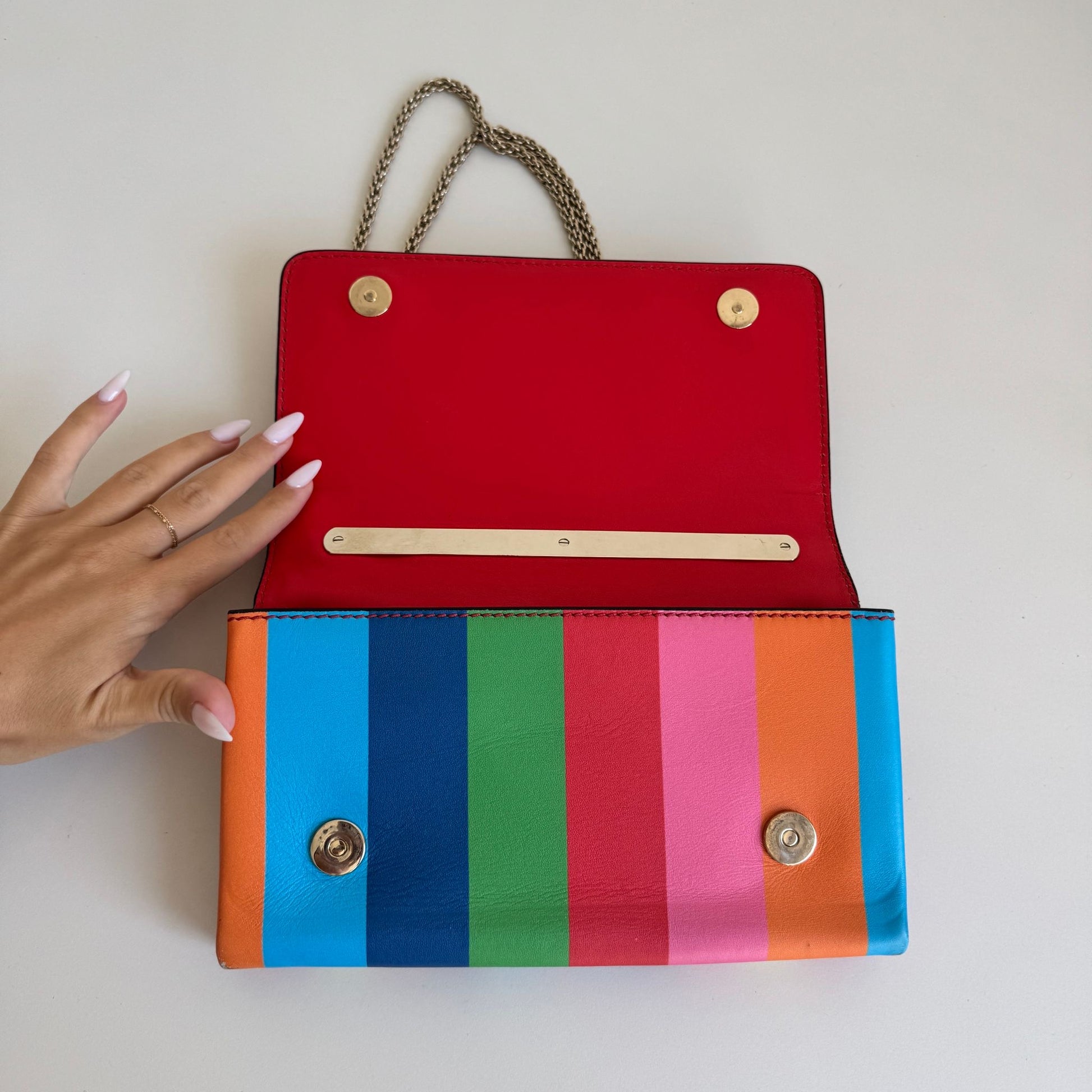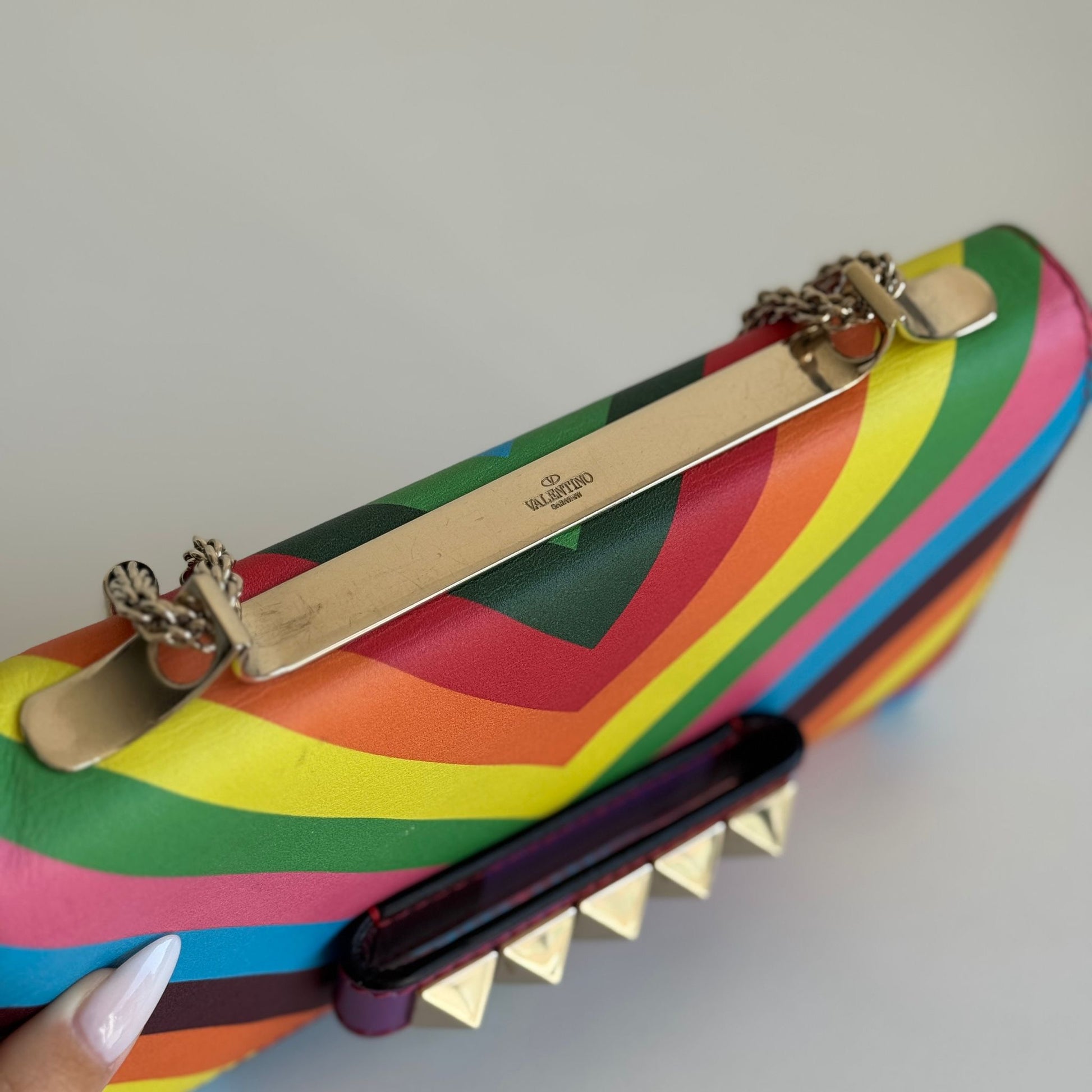 Bellissima borsa pochette di Valentino modello Ruckstud della collezione Rockstud 1973 del 2015 in pelle liscia a righe multicolor con hardware oro. Si indossa a mano, a spalla o a tracolla grazie alla tracolla in metallo rimovibile.