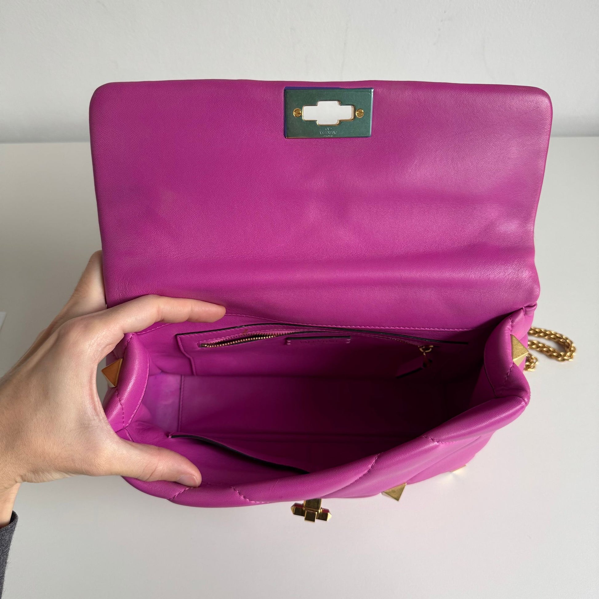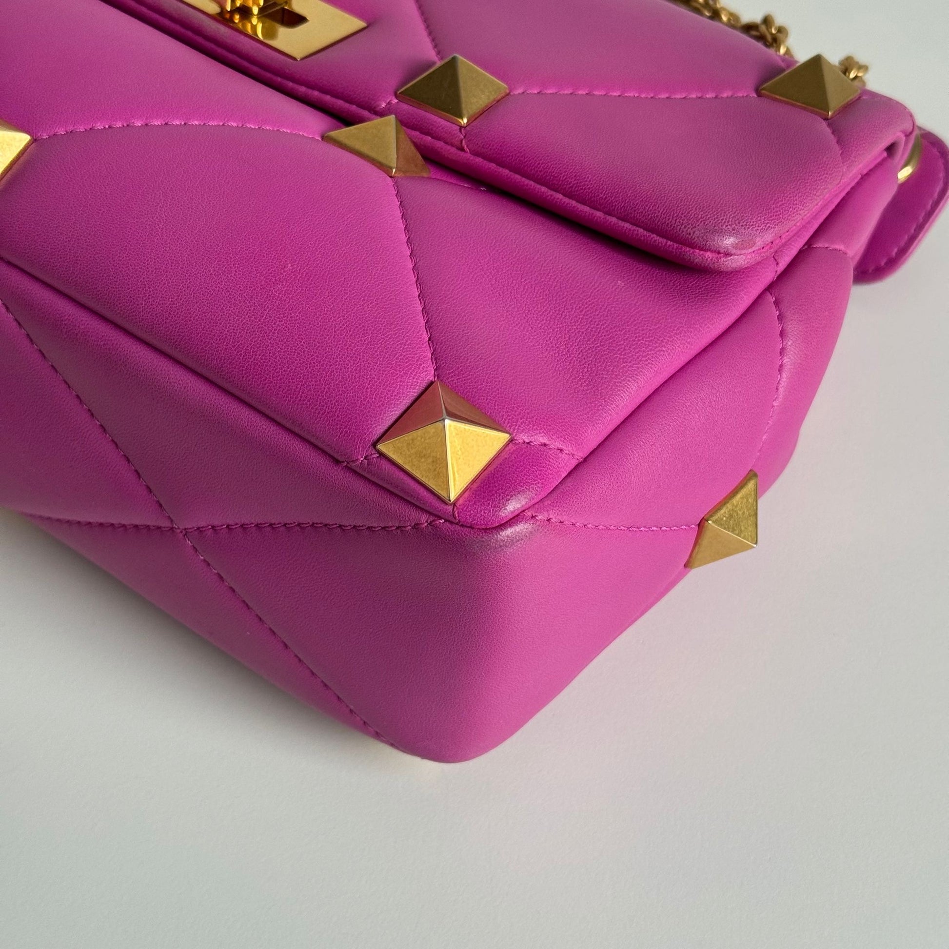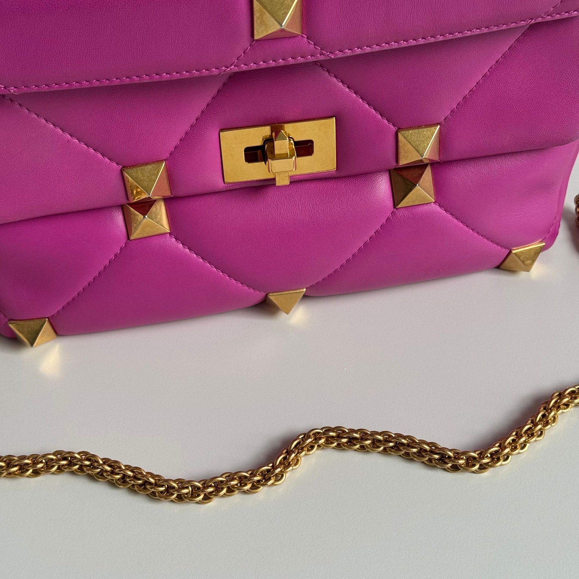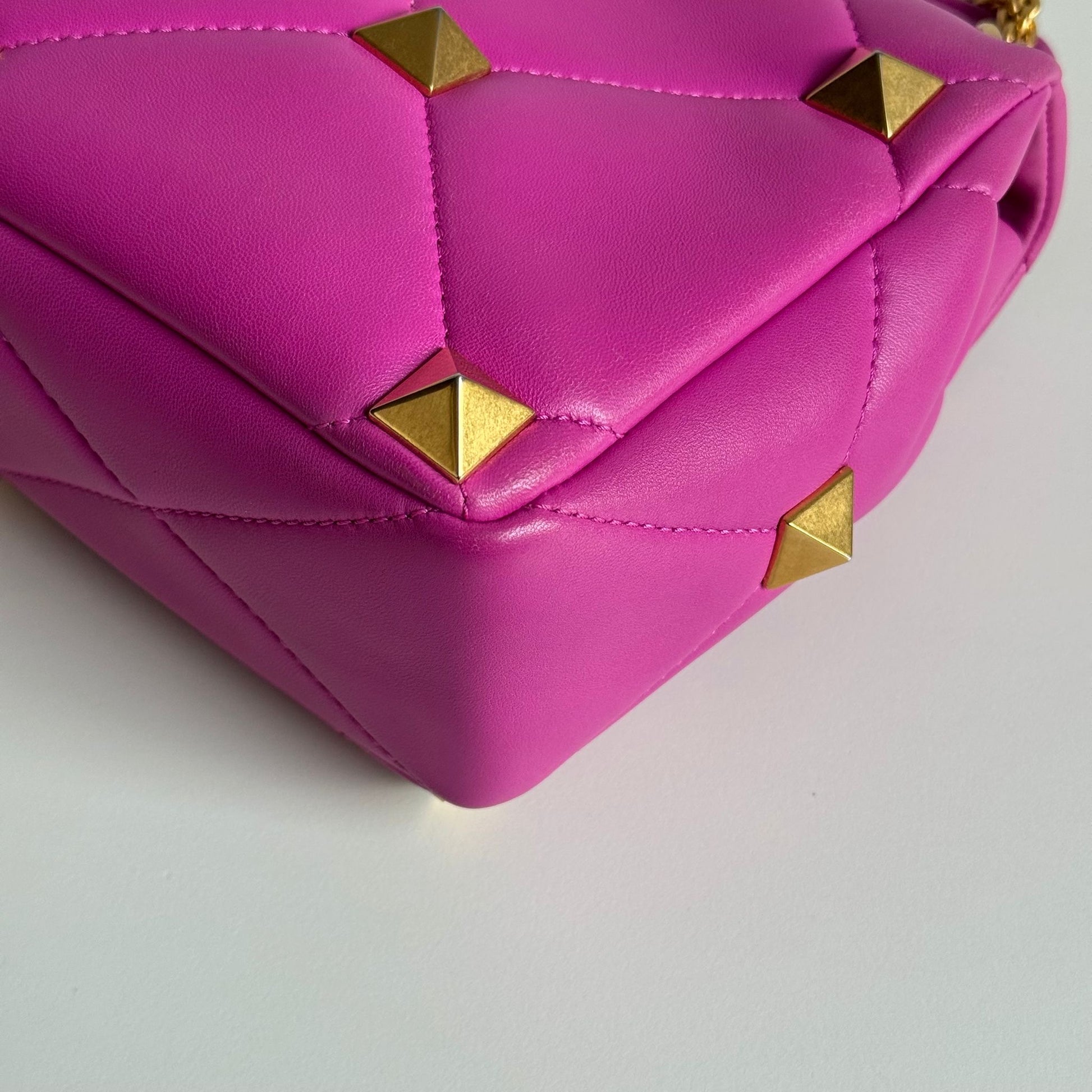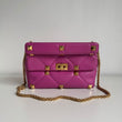 Bellissima borsa Valentino modello Roman Stud in pelle rosa scuro e hardware oro. Si indossa a mano, a spalla o a tracolla. La tracolla è rimovibile.