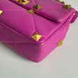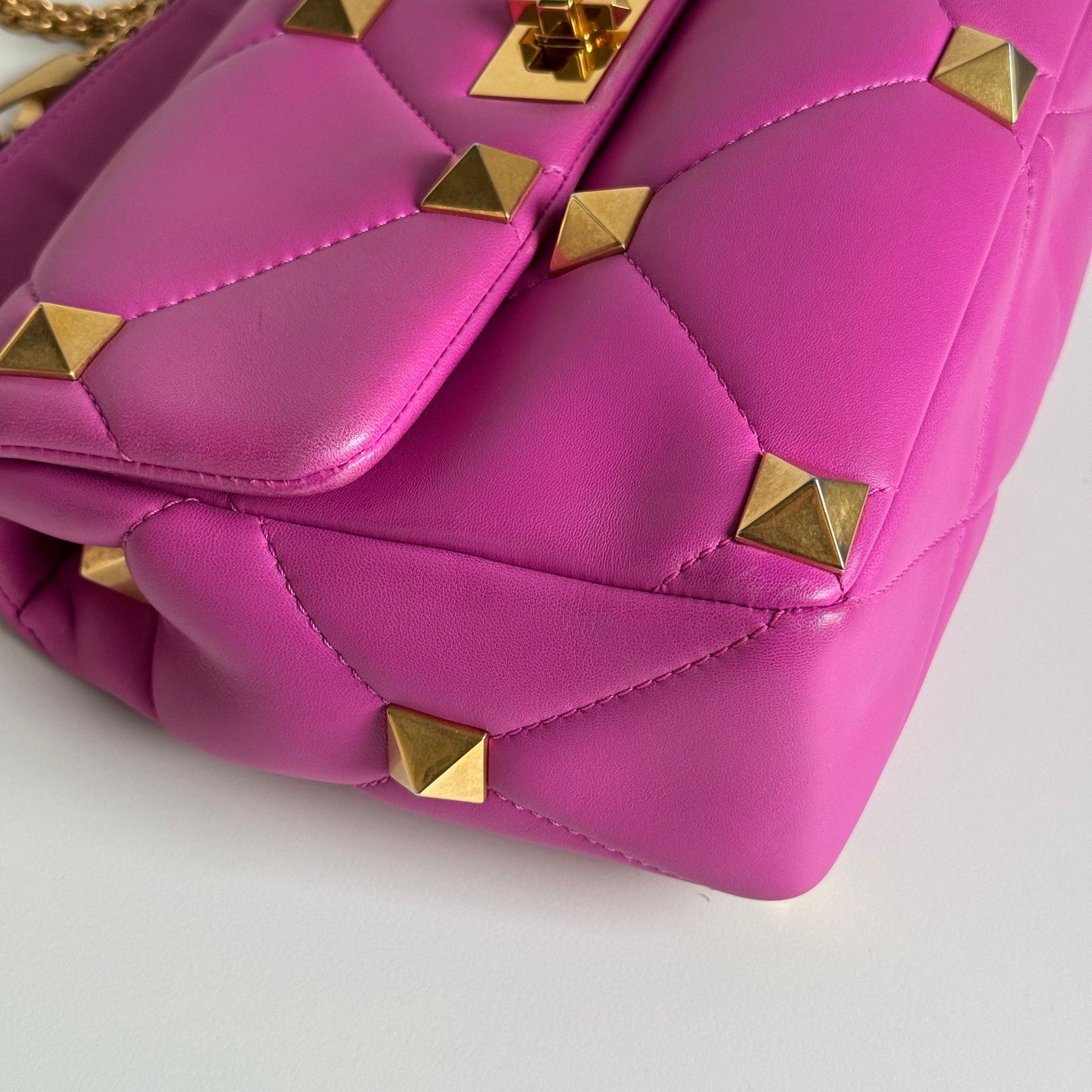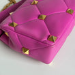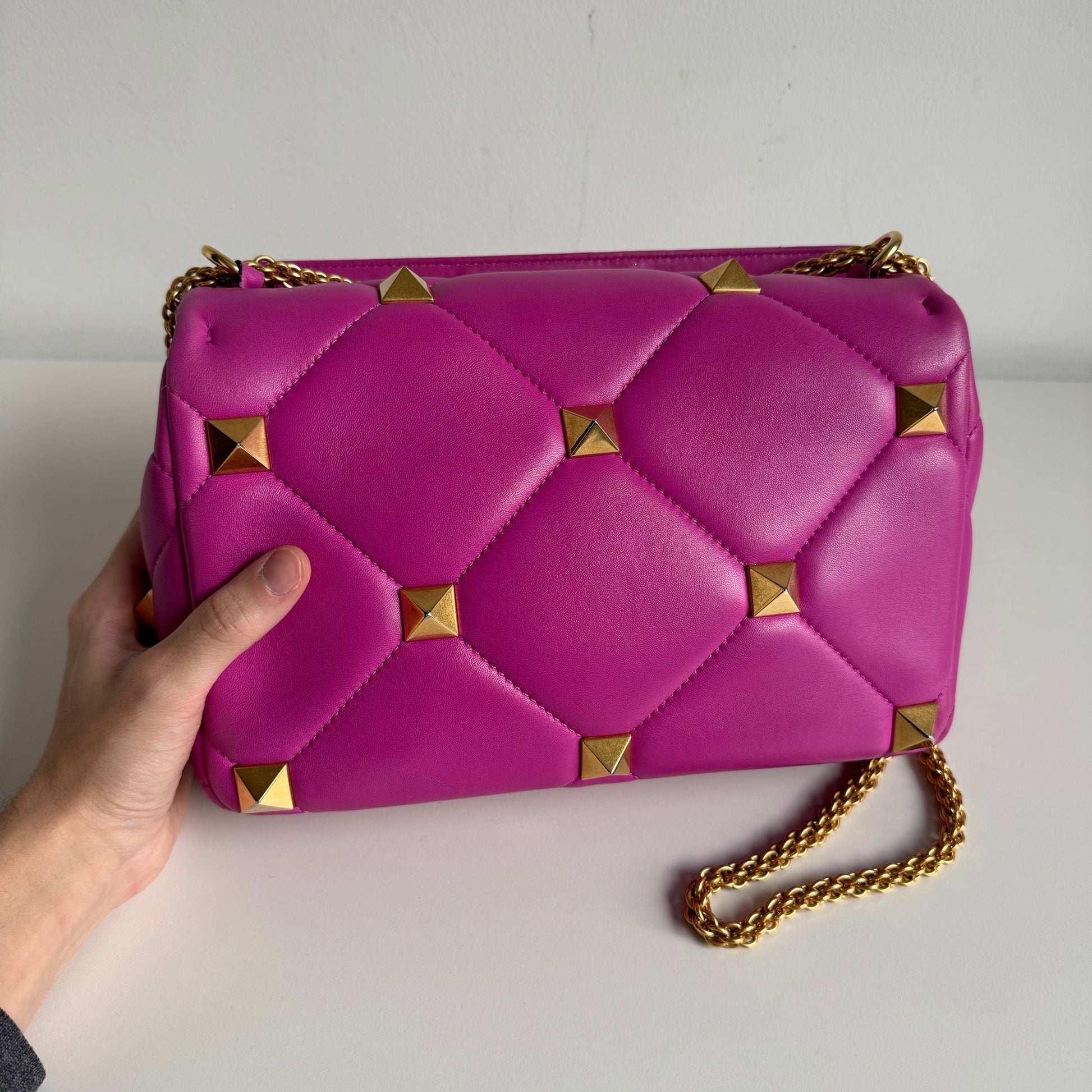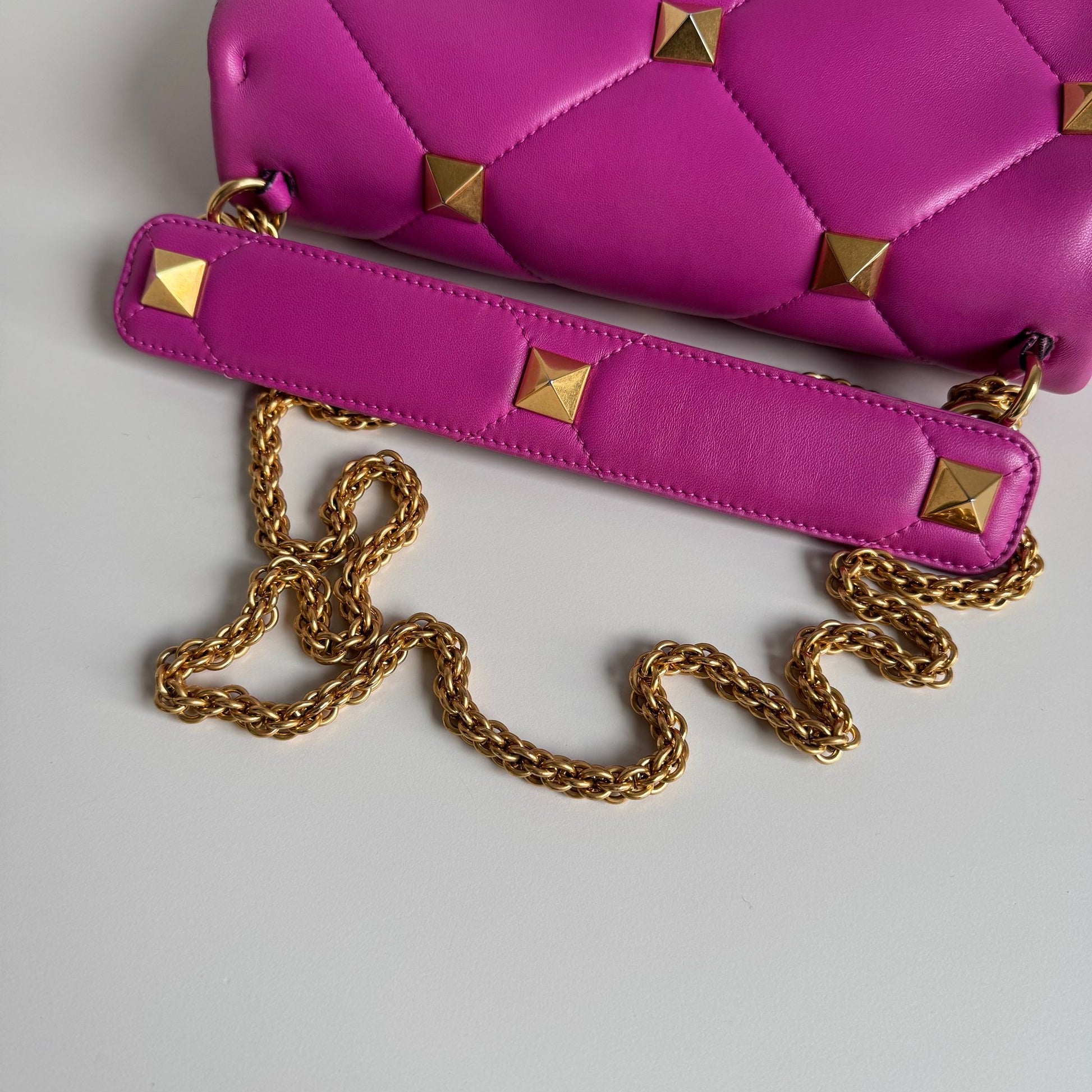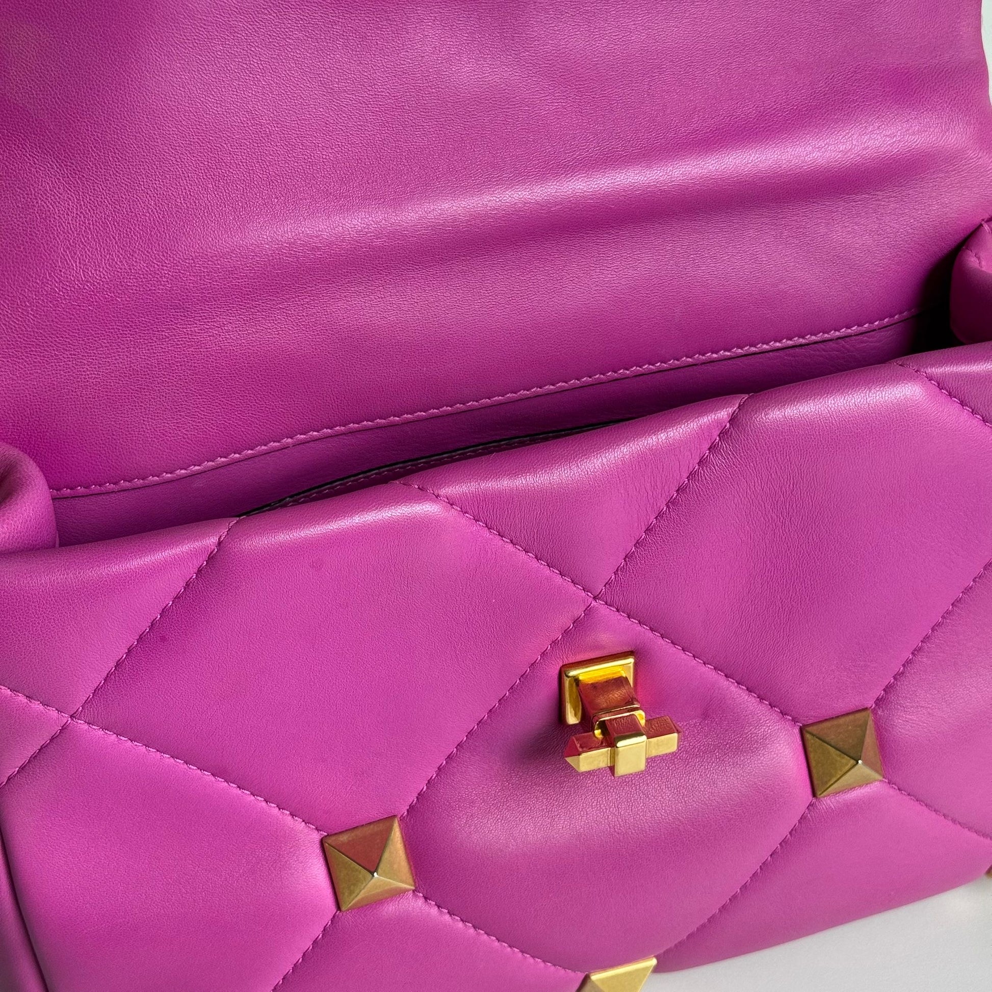 Bellissima borsa Valentino modello Roman Stud in pelle rosa scuro e hardware oro. Si indossa a mano, a spalla o a tracolla. La tracolla è rimovibile.
