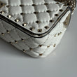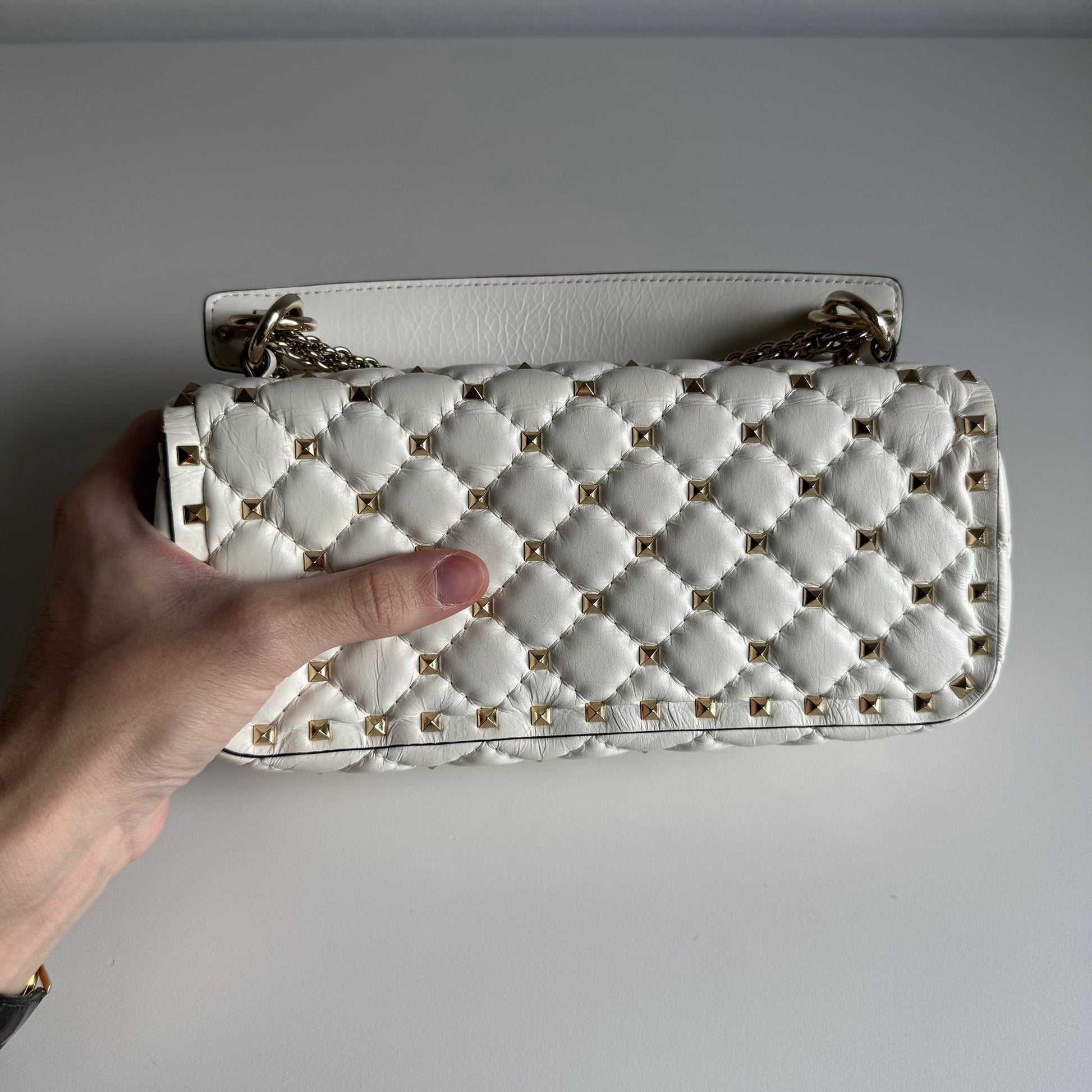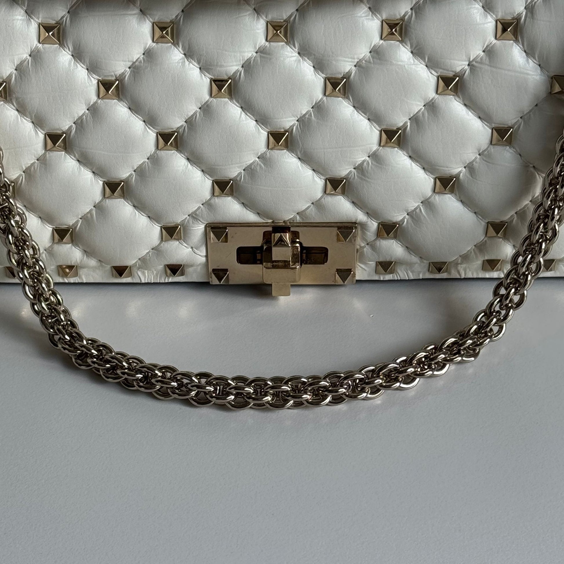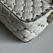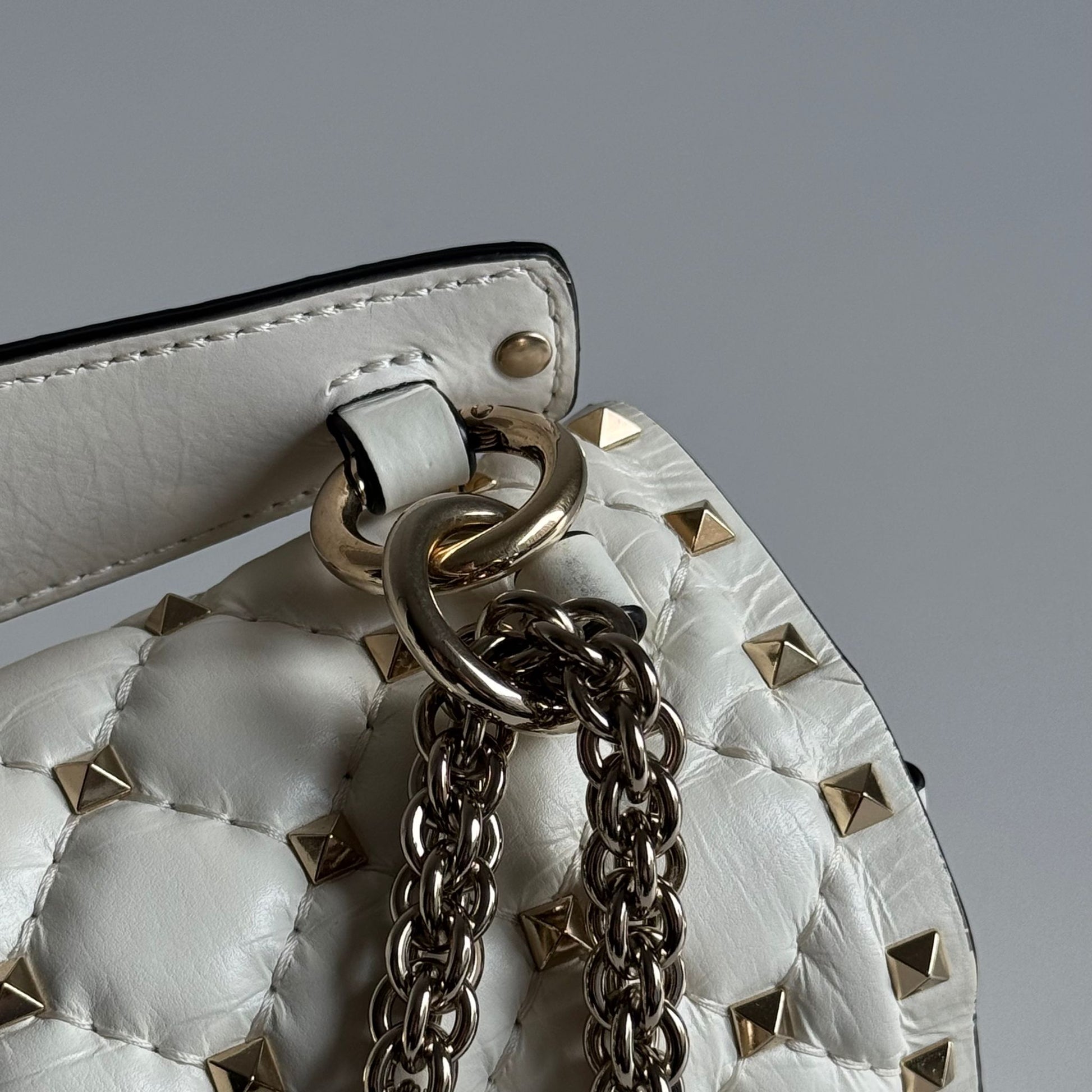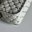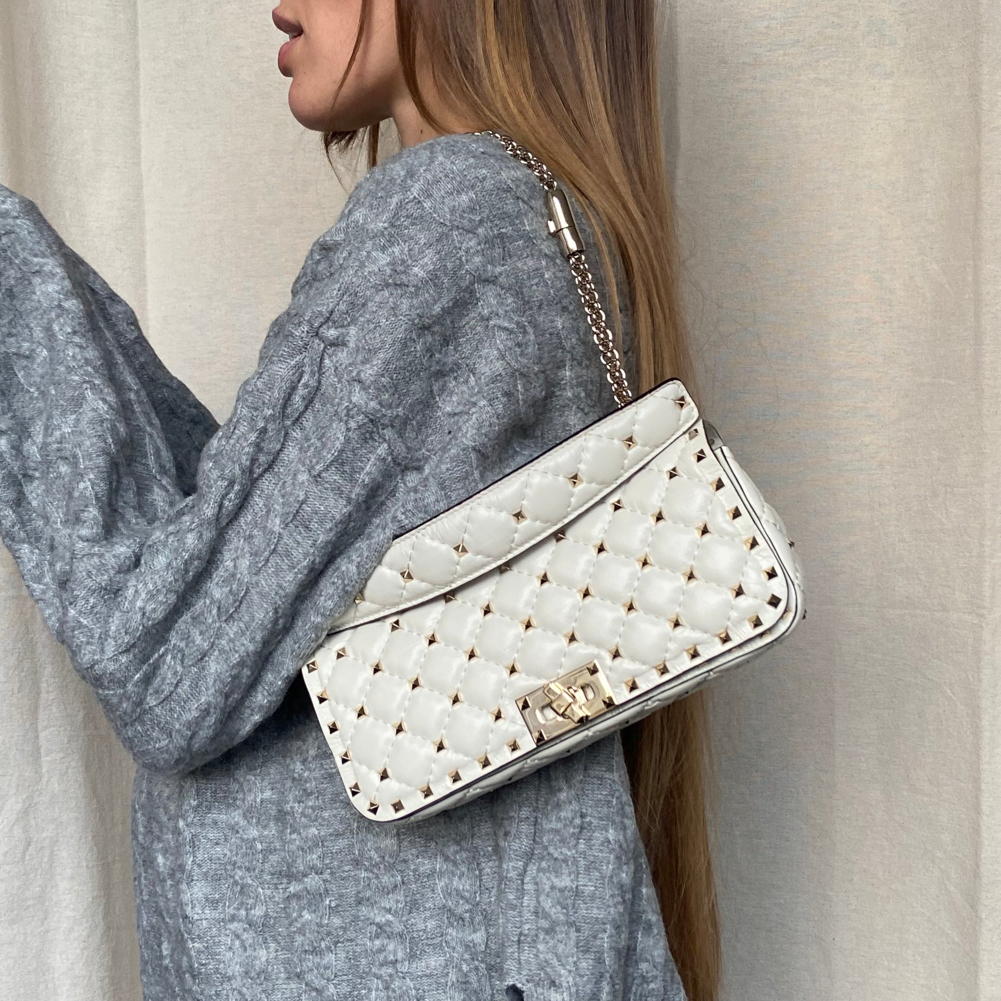 Iconica borsa Valentino modello Spike in pelle bianca-avorio effetto stropicciato e hardware oro chiaro. Si indossa a mano a spalla e a tracolla entrambi le opzioni sono rimovibili ma non regolabili.