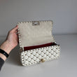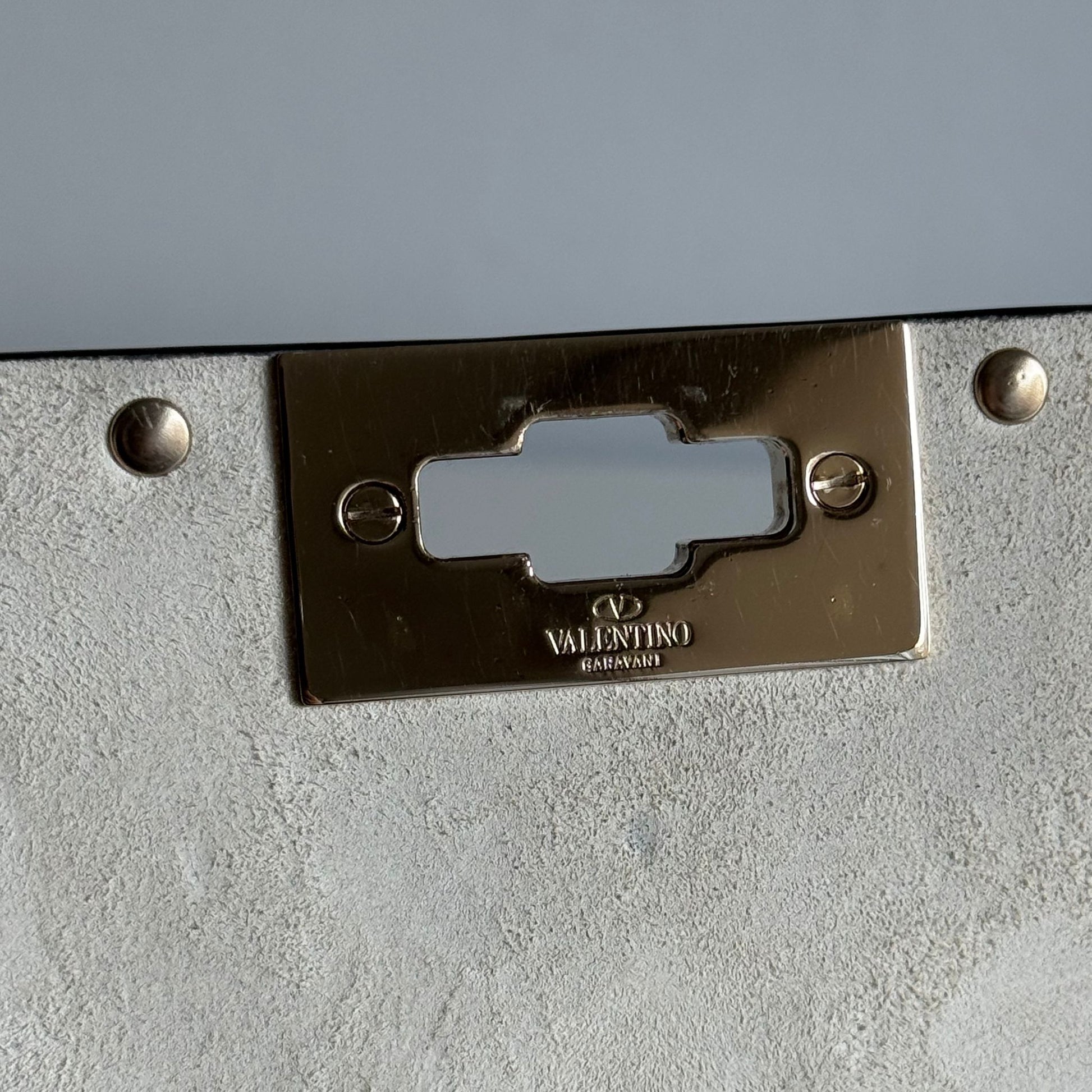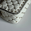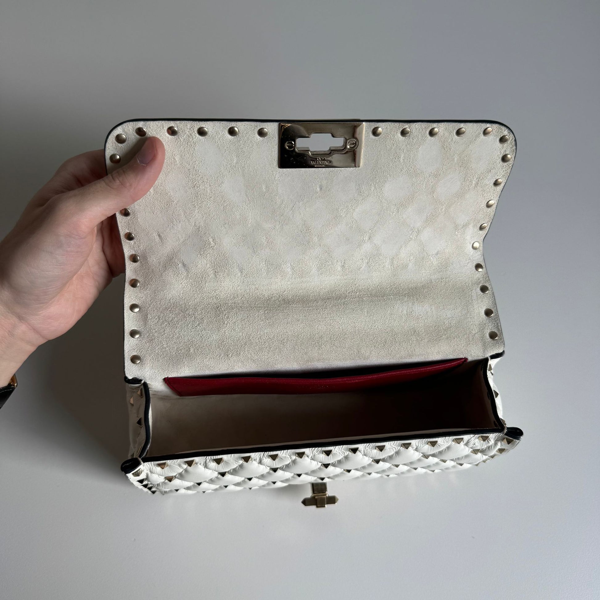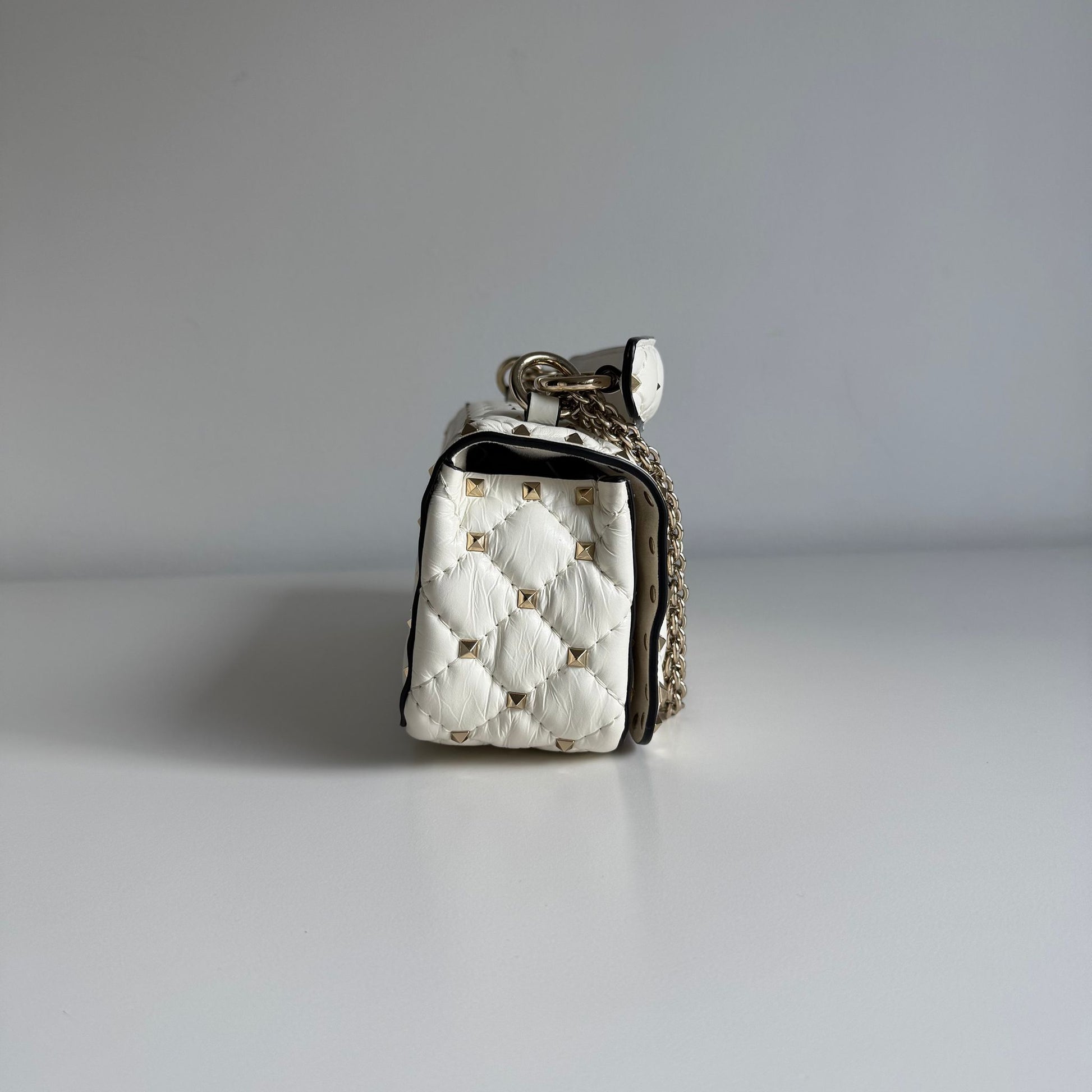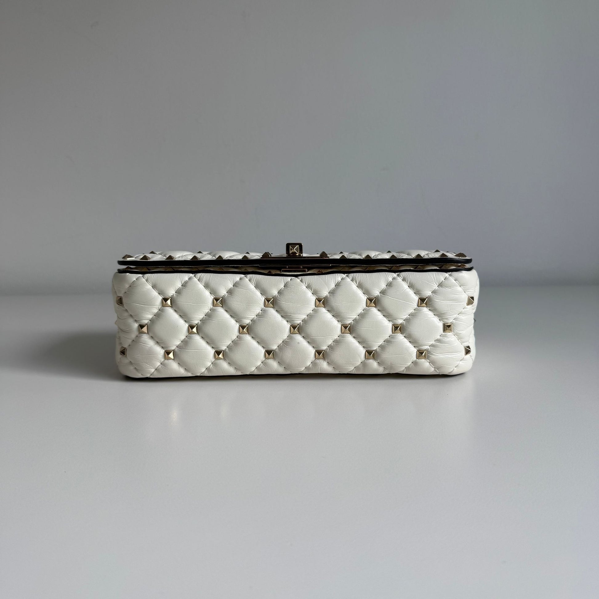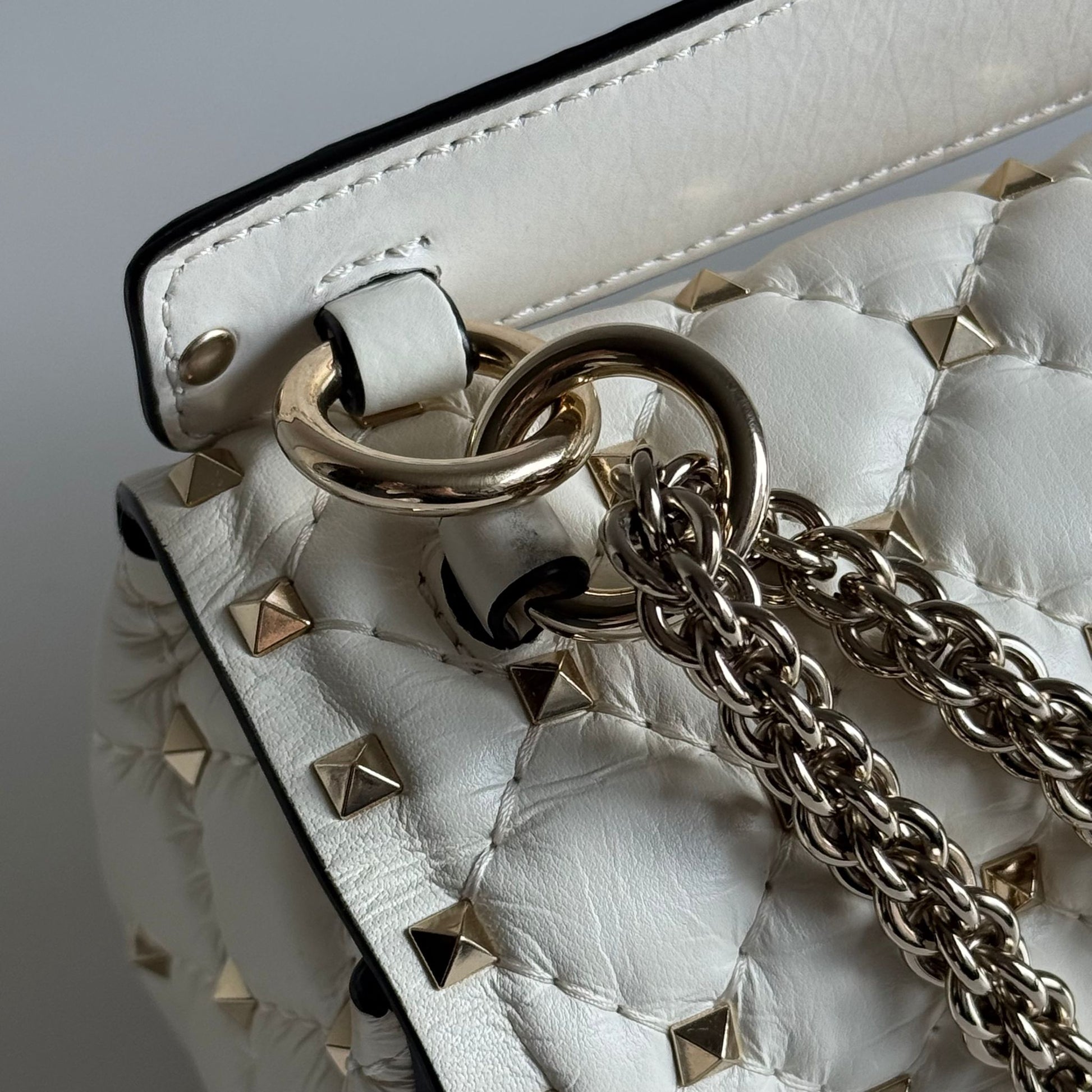 Iconica borsa Valentino modello Spike in pelle bianca-avorio effetto stropicciato e hardware oro chiaro. Si indossa a mano a spalla e a tracolla entrambi le opzioni sono rimovibili ma non regolabili.