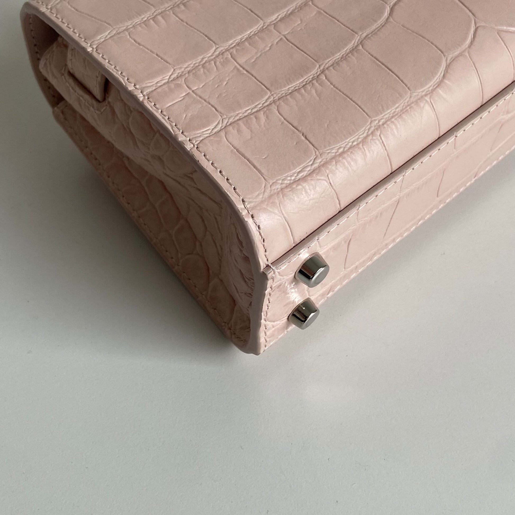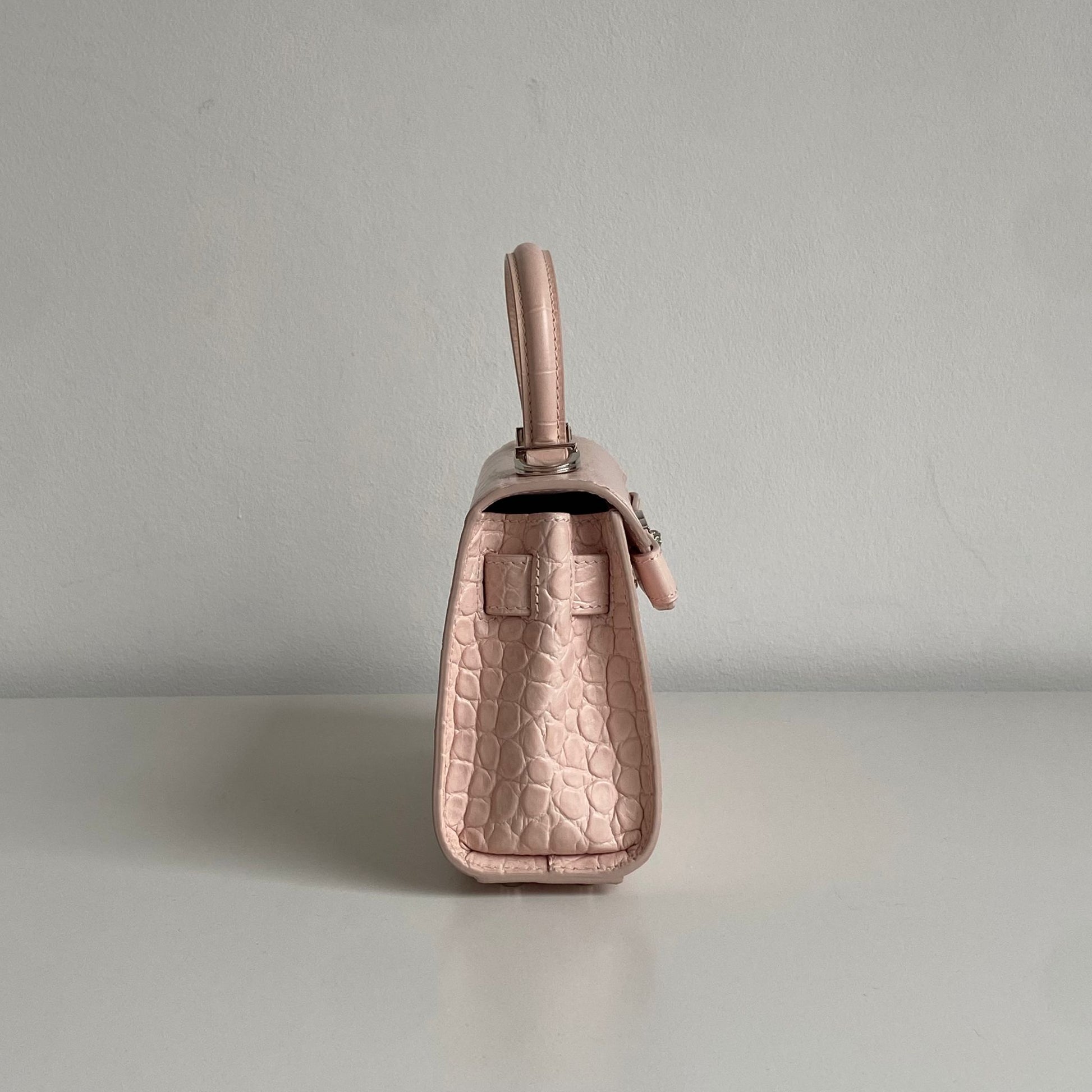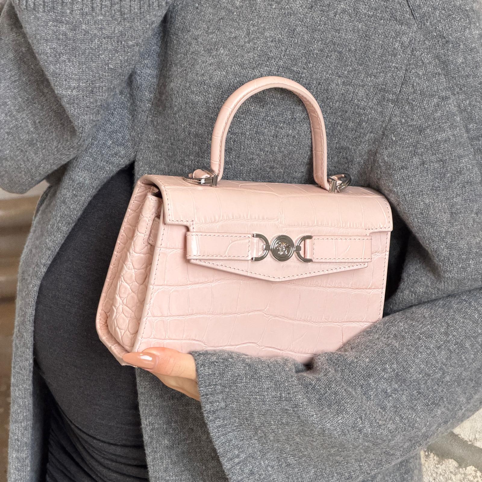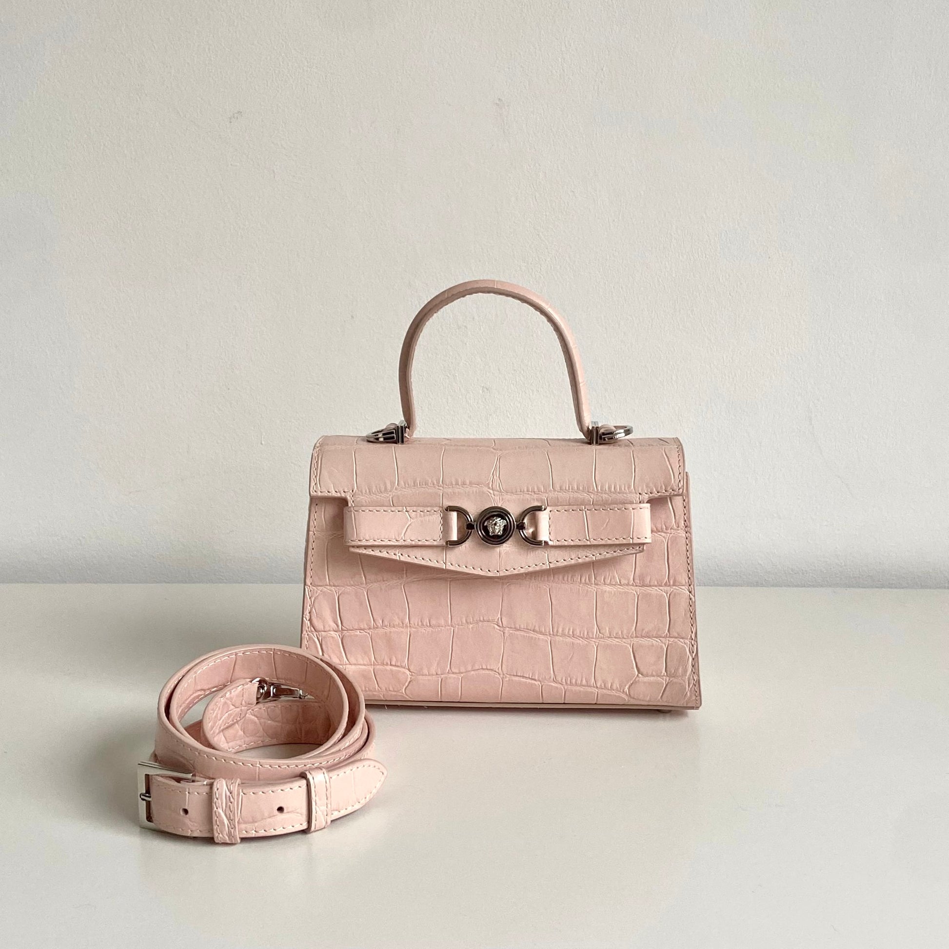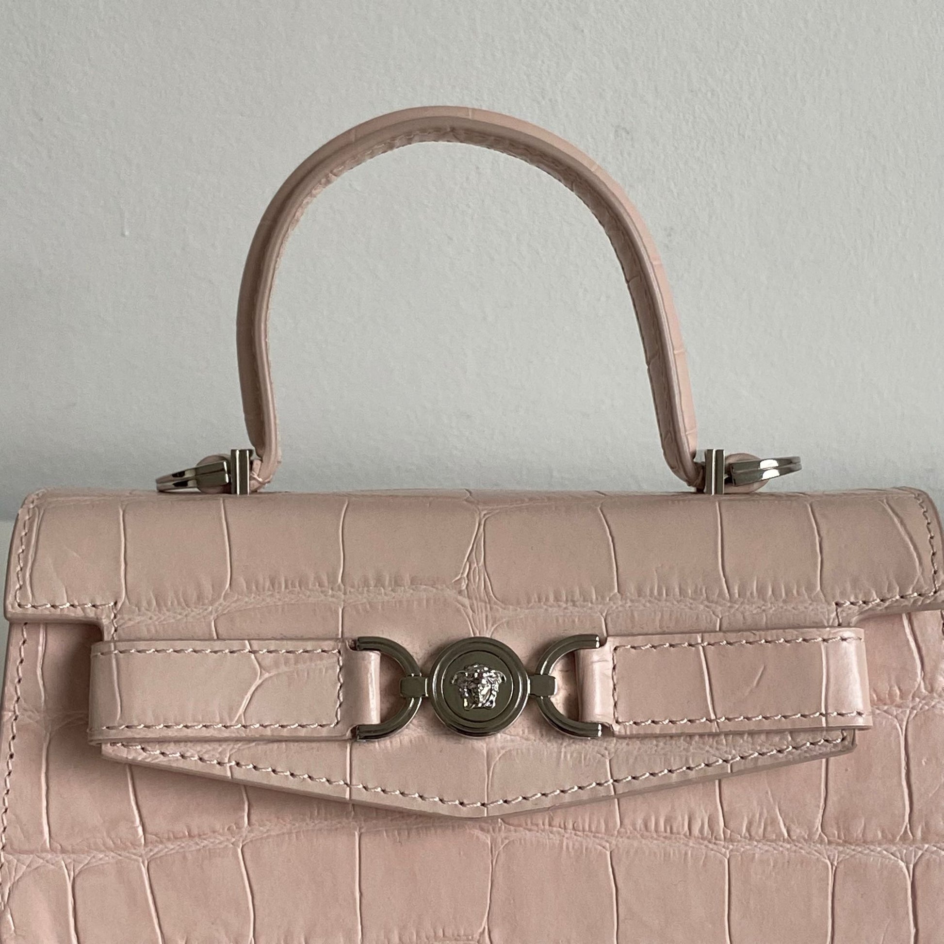 Bellissima borsa a mano Versace Medusa '95 in pelle croco rosa chiaro e hardware argento. Si indossa a mano e a tracolla, la tracolla è rimovibile e regolabile.