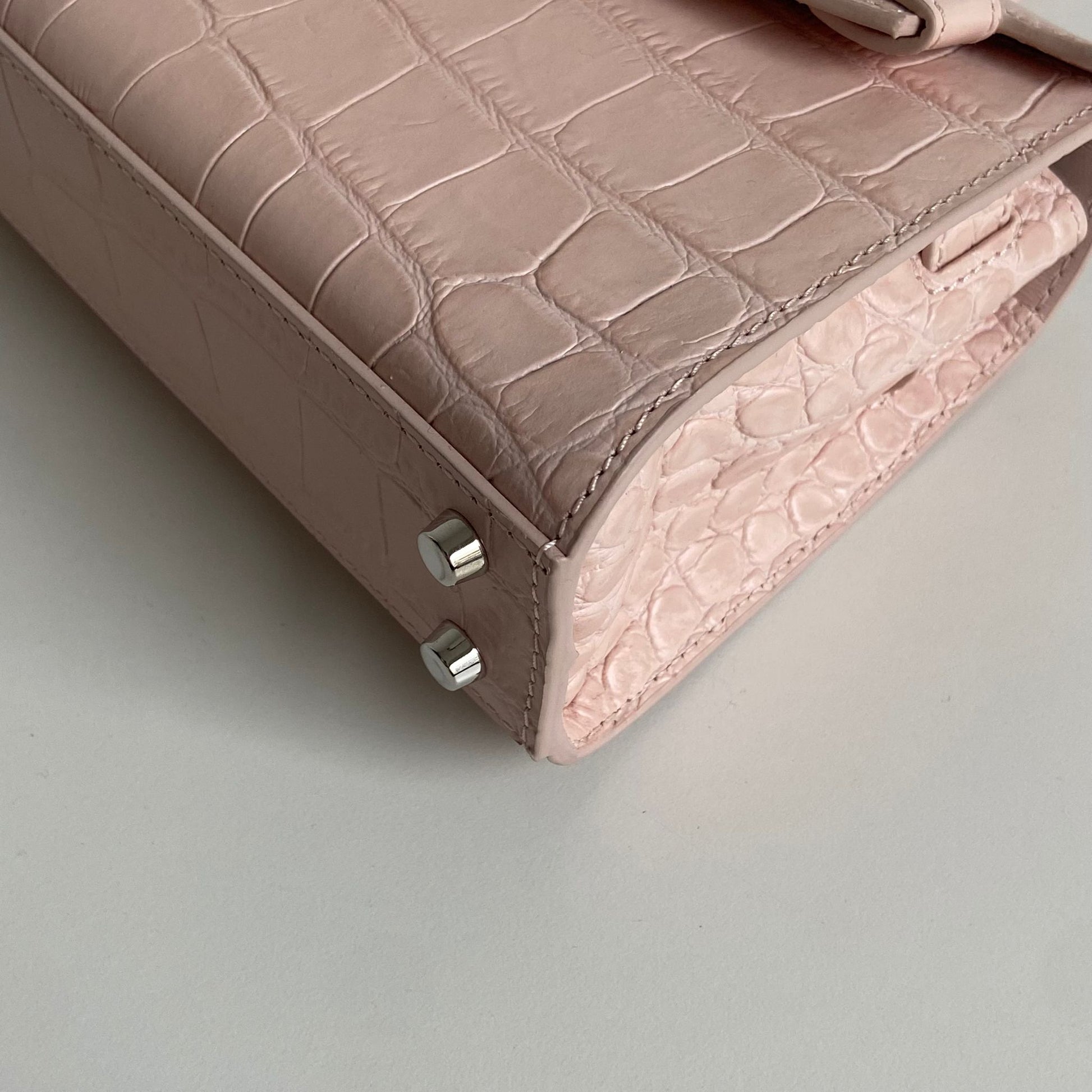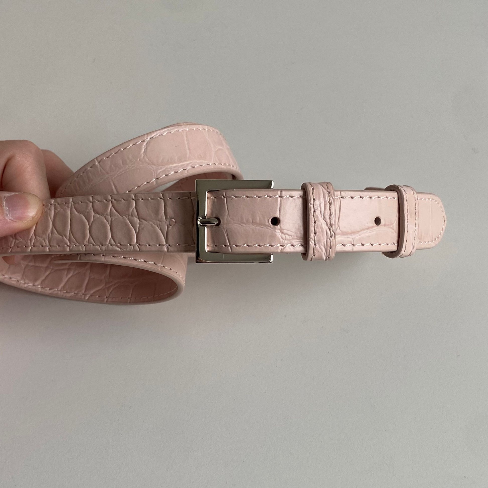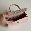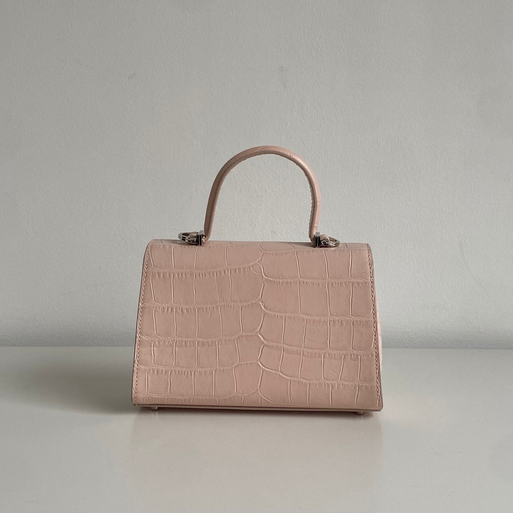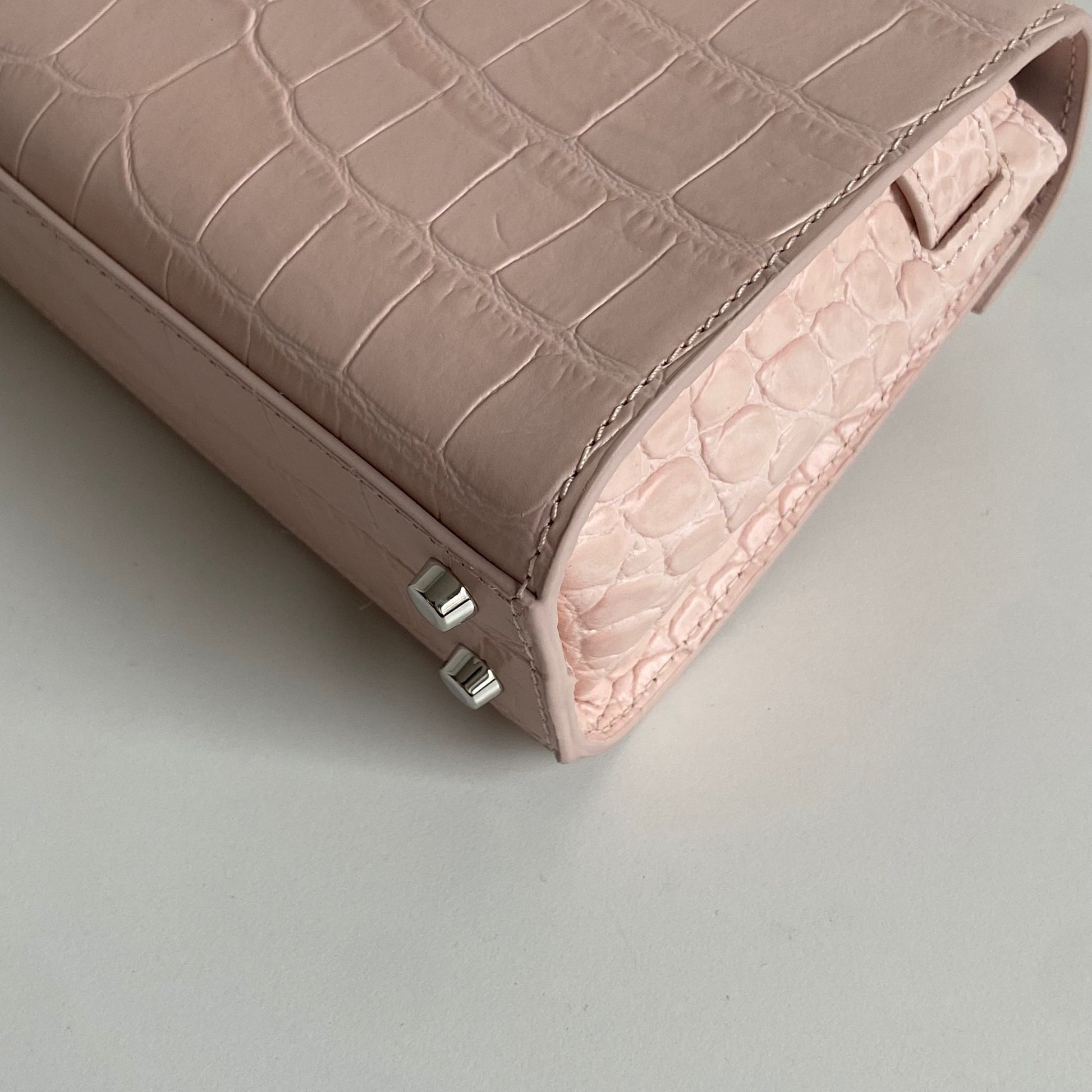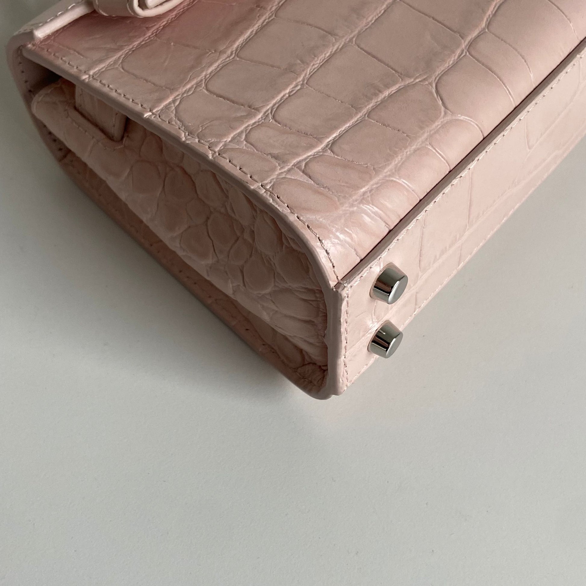 Bellissima borsa a mano Versace Medusa '95 in pelle croco rosa chiaro e hardware argento. Si indossa a mano e a tracolla, la tracolla è rimovibile e regolabile.