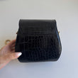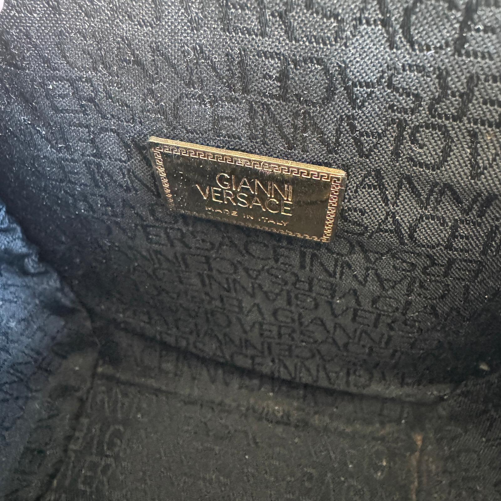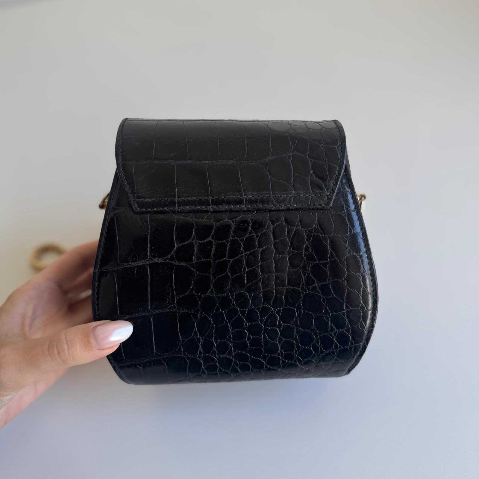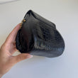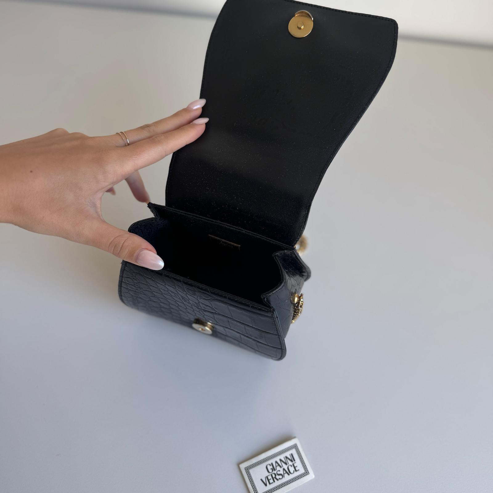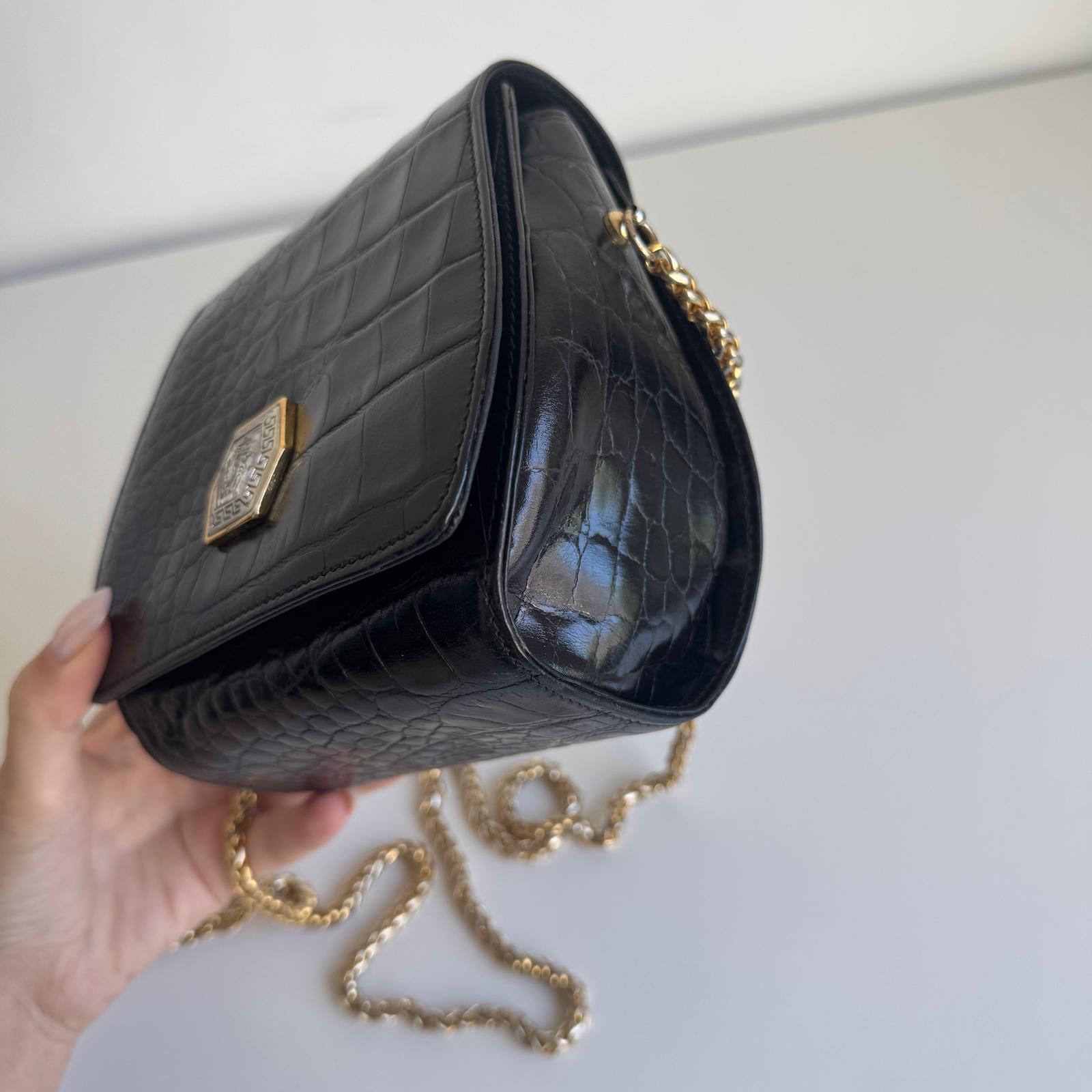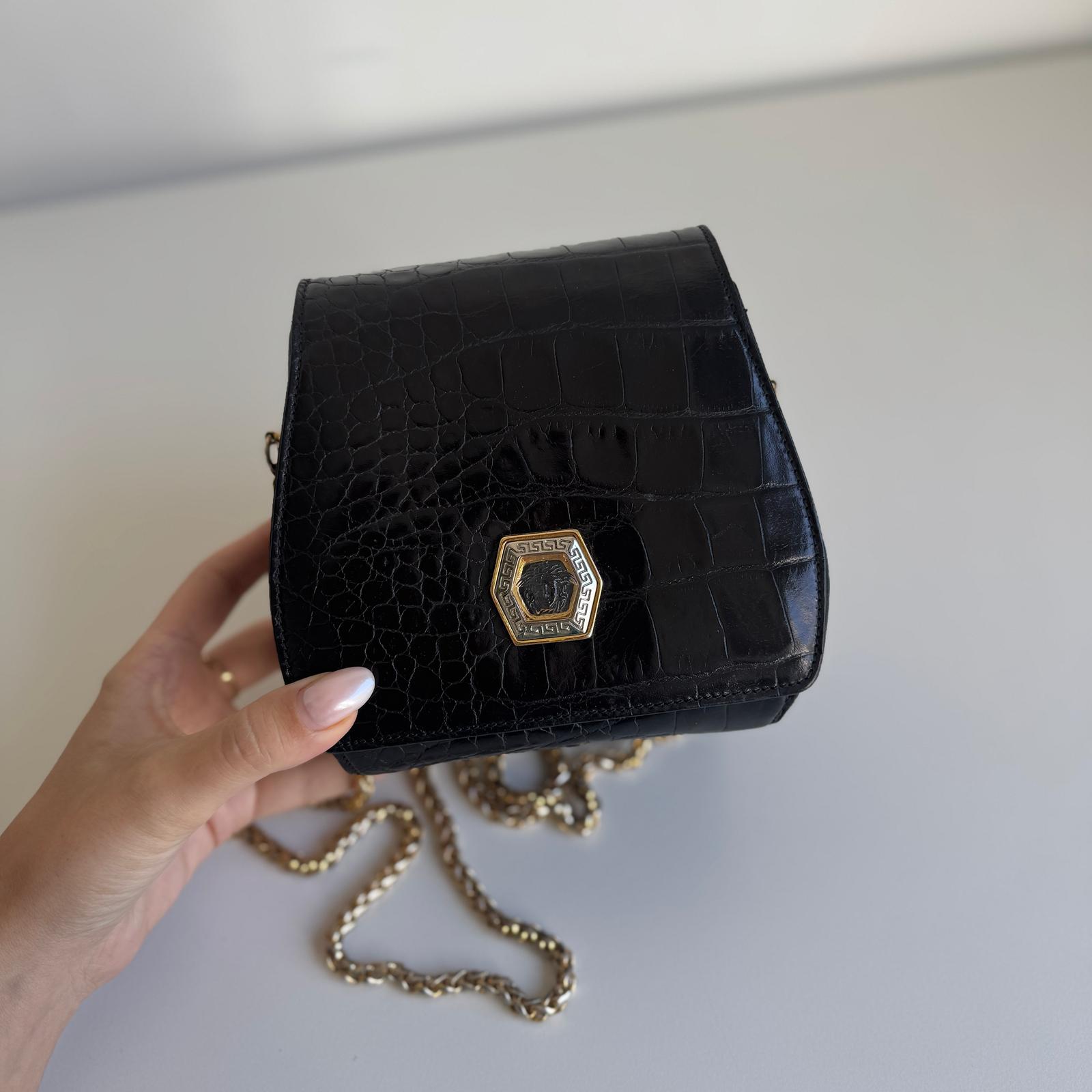 Adorabile mini Bag Gianni Versace vintage in pelle croco e hardware oro, con logo Medusa trasparente. Si indossa a tracolla.