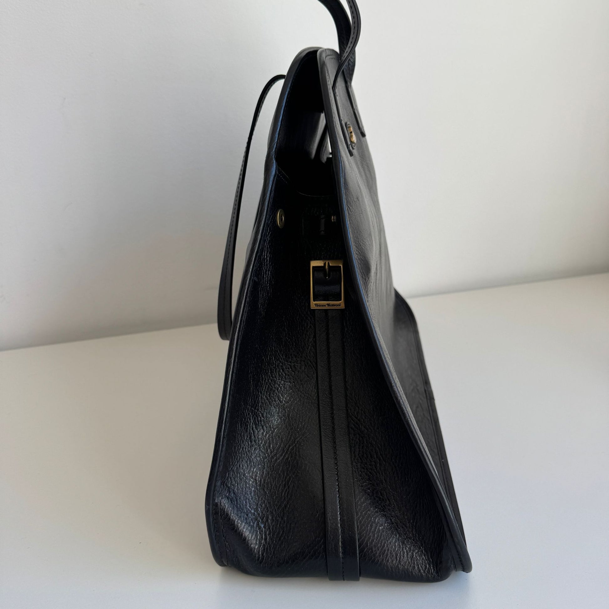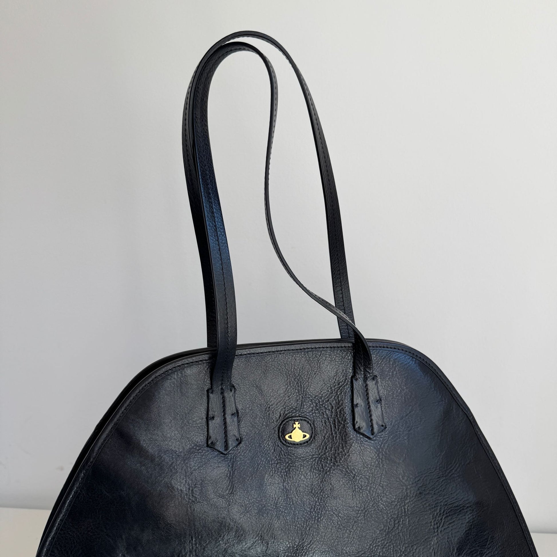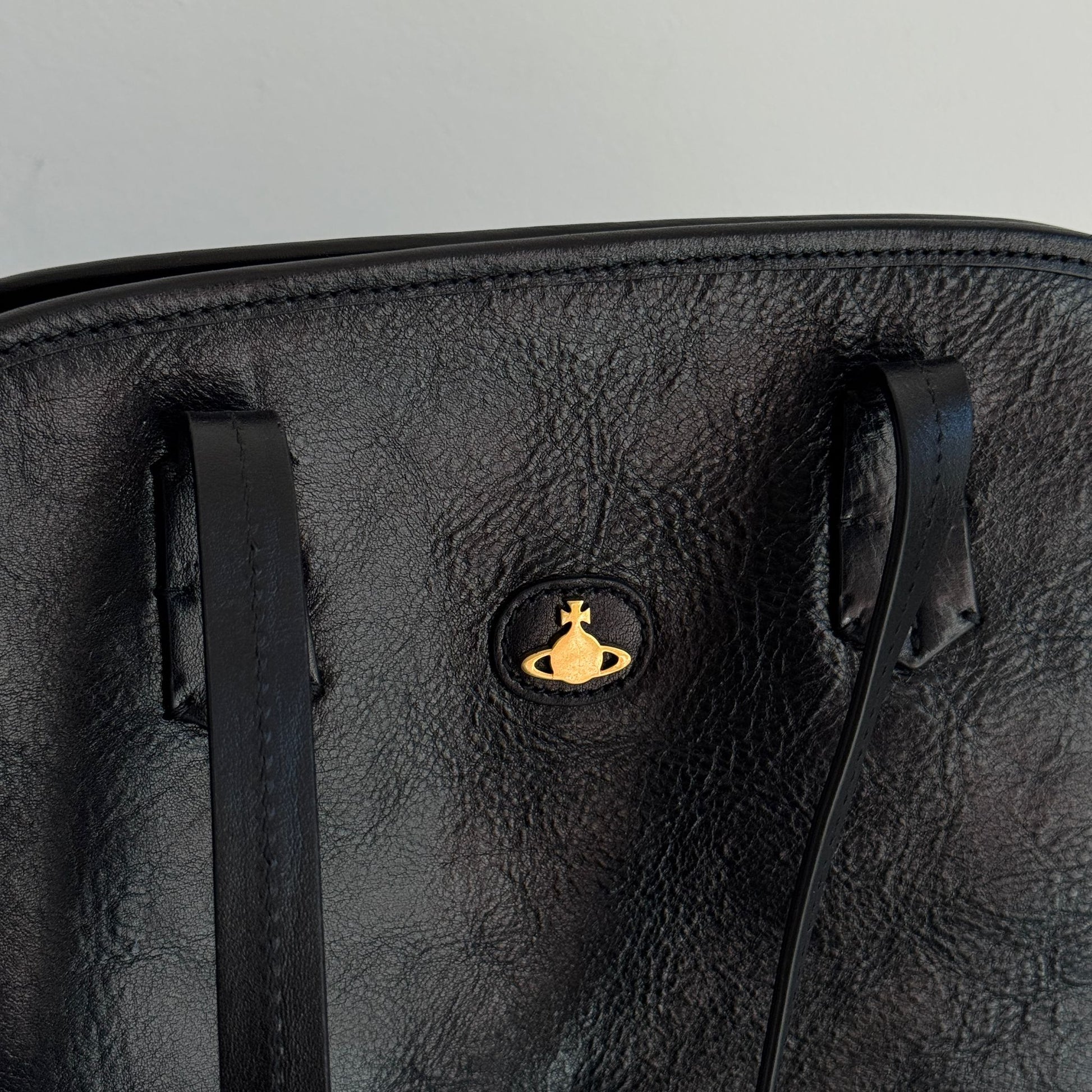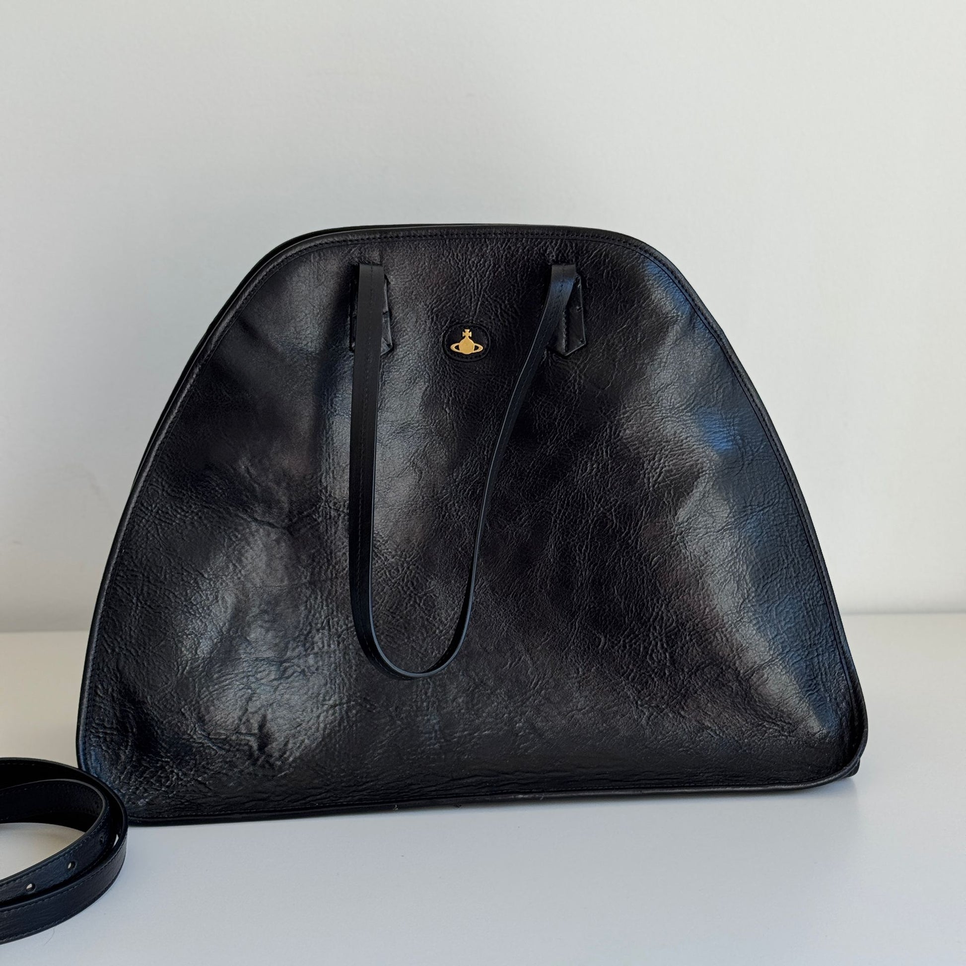 Bellissima borsa Vivienne Westwood modello Yasmina Large in VERA pelle nera effetto vintage, con hardware oro. Si indossa a spalla e a tracolla. La tracolla è rimovibile e regolabile.